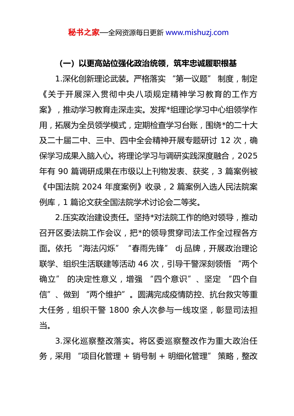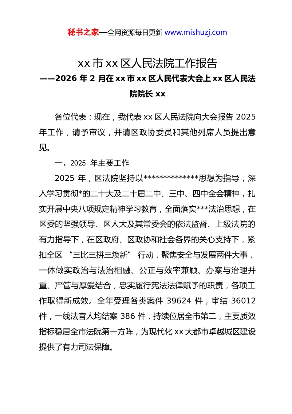 秘书之家—全网资源每日更新 www.mishuzj.comxx 市 xx 区人民法院工作报告——2026 年 2 月在 xx 市 xx 区人民代表大会上 xx 区人民法院院长 xx各位代表:现在,我代表 xx 区人民法院向大会报告 2025年工作,请予审议,并请区政协委员和其他列席人员提出意见。一、2025 年主要工作2025 年,区法院坚持以**************思想为指导,深入学习贯彻*的二十大及二十届二中、三中、四中全会精神,扎实开展中央八项规定精神学习教育,全面落实***法治思想,在区委的坚强领导、区人大及其常委会的依法监督、上级法院的有力指导下,在区政府、区政协和社会各界的关心支持下,紧扣全区 “三比三拼三焕新” 行动,聚焦安全与发展两件大事,一体做实政治与法治相融、公正与效率兼顾、办案与治理并重、严管与厚爱结合,忠实履行宪法法律赋予的职责,各项工作取得新成效。全年受理各类案件 39624 件,审结 36012件,一线法官人均结案 386 件,持续位居全市第二,主要质效指标稳居全市法院第一方阵,为现代化 xx 大都市卓越城区建设提供了有力司法保障。秘书之家—全网资源每日更新 www.mishuzj.com(一)以更高站位强化政治统领,筑牢忠诚履职根基1.深化创新理论武装。严格落实 “第一议题” 制度,制定《关于开展深入贯彻中央八项规定精神学习教育的工作方案》,推动学习教育走深走实。发挥*组理论学习中心组领学作用,拓展为全员领学模式,定期检查学习台账,围绕*的二十大及二十届二中、三中、四中全会精神开展专题研讨 12 次,确保学习成果入脑入心。将理论学习与调研实践深度融合,2025年有 90 篇调研成果在市级以上刊物发表、获奖,3 篇案例被《中国法院 2024 年度案例》收录,2 篇案例入选人民法院案例库,1 篇论文获全国法院学术讨论会二等奖。2.压实政治建设责任。坚持*对法院工作的绝对领导,推动召开区委法院工作会议,把*的领导贯穿司法工作全过程各方面。依托 “海法闪烁”“春雨先锋” dj 品牌,开展政治理论联学、组织生活联建等活动 46 次,引导干警深刻领悟 “两个确立” 的决定性意义,增强 “四个意识”、坚定 “四个自信”、做到 “两个维护”。圆满完成疫情防控、抗台救灾等重大任务,组织干警 1800 余人次参与一线攻坚,彰显司法担当。3.深化巡察整改落实。将区委巡察整改作为重大政治任务,采用 “项目化管理 + 销号制 + 明细化管理” 策略,整改秘书之家—全网资源每日更新 www.mishuzj.com完成各类问题 23 项,清退款项 1000 元,建立健全制度 6项。运用 “第一种形态” 处理 3 人,其中批评教育 2 人、谈话提醒 1 人,以严实举措筑牢政治忠诚、堵塞制度漏洞。(二)以更实举措护航高质量发展,彰显司法服务担当1.精准保障重大战略实施。围绕 xx 西枢纽、机场四期等重大工程项目,组建法治服务 “智囊团”,提前介入项目程序设定、安置政策制定等环节,建立 “一对一” 司法保障联络机制。选派法官入驻征迁现场提供法律咨询 36 场次,化解涉地铁八号线商铺租户集体征迁等纠纷 28 件,助力项目顺利推进。服务乡村振兴战略,望春法庭创新巡回审判模式,将 94岁郭奶奶赡养纠纷案庭审搬进乡村,借助乡贤调解力量促成 5名子女达成赡养协议,相关案例入选全市 “枫桥式人民法庭”建设典型案例。2.持续优化法治化营商环境。出台《全力护航民营经济高质量发展的二十条措施》,深化 “民营企业司法服务联络站”建设,为 70 余家民营企业和商会代表解读涉企政策、提供法律风险防范建议。审结涉企案件 8563 件,执行到位金额12.87 亿元,通过 “活封活扣” 等善意执行措施,为多家暂时困难企业盘活资产、修复信用。深化执行 “一件事” 改革,联合公安、不动产中心、金融机构等建立协同机制,查封房产秘书之家—全网资源每日更新 www.mishuzj.com240 处,实现薪资账户在线协查、资金定额冻结等功能,执行到位率、执行完毕率同比提升 15% 以上。3.加强知识产权协同保护。联合区检察院、公安分局、市场监管局签署合作框架协议,共建知识产权协同保护机制。审结知识产权案件 517...