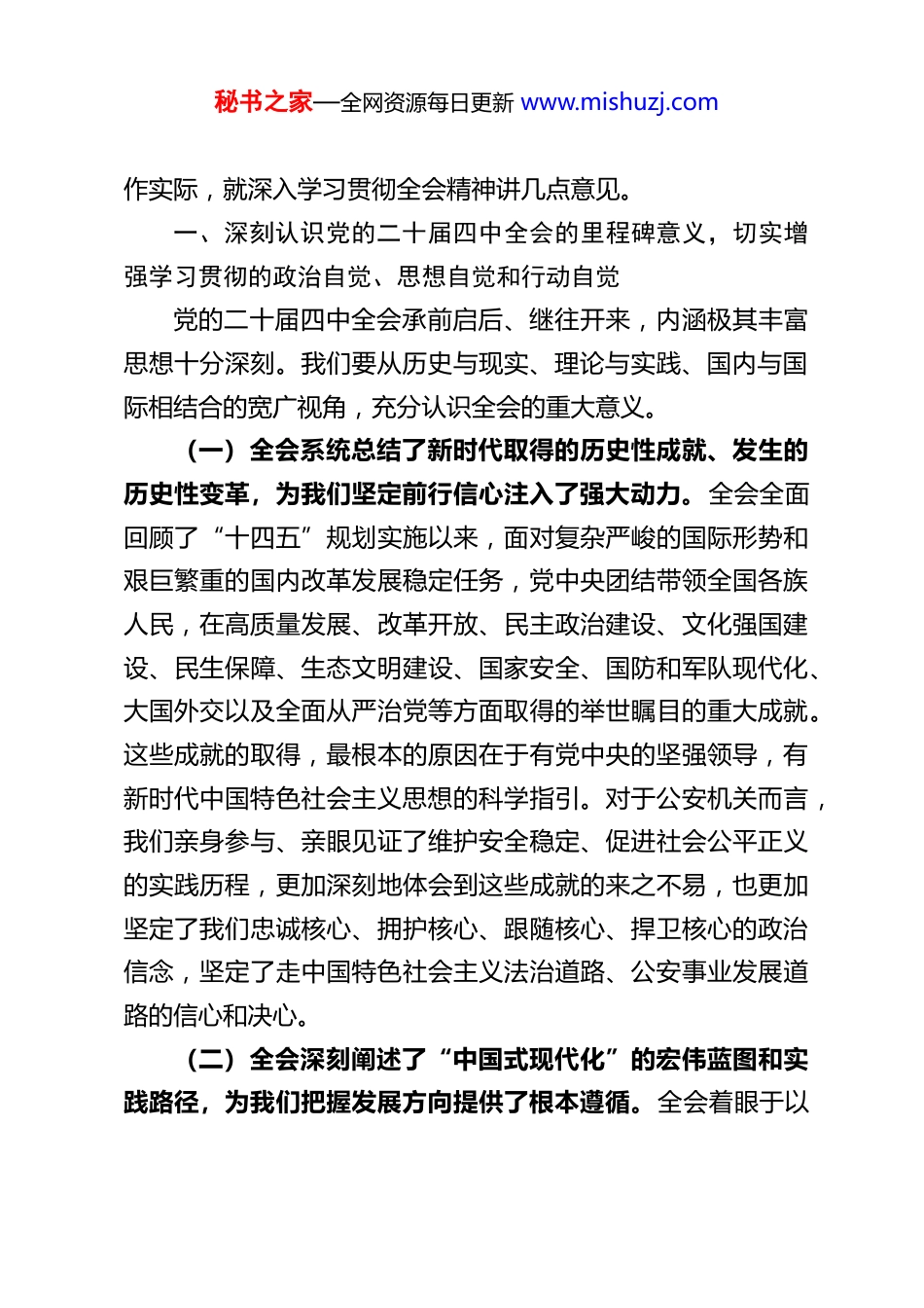 秘书之家—全网资源每日更新 www.mishuzj.comXX 市公安局局长关于党的二十届四中全会精神的宣讲稿同志们:根据市委统一部署安排,今天,我们在这里举行全市公安机关学习贯彻党的二十届四中全会精神专题宣讲报告会。主要目的是引导全市公安民警、辅警进一步深刻领会、全面把握党的二十届四中全会的重大意义、精神实质和核心要义,切实把思想和行动统一到党中央的决策部署上来,统一到省委、市委的工作要求上来,凝聚起奋进新征程、建功新时代的磅礴力量,奋力推动 XX 公安工作高质量发展,为谱写中国式现代化 XX 新篇章保驾护航。党的二十届四中全会,是在我国迈上全面建设社会主义现代化国家新征程、向第二个百年奋斗目标进军的关键时刻召开的一次十分重要的会议。全会系统总结了党和国家事业取得的新的重大成就,深刻阐述了新时代坚持和发展中国特色社会主义的一系列重大理论和实践问题,就未来一个时期党和国家事业发展作出了战略部署,对于全党全国各族人民统一思想、坚定信心,朝着实现中华民族伟大复兴的宏伟目标继续前进,具有重大而深远的意义。认真学习、广泛宣传、全面贯彻党的二十届四中全会精神,是当前和今后一个时期全市公安机关的首要政治任务。下面,我结合自己的学习思考,联系 XX 公安工秘书之家—全网资源每日更新 www.mishuzj.com作实际,就深入学习贯彻全会精神讲几点意见。一、深刻认识党的二十届四中全会的里程碑意义,切实增强学习贯彻的政治自觉、思想自觉和行动自觉党的二十届四中全会承前启后、继往开来,内涵极其丰富思想十分深刻。我们要从历史与现实、理论与实践、国内与国际相结合的宽广视角,充分认识全会的重大意义。(一)全会系统总结了新时代取得的历史性成就、发生的历史性变革,为我们坚定前行信心注入了强大动力。全会全面回顾了“十四五”规划实施以来,面对复杂严峻的国际形势和艰巨繁重的国内改革发展稳定任务,党中央团结带领全国各族人民,在高质量发展、改革开放、民主政治建设、文化强国建设、民生保障、生态文明建设、国家安全、国防和军队现代化、大国外交以及全面从严治党等方面取得的举世瞩目的重大成就。这些成就的取得,最根本的原因在于有党中央的坚强领导,有新时代中国特色社会主义思想的科学指引。对于公安机关而言,我们亲身参与、亲眼见证了维护安全稳定、促进社会公平正义的实践历程,更加深刻地体会到这些成就的来之不易,也更加坚定了我们忠诚核心、拥护核心、跟随核心、捍卫核心的政治信念,坚定了走中国特色社会主义法治道路、公安事业发展道路的信心和决心。(二)全会深刻阐述了“中国式现代化”的宏伟蓝图和实践路径,为我们把握发展方向提供了根本遵循。全会着眼于以秘书之家—全网资源每日更新 www.mishuzj.com中国式现代化全面推进中华民族伟大复兴,对“十五五”时期经济社会发展的重大意义、总体要求、战略任务和重大举措进行了系统谋划。深刻理解中国式现代化的中国特色、本质要求和必须牢牢把握的重大原则,对于我们公安机关准确把握在服务保障中国式现代化这个最大政治中的职责定位至关重要。公安工作必须自觉融入党和国家事业发展大局,紧紧围绕推进中国式现代化来谋划、来推进,确保公安工作始终沿着正确方向前进。(三)全会对坚持和加强党的全面领导、推进国家治理体系和治理能力现代化作出新部署,为我们提升履职能力指明了前进方向。坚持党的全面领导是做好党和国家各项工作的根本保证。全会就加强党的集中统一领导,完善党的领导制度体系提出了明确要求。同时,围绕推进国家治理体系和治理能力现代化,特别是在法治建设、维护国家安全和社会稳定、完善社会治理体系等方面作出了一系列战略部署。这直接关系到公安工作的长远发展,为我们深化警务体制机制改革、提升执法办案水平、增强社会治安掌控能力、建设更高水平的平安 XX 法治 XX 提供了行动指南。我们必须深刻领会这些部署要求,将其转化为推动 XX 公安工作现代化的具体思路和务实举措。(四)全会对坚定不移推进全面从严治党提出新要求,为我们锻造过硬公安铁军明确了目标任务。全会强调要持之以恒推进全面从严治党,深入...