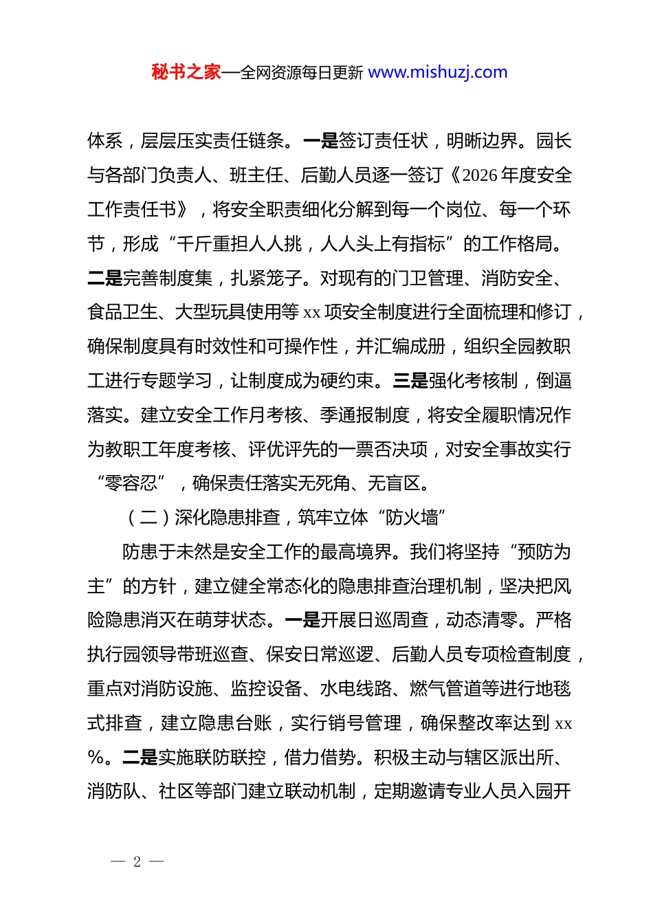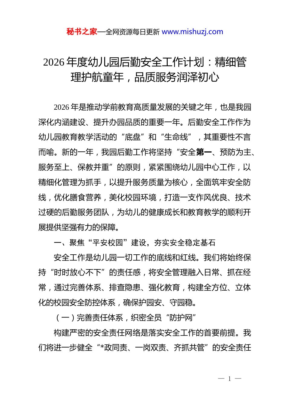 秘书之家—全网资源每日更新 www.mishuzj.com2026 年度幼儿园后勤安全工作计划:精细管理护航童年,品质服务润泽初心2026 年是推动学前教育高质量发展的关键之年,也是我园深化内涵建设、提升办园品质的重要一年。后勤安全工作作为幼儿园教育教学活动的“底盘”和“生命线”,其重要性不言而喻。新的一年,我园后勤工作将坚持“安全第一、预防为主、服务至上、保教并重”的原则,紧紧围绕幼儿园中心工作,以精细化管理为抓手,以提升服务质量为核心,全面筑牢安全防线,优化膳食营养,美化校园环境,打造一支作风优良、技术过硬的后勤服务团队,为幼儿的健康成长和教育教学的顺利开展提供坚强有力的保障。一、聚焦“平安校园”建设,夯实安全稳定基石安全工作是幼儿园一切工作的底线和红线。我们将始终保持“时时放心不下”的责任感,将安全管理融入日常、抓在经常,通过完善体系、排查隐患、强化教育,构建全方位、立体化的校园安全防控体系,确保护园安、守园稳。(一)完善责任体系,织密全员“防护网”构建严密的安全责任网络是落实安全工作的首要前提。我们将进一步健全“*政同责、一岗双责、齐抓共管”的安全责任— 1 —秘书之家—全网资源每日更新 www.mishuzj.com体系,层层压实责任链条。一是签订责任状,明晰边界。园长与各部门负责人、班主任、后勤人员逐一签订《2026 年度安全工作责任书》,将安全职责细化分解到每一个岗位、每一个环节,形成“千斤重担人人挑,人人头上有指标”的工作格局。二是完善制度集,扎紧笼子。对现有的门卫管理、消防安全、食品卫生、大型玩具使用等 xx 项安全制度进行全面梳理和修订,确保制度具有时效性和可操作性,并汇编成册,组织全园教职工进行专题学习,让制度成为硬约束。三是强化考核制,倒逼落实。建立安全工作月考核、季通报制度,将安全履职情况作为教职工年度考核、评优评先的一票否决项,对安全事故实行“零容忍”,确保责任落实无死角、无盲区。(二)深化隐患排查,筑牢立体“防火墙”防患于未然是安全工作的最高境界。我们将坚持“预防为主”的方针,建立健全常态化的隐患排查治理机制,坚决把风险隐患消灭在萌芽状态。一是开展日巡周查,动态清零。严格执行园领导带班巡查、保安日常巡逻、后勤人员专项检查制度,重点对消防设施、监控设备、水电线路、燃气管道等进行地毯式排查,建立隐患台账,实行销号管理,确保整改率达到 xx%。二是实施联防联控,借力借势。积极主动与辖区派出所、消防队、社区等部门建立联动机制,定期邀请专业人员入园开— 2 —秘书之家—全网资源每日更新 www.mishuzj.com展“体检式”排查,重点整治校园周边的交通秩序和治安环境,净化育人空间。三是升级技防设施,智慧赋能。计划投入 xx 万元,对校园监控系统进行升级改造,实现重点区域监控全覆盖、无死角,并接入公安联网报警系统,提升校园安防的智能化水平,为校园安全加装一把“科技锁”。(三)强化宣教演练,上好生命“必修课”提升师幼的安全意识和自救互救能力是校园安全的根本保障。我们将把安全教育纳入幼儿园教育教学计划,做到计划、教材、课时、师资“四落实”。一是丰富教育形式,入脑入心。根据幼儿年龄特点,通过绘本故事、情景剧表演、安全游戏等生动活泼的形式,开展防溺水、防拐骗、防欺凌、交通安全等zt 教育活动,每周安排 xx 节安全教育课,让安全知识在幼儿心中生根发芽。二是实战应急演练,临危不乱。制定科学详实的应急疏散演练方案,每学期至少组织 xx 次全园性的消防、防震等应急疏散演练,重点演练突发情况下的指挥协调、疏散路线和人员配合,提高师幼在紧急情况下的应变能力和逃生技能。三是家园携手共育,同频共振。利用家长会、微信公众号、家园联系栏等平台,定期向家长推送安全提示和育儿知识,开展“小手拉大手”安全宣传活动,增强家长的安全监护责任意识,形成家园共筑平安的强大合力。— 3 —秘书之家—全网资源每日更新 www.mishuzj.com二、聚焦“健康膳食”提质,守护幼儿舌尖安全膳食管理直接关系到幼儿的生长发育和身体健康,是家长和社会关注的焦点。我们将严格遵循科学营养...