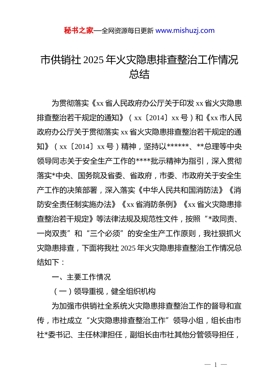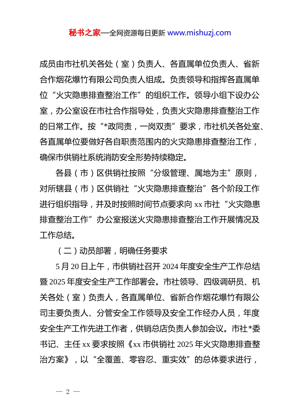 秘书之家—全网资源每日更新 www.mishuzj.com市供销社 2025 年火灾隐患排查整治工作情况总结为贯彻落实《xx 省人民政府办公厅关于印发 xx 省火灾隐患排查整治若干规定的通知》(xx〔2014〕xx 号)和《xx 市人民政府办公厅关于贯彻落实 xx 省火灾隐患排查整治若干规定的通知》(xx〔2014〕xx 号)精神,坚持以******、**总理等中央领导同志关于安全生产工作的****批示精神为指引,深入贯彻落实*中央、国务院及省委、省政府,市委、市政府关于安全生产工作的决策部署,深入落实《中华人民共和国消防法》《消防安全责任制实施办法》《xx 省消防条例》《xx 省火灾隐患排查整治若干规定》等法律法规及规范性文件,按照“*政同责、一岗双责”和“三个必须”的安全生产工作原则,我社狠抓火灾隐患排查,下面将我社 2025 年火灾隐患排查整治工作情况总结如下:一、主要工作情况(一)领导重视,健全组织机构为加强市供销社全系统火灾隐患排查整治工作的督导和宣传,市社成立“火灾隐患排查整治工作”领导小组,组长由市社*委书记、主任林津担任,副组长由市社其他分管领导担任,— 1 —秘书之家—全网资源每日更新 www.mishuzj.com成员由市社机关各处(室)负责人、各直属单位负责人、省新合作烟花爆竹有限公司负责人组成。负责领导和指挥各直属单位“火灾隐患排查整治工作”的组织工作。领导小组下设办公室,办公室设在市社合作指导处,负责火灾隐患排查整治工作的日常工作。按“*政同责,一岗双责”要求,市社机关各处室、各直属单位要做好各自职责范围内的火灾隐患排查整治工作,确保市供销社系统消防安全形势持续稳定。各县(市)区供销社按照“分级管理、属地为主”原则,对所辖县(市)区供销社“火灾隐患排查整治”各个阶段工作进行组织指导,并及时按照时间节点要求向 xx 市社“火灾隐患排查整治工作”办公室报送火灾隐患排查整治工作开展情况及工作总结。(二)动员部署,明确任务要求5 月 20 日上午,市供销社召开 2024 年度安全生产工作总结暨 2025 年度安全生产工作部署会。市社领导、四级调研员、机关各处(室)负责人,各直属单位、省新合作烟花爆竹有限公司主要负责人、分管安全工作领导及安全工作经办人员,年度安全生产工作先进工作者,供销总店负责人参加会议。市社*委书记、主任 xx 要求按照《xx 市供销社 2025 年火灾隐患排查整治方案》,以“全覆盖、零容忍、重实效”的总体要求进行,— 2 —秘书之家—全网资源每日更新 www.mishuzj.com明确以易燃易爆物品储存、经营场所以及人员密集场所为火灾隐患排查整治的重点对象。会上,市社*委书记、主任林津对全系统 2024 年安全生产工作给予了肯定,并对做好、做实 2025 年安全生产工作提出了具体要求。他强调,一要提高政治站位,切实增强做好安全生产工作的责任感和紧迫感。二要聚焦重点领域,全面提升安全生产管理水平。三要强化组织领导,凝聚齐抓共管的工作合力。(三)抓好教育,提高安全素质今年 6 月是第 24 个全国“安全生产月”,各直属单位紧紧围绕“人人讲安全、个个会应急——查找身边安全隐患”活动主题,开展了形式多样、贴近现实、贴近生产、贴近群众的“安全生产月”活动。6 月 16 日是全国安全宣传咨询日。组织市社系统 28 人参加我市在 XX 区 XX 广场举办的“安全宣传咨询日”主会场活动,“安全生产月”活动期间,全系统共组织各类安全知识讲座、安全技能培训 4 场 100 人次参与,组织系统 81 人次观看《安全的名义》,帮助广大干部职工牢固树立安全意识、红线意识,各直属单位张贴安全生产宣传标语、悬挂横幅 48 条,通过 led屏、宣传橱窗展示等载体宣传安全生产知识,强化安全生产意识,营造浓厚的安全生产氛围,提升干部职工综合安全素质。— 3 —秘书之家—全网资源每日更新 www.mishuzj.com部署开展 2025 年消防宣传月活动,组织安全隐患排查 43次,共检查企业网点累计 213 家次,发现 11 处安全隐患,现场整改 11 处。组织消防安全知识理论辅导 6 次,参加人数 122 人次。组织疏散逃生演练 6 次,参训人数 104...