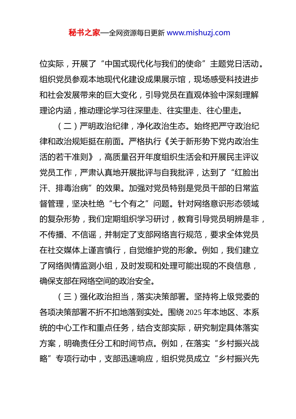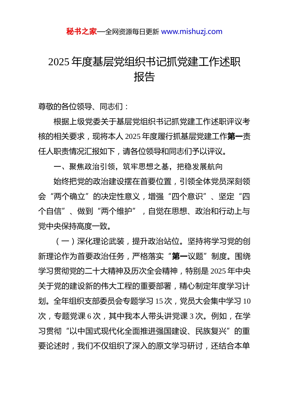 秘书之家—全网资源每日更新 www.mishuzj.com2025 年度基层党组织书记抓党建工作述职报告 尊敬的各位领导、同志们:根据上级党委关于基层党组织书记抓党建工作述职评议考核的相关要求,现将本人 2025 年度履行抓基层党建工作第一责任人职责情况汇报如下,请各位领导和同志们予以评议。一、聚焦政治引领,筑牢思想之基,把稳发展航向始终把党的政治建设摆在首要位置,引领全体党员深刻领会“两个确立”的决定性意义,增强“四个意识”、坚定“四个自信”、做到“两个维护”,自觉在思想、政治和行动上与党中央保持高度一致。(一)深化理论武装,提升政治站位。坚持将学习党的创新理论作为首要政治任务,严格落实“第一议题”制度。围绕学习贯彻党的二十大精神及历次全会精神,特别是 2025 年中央关于党的建设新的伟大工程的重要部署,精心制定年度学习计划。全年组织支部委员会专题学习 15 次,党员大会集中学习 10次,专题党课 6 次,其中我本人带头讲党课 3 次。例如,在学习贯彻“以中国式现代化全面推进强国建设、民族复兴”的重要论述时,我们不仅组织了深入的原文学习研讨,还结合本单秘书之家—全网资源每日更新 www.mishuzj.com位实际,开展了“中国式现代化与我们的使命”主题党日活动。组织党员参观本地现代化建设成果展示馆,现场感受科技进步和社会发展带来的巨大变化,引导党员在直观体验中深刻理解理论内涵,推动理论学习往深里走、往实里走、往心里走。(二)严明政治纪律,净化政治生态。始终把严守政治纪律和政治规矩挺在前面。严格执行《关于新形势下党内政治生活的若干准则》,高质量召开年度组织生活会和开展民主评议党员工作,严肃认真地开展批评与自我批评,达到了“红脸出汗、排毒治病”的效果。加强对党员特别是党员干部的日常监督管理,坚决杜绝“七个有之”问题。针对网络意识形态领域的复杂形势,我们定期组织学习研讨,教育引导党员明辨是非,不传播、不信谣,并制定了支部网络言行规范,要求全体党员在社交媒体上谨言慎行,自觉维护党的形象。例如,我们建立了网络舆情监测小组,及时发现和处理可能出现的不良信息,确保支部在网络空间的政治安全。(三)强化政治担当,落实决策部署。坚持将上级党委的各项决策部署不折不扣地落到实处。围绕 2025 年本地区、本系统的中心工作和重点任务,结合支部实际,研究制定具体落实方案,明确责任分工和时间节点。例如,在落实“乡村振兴战略”专项行动中,支部迅速响应,组织党员成立“乡村振兴先秘书之家—全网资源每日更新 www.mishuzj.com锋队”,开展了一系列帮扶活动。我们深入乡村调研,了解村民的需求和困难,为乡村发展出谋划策。组织党员与困难村民结成帮扶对子,帮助他们发展特色产业,增加收入。通过这些实际行动,我们为乡村振兴贡献了力量,展现了党组织的战斗堡垒作用,相关做法得到了当地村民的好评和上级的肯定。二、聚焦强基固本,夯实组织之基,提升支部质量牢固树立大抓基层的鲜明导向,以提升组织力为重点,突出政治功能,着力把党支部建设成为坚强战斗堡垒。(一)规范组织生活,增强生机活力。严格执行“三会一课”、主题党日、组织生活会、民主评议党员、谈心谈话等基本制度。积极探索创新组织生活形式,增强吸引力和实效性。全年共开展主题党日活动 14 次,其中创新形式活动占 60%以上,党员参与率达到 96%以上。例如,我们联合其他兄弟单位党支部开展了“党建共建、携手同行”主题党日活动,共同参观了高科技企业的研发中心,了解前沿科技的发展动态。通过交流学习,我们不仅拓宽了党员的视野,还促进了支部之间的合作与交流。此外,我们还利用线上平台开展“微党课”分享,鼓励普通党员结合岗位实际讲认识、谈体会,激发了党员的学习积极性和参与热情。(二)建强党员队伍,激发先锋作用。严格按照“控制总秘书之家—全网资源每日更新 www.mishuzj.com量、优化结构、提高质量、发挥作用”的总要求做好党员发展工作。2025 年新发展预备党员 3 名,转正 2 名。加强党员教育管理,组织开展“立足岗位作贡献”活动,设立党员责任区、示范岗,引导党员在关键...