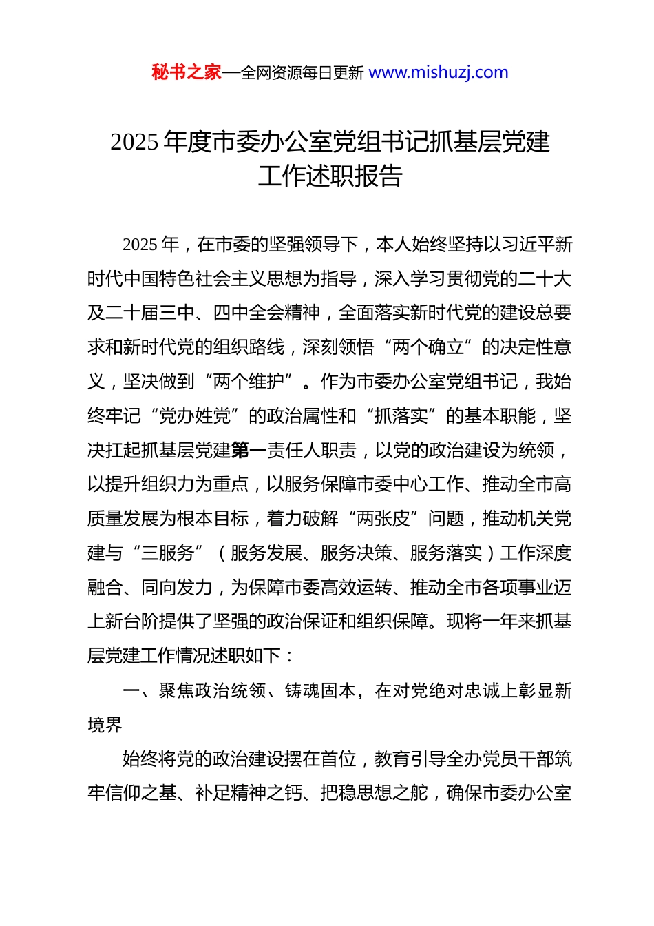 秘书之家—全网资源每日更新 www.mishuzj.com2025 年度市委办公室党组书记抓基层党建工作述职报告 2025 年,在市委的坚强领导下,本人始终坚持以习近平新时代中国特色社会主义思想为指导,深入学习贯彻党的二十大及二十届三中、四中全会精神,全面落实新时代党的建设总要求和新时代党的组织路线,深刻领悟“两个确立”的决定性意义,坚决做到“两个维护”。作为市委办公室党组书记,我始终牢记“党办姓党”的政治属性和“抓落实”的基本职能,坚决扛起抓基层党建第一责任人职责,以党的政治建设为统领,以提升组织力为重点,以服务保障市委中心工作、推动全市高质量发展为根本目标,着力破解“两张皮”问题,推动机关党建与“三服务”(服务发展、服务决策、服务落实)工作深度融合、同向发力,为保障市委高效运转、推动全市各项事业迈上新台阶提供了坚强的政治保证和组织保障。现将一年来抓基层党建工作情况述职如下:一、聚焦政治统领、铸魂固本,在对党绝对忠诚上彰显新境界始终将党的政治建设摆在首位,教育引导全办党员干部筑牢信仰之基、补足精神之钙、把稳思想之舵,确保市委办公室秘书之家—全网资源每日更新 www.mishuzj.com各项工作始终沿着正确政治方向坚定前行。(一)强化创新理论武装,筑牢思想政治根基。坚持把学习贯彻习近平新时代中国特色社会主义思想作为首要政治任务和贯穿各项工作的主线。一是严格执行“第一议题”制度。对习近平总书记最新重要讲话、重要指示批示精神和党中央作出的新决策、新部署,均在党组会、室务会上第一时间传达学习、研究贯彻措施,全年组织“第一议题”学习 38 次,确保党的创新理论最新成果及时入脑入心。二是构建完善“五学联动”体系。持续深化“党组理论学习中心组引领学、机关党委督学促学、党支部常态研学、青年理论学习小组创新践学、党员干部个人沉浸自学”的学习机制。全年主持党组理论学习中心组专题学习研讨 22 次,其中围绕习近平总书记关于党的建设、中国式现代化、新质生产力等重要论述开展深度研讨 9 次。三是拓展学习载体提升实效。精心打造“党办先锋讲堂”,邀请专家学者、先进典型授课 12 期;举办“青春心向党·建功新时代”青年干部读书沙龙、理论征文、知识竞赛等活动 15 场;组织党员干部赴红色教育基地开展现场教学 6 批次,推动理论学习从“纸面”落到“地面”、从“入眼”到“入心”,切实提升全办党员干部的政治判断力、政治领悟力、政治执行力。(二)严明政治纪律规矩,涵养清朗政治生态。始终将政秘书之家—全网资源每日更新 www.mishuzj.com治纪律和政治规矩挺在前面,教育引导党员干部做政治上的“明白人”“老实人”。一是常态化开展纪律教育。将党章党规党纪学习纳入支部学习必修内容,通过观看警示教育片、通报典型案例、开展廉政谈话等方式,深刻剖析“七个有之”危害,引导党员干部时刻绷紧政治纪律这根弦,自觉做到“五个必须”。二是坚决维护政令畅通。严格落实重大事项请示报告制度,确保市委各项决策部署在办公室不折不扣得到贯彻执行。在文稿审核、文件流转、信息报送、督查检查、机要保密等各个环节,始终把政治标准放在第一位,严把政治关、政策关、文字关,确保各项工作体现党的意志、贯彻市委要求。三是严肃党内政治生活。严格执行民主集中制,凡属“三重一大”事项均经党组集体研究决定。高标准召开年度民主生活会和组织生活会,带头开展批评与自我批评,引导党员干部在严肃认真的政治生活中锤炼党性、净化思想。(三)扛稳扛牢政治责任,精准服务发展大局。自觉将办公室工作置于全市发展“一盘棋”中思考谋划,确保党建工作与中心任务同轴运转、同向推进。一是精准对标市委部署。围绕市委年度工作要点、全会确定的重点任务以及市委主要领导关注的重大课题,牵头研究制定《市委办公室党建引领服务保障全市高质量发展行动方案》,明确党建服务大局的路径和载秘书之家—全网资源每日更新 www.mishuzj.com体。二是深度融入重大任务。在服务保障市委全会、市党代会、重大项目建设推进会、重要招商引资活动以及应对重大突发事件等急难险重任务中,迅速启动“党建+重大...
