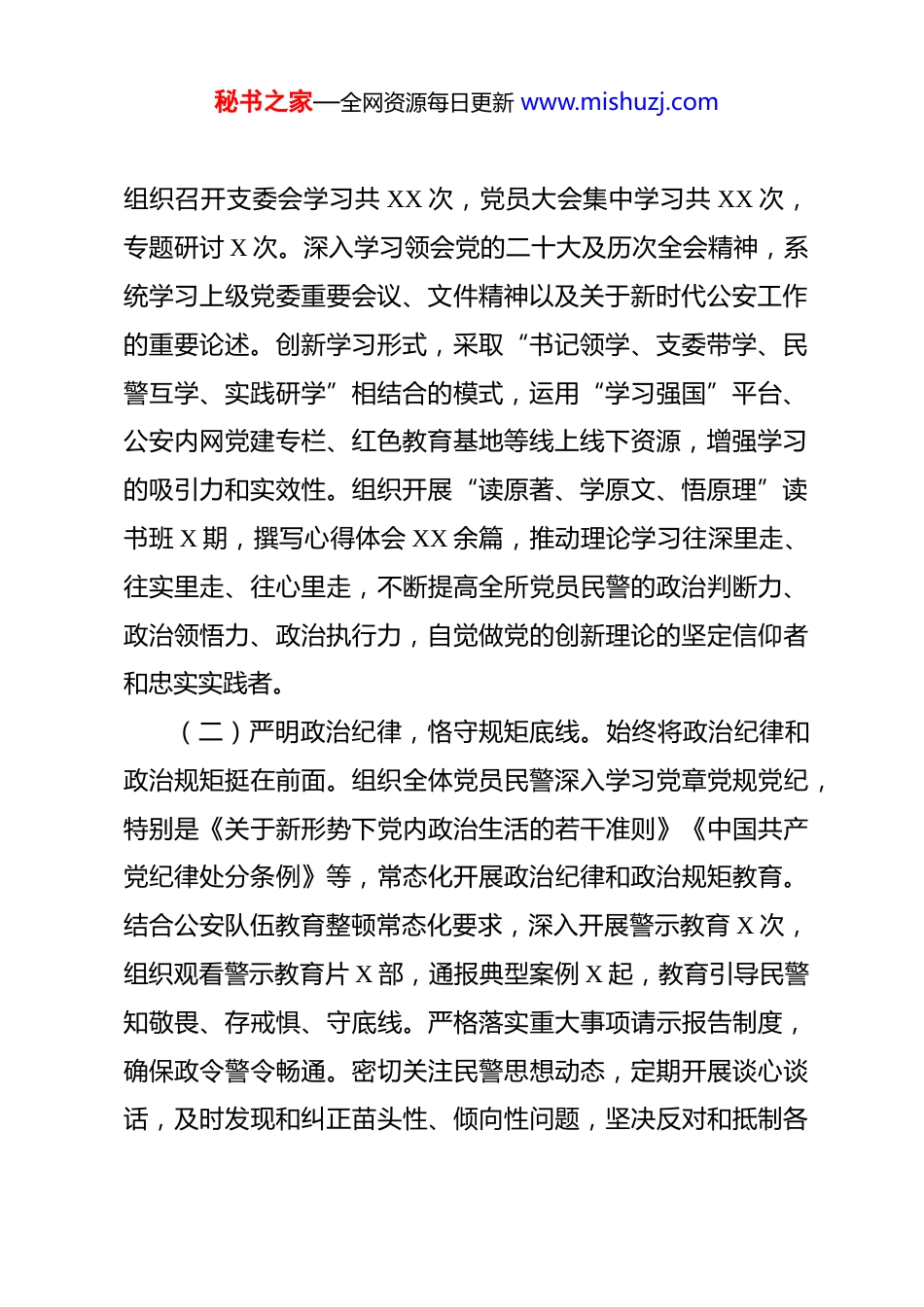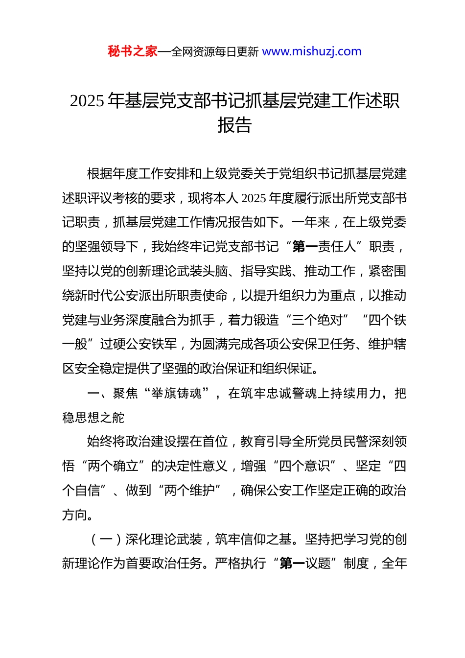 秘书之家—全网资源每日更新 www.mishuzj.com2025 年基层党支部书记抓基层党建工作述职报告 根据年度工作安排和上级党委关于党组织书记抓基层党建述职评议考核的要求,现将本人 2025 年度履行派出所党支部书记职责,抓基层党建工作情况报告如下。一年来,在上级党委的坚强领导下,我始终牢记党支部书记“第一责任人”职责,坚持以党的创新理论武装头脑、指导实践、推动工作,紧密围绕新时代公安派出所职责使命,以提升组织力为重点,以推动党建与业务深度融合为抓手,着力锻造“三个绝对”“四个铁一般”过硬公安铁军,为圆满完成各项公安保卫任务、维护辖区安全稳定提供了坚强的政治保证和组织保证。一、聚焦“举旗铸魂”,在筑牢忠诚警魂上持续用力,把稳思想之舵始终将政治建设摆在首位,教育引导全所党员民警深刻领悟“两个确立”的决定性意义,增强“四个意识”、坚定“四个自信”、做到“两个维护”,确保公安工作坚定正确的政治方向。(一)深化理论武装,筑牢信仰之基。坚持把学习党的创新理论作为首要政治任务。严格执行“第一议题”制度,全年秘书之家—全网资源每日更新 www.mishuzj.com组织召开支委会学习共 XX 次,党员大会集中学习共 XX 次,专题研讨 X 次。深入学习领会党的二十大及历次全会精神,系统学习上级党委重要会议、文件精神以及关于新时代公安工作的重要论述。创新学习形式,采取“书记领学、支委带学、民警互学、实践研学”相结合的模式,运用“学习强国”平台、公安内网党建专栏、红色教育基地等线上线下资源,增强学习的吸引力和实效性。组织开展“读原著、学原文、悟原理”读书班 X 期,撰写心得体会 XX 余篇,推动理论学习往深里走、往实里走、往心里走,不断提高全所党员民警的政治判断力、政治领悟力、政治执行力,自觉做党的创新理论的坚定信仰者和忠实实践者。(二)严明政治纪律,恪守规矩底线。始终将政治纪律和政治规矩挺在前面。组织全体党员民警深入学习党章党规党纪,特别是《关于新形势下党内政治生活的若干准则》《中国共产党纪律处分条例》等,常态化开展政治纪律和政治规矩教育。结合公安队伍教育整顿常态化要求,深入开展警示教育 X 次,组织观看警示教育片 X 部,通报典型案例 X 起,教育引导民警知敬畏、存戒惧、守底线。严格落实重大事项请示报告制度,确保政令警令畅通。密切关注民警思想动态,定期开展谈心谈话,及时发现和纠正苗头性、倾向性问题,坚决反对和抵制各秘书之家—全网资源每日更新 www.mishuzj.com种错误思潮,确保队伍绝对忠诚、绝对纯洁、绝对可靠。(三)强化政治担当,压实主体责任。牢固树立“抓好党建是最大政绩”的理念,认真履行党支部书记抓党建第一责任人职责。年初牵头研究制定年度党建工作计划、责任清单,将党建工作与业务工作同谋划、同部署、同检查、同考核。全年主持召开支委会专题研究党建工作 XX 次,听取党建工作汇报X 次。严格落实意识形态工作责任制,定期分析研判意识形态领域风险,加强对派出所宣传阵地、网络言行的管理,牢牢掌握意识形态工作领导权。带头落实双重组织生活制度,以普通党员身份参加所在党小组活动,带头讲党课 X 次,带头开展批评与自我批评,为全所党员民警作出表率。二、聚力“强基固本”,在建强战斗堡垒上精准发力,夯实组织之根以提升党支部组织力为重点,深入推进党支部标准化规范化建设,着力把派出所党支部建设成为宣传党的主张、贯彻党的决定、领导基层治理、团结动员群众、推动改革发展的坚强战斗堡垒。(一)规范组织生活,淬炼党性修养。严格执行党的组织生活制度,不断增强党内政治生活的政治性、时代性、原则性、战斗性。高质量落实“三会一课”制度,突出政治学习和教育,秘书之家—全网资源每日更新 www.mishuzj.com突出党性锻炼,坚决防止表面化、形式化、娱乐化、庸俗化。全年召开党员大会 XX 次,支委会 XX 次,党小组会 XX 次,组织党课 X 次。认真组织召开年度组织生活会和开展民主评议党员工作,严肃认真开展批评和自我批评,达到“团结—批评—团结”的目的。规范开展主题党日活动,每月相对固定 1 天,...
