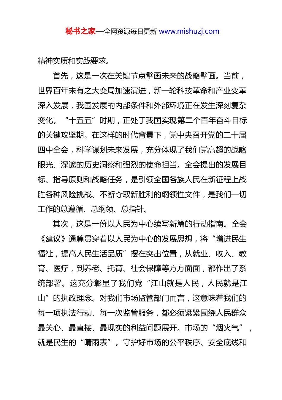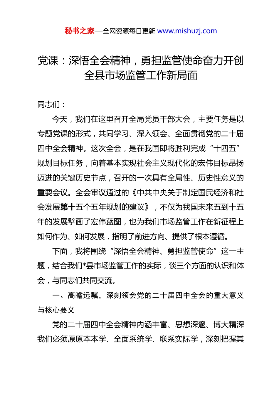 秘书之家—全网资源每日更新 www.mishuzj.com党课:深悟全会精神,勇担监管使命奋力开创全县市场监管工作新局面 同志们:今天,我们在这里召开全局党员干部大会,主要任务是以专题党课的形式,共同学习、深入领会、全面贯彻党的二十届四中全会精神。这次全会,是在我国即将胜利完成“十四五”规划目标任务,向着基本实现社会主义现代化的宏伟目标昂扬迈进的关键历史节点,召开的一次具有全局性、历史性意义的重要会议。全会审议通过的《中共中央关于制定国民经济和社会发展第十五个五年规划的建议》,不仅为我国未来五到十五年的发展擘画了宏伟蓝图,也为我们市场监管工作在新征程上如何作为、如何发展,指明了前进方向、提供了根本遵循。下面,我将围绕“深悟全会精神、勇担监管使命”这一主题,结合我们*县市场监管工作的实际,谈三个方面的认识和体会,与同志们共同交流。一、高瞻远瞩,深刻领会党的二十届四中全会的重大意义与核心要义党的二十届四中全会精神内涵丰富、思想深邃、博大精深我们必须原原本本学、全面系统学、联系实际学,深刻把握其秘书之家—全网资源每日更新 www.mishuzj.com精神实质和实践要求。首先,这是一次在关键节点擘画未来的战略擘画。当前,世界百年未有之大变局加速演进,新一轮科技革命和产业变革深入发展,我国发展的内部条件和外部环境正在发生深刻复杂变化。“十五五”时期,正处于我国实现第二个百年奋斗目标的关键攻坚期。在这样的时代背景下,党中央召开党的二十届四中全会,科学谋划未来发展,充分体现了我们党高超的战略眼光、深邃的历史洞察和强烈的使命担当。全会提出的发展目标、指导原则和战略任务,是引领全国各族人民在新征程上战胜各种风险挑战、不断夺取新胜利的纲领性文件,是我们一切工作的总遵循、总纲领、总指针。其次,这是一份以人民为中心续写新篇的行动指南。全会《建议》通篇贯穿着以人民为中心的发展思想,将“增进民生福祉,提高人民生活品质”摆在突出位置,从就业、收入、教育、医疗,到养老、托育、社会保障等方方面面,都作出了系统部署。这充分彰显了我们党“江山就是人民,人民就是江山”的执政理念。对我们市场监管部门而言,这意味着我们的每一项执法行动、每一次监管服务,都必须紧紧围绕人民群众最关心、最直接、最现实的利益问题展开。市场的“烟火气”,就是民生的“晴雨表”。守护好市场的公平秩序、安全底线和秘书之家—全网资源每日更新 www.mishuzj.com消费者的合法权益,就是我们践行以人民为中心的发展思想最直接、最生动的体现。再者,这是一套推动高质量发展构建新格局的科学方略。全会强调,必须把高质量发展作为新时代的硬道理,完整、准确、全面贯彻新发展理念,加快构建以国内大循环为主体、国内国际双循环相互促进的新发展格局。其中,建设全国统一大市场、打造市场化、法治化、国际化一流营商环境、强化知识产权保护、加强质量强国建设等一系列重大部署,都与市场监管工作息息相关,为我们明确了主攻方向和着力点。这要求我们必须跳出单纯的“监管”思维,将市场监管工作置于服务全县经济社会发展大局中去谋划和推进,以高水平监管促进高水平开放,以高效能治理激发高质量发展。二、聚焦主业,以全会精神统领新时代市场监管工作高质量发展学习贯彻全会精神,关键在行动,落脚在实干。我们必须坚持学用结合、以学促干,自觉将全会精神转化为谋划工作的思路、推动发展的举措、履职尽责的行动,奋力书写*县市场监管事业的新篇章。(一)坚守“人民至上”理念,筑牢消费者权益保护的“安全防线”秘书之家—全网资源每日更新 www.mishuzj.com全会《建议》强调要“强化消费者权益保护”。这是我们市场监管部门的天职。人民群众对美好生活的向往,体现在“吃得放心、穿得称心、用得安心”的每一个细节里。过去一年,我们全局上下付出了艰辛努力,也取得了显著成效。截至本月,我们累计处理各类投诉举报 3100 余件,为消费者挽回经济损失超过 150 万元,投诉按时办结率达到 98.5%。这组数据的背后,是我们每一位同志夜以继日的付出,是群众对我们信任的不断增强。但我们必须清醒地认识到,...
