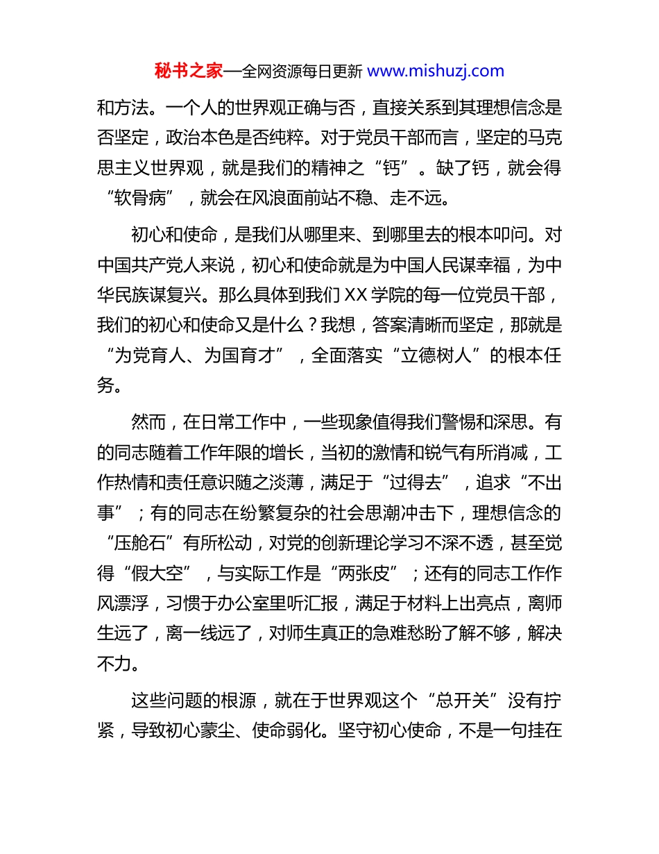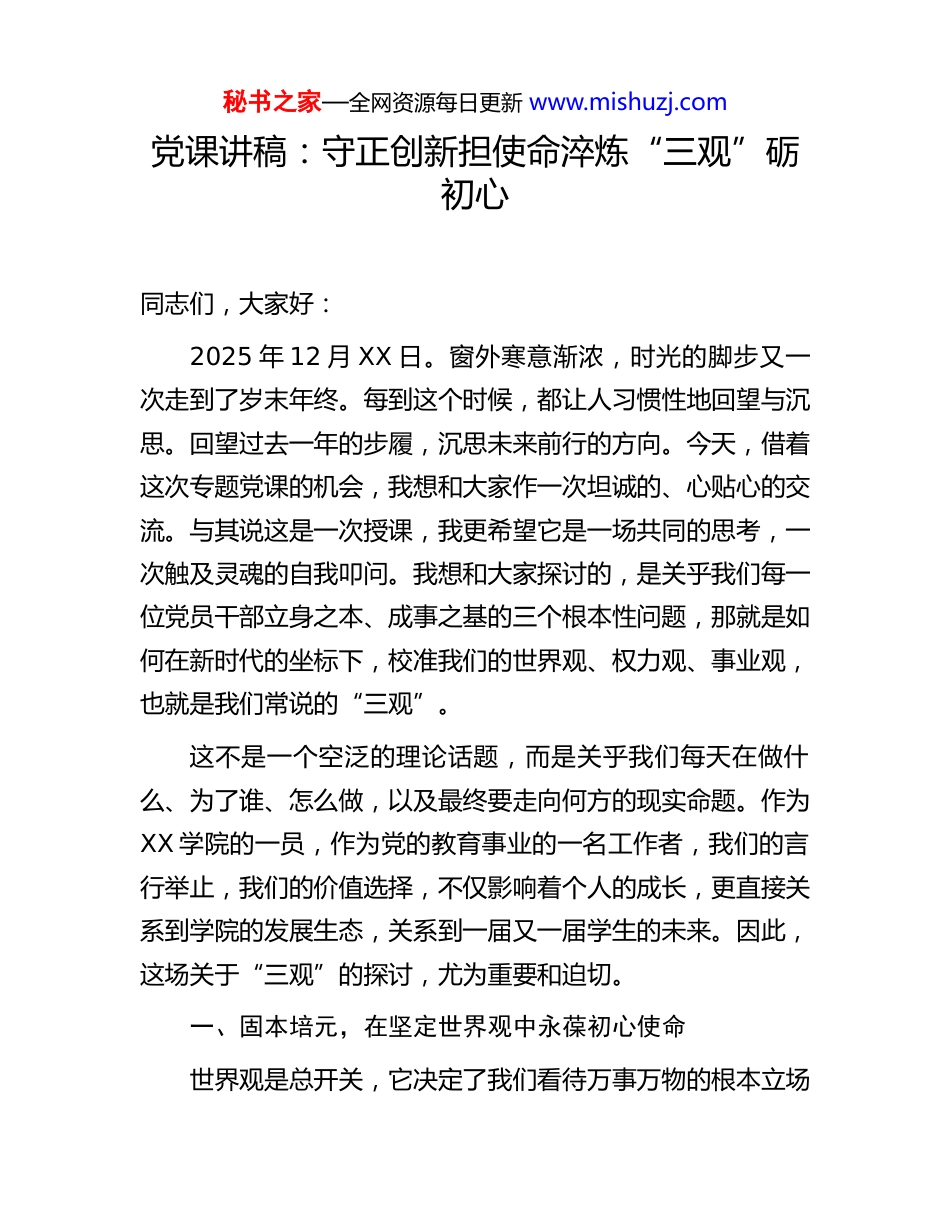秘书之家—全网资源每日更新 www.mishuzj.com党课讲稿:守正创新担使命淬炼“三观”砺初心同志们,大家好:2025 年 12 月 XX 日。窗外寒意渐浓,时光的脚步又一次走到了岁末年终。每到这个时候,都让人习惯性地回望与沉思。回望过去一年的步履,沉思未来前行的方向。今天,借着这次专题党课的机会,我想和大家作一次坦诚的、心贴心的交流。与其说这是一次授课,我更希望它是一场共同的思考,一次触及灵魂的自我叩问。我想和大家探讨的,是关乎我们每一位党员干部立身之本、成事之基的三个根本性问题,那就是如何在新时代的坐标下,校准我们的世界观、权力观、事业观,也就是我们常说的“三观”。这不是一个空泛的理论话题,而是关乎我们每天在做什么、为了谁、怎么做,以及最终要走向何方的现实命题。作为XX 学院的一员,作为党的教育事业的一名工作者,我们的言行举止,我们的价值选择,不仅影响着个人的成长,更直接关系到学院的发展生态,关系到一届又一届学生的未来。因此,这场关于“三观”的探讨,尤为重要和迫切。一、固本培元,在坚定世界观中永葆初心使命世界观是总开关,它决定了我们看待万事万物的根本立场秘书之家—全网资源每日更新 www.mishuzj.com和方法。一个人的世界观正确与否,直接关系到其理想信念是否坚定,政治本色是否纯粹。对于党员干部而言,坚定的马克思主义世界观,就是我们的精神之“钙”。缺了钙,就会得“软骨病”,就会在风浪面前站不稳、走不远。初心和使命,是我们从哪里来、到哪里去的根本叩问。对中国共产党人来说,初心和使命就是为中国人民谋幸福,为中华民族谋复兴。那么具体到我们 XX 学院的每一位党员干部,我们的初心和使命又是什么?我想,答案清晰而坚定,那就是“为党育人、为国育才”,全面落实“立德树人”的根本任务。然而,在日常工作中,一些现象值得我们警惕和深思。有的同志随着工作年限的增长,当初的激情和锐气有所消减,工作热情和责任意识随之淡薄,满足于“过得去”,追求“不出事”;有的同志在纷繁复杂的社会思潮冲击下,理想信念的“压舱石”有所松动,对党的创新理论学习不深不透,甚至觉得“假大空”,与实际工作是“两张皮”;还有的同志工作作风漂浮,习惯于办公室里听汇报,满足于材料上出亮点,离师生远了,离一线远了,对师生真正的急难愁盼了解不够,解决不力。这些问题的根源,就在于世界观这个“总开关”没有拧紧,导致初心蒙尘、使命弱化。坚守初心使命,不是一句挂在秘书之家—全网资源每日更新 www.mishuzj.com嘴边的口号,而是一场需要终身践行的修炼。它体现在我们每一次与学生的耐心交谈中,体现在我们为青年教师成长铺路搭桥的实际行动中,体现在我们深夜里为学院发展规划反复推敲的灯光下。如何才能让这份初心使命历久弥坚?我认为,关键在于“知行合一”。一方面,要持续深化理论武装。要真正把学习习近平新时代中国特色社会主义思想,当作一种生活习惯、一种精神追求。不能停留在“读过了”“学过了”,而要真正思考“领悟了什么”“准备怎么干”。要结合我们正在推进的学科建设、人才培养模式改革、产教融合深化等具体工作,从党的创新理论中寻找破解难题的“金钥匙”。通过建立常态化的专题研讨和主题教育活动,让理论学习与实践探索相互激荡、相互印证,在学思践悟中坚定为人民服务的信念,为师生服务的宗旨。另一方面,要自觉接受实践的淬炼。温室里长不出参天大树。党员干部的成长,离不开火热的实践。要建立健全日常的监督与定期的评估机制,这不仅是对工作的督促,更是对干部的爱护。要敢于把干部放到急难险重的任务中去磨砺,放到服务师生的一线去检验。在解决一个个具体问题、完成一项项具体任务的过程中,让大家亲身体会到工作的价值和意义,从而秘书之家—全网资源每日更新 www.mishuzj.com不断巩固和升华自己的世界观,让政治本色在实践的熔炉中更加鲜亮。二、心存敬畏,在校准权力观中用好手中权权力观,是“三观”中的核心一环。如何看待权力、如何使用权力,是检验一名党员干部党性强弱、作风正派与否的试金石。如何才能用好手中的权力?核心在于三个词:依法、公正、...