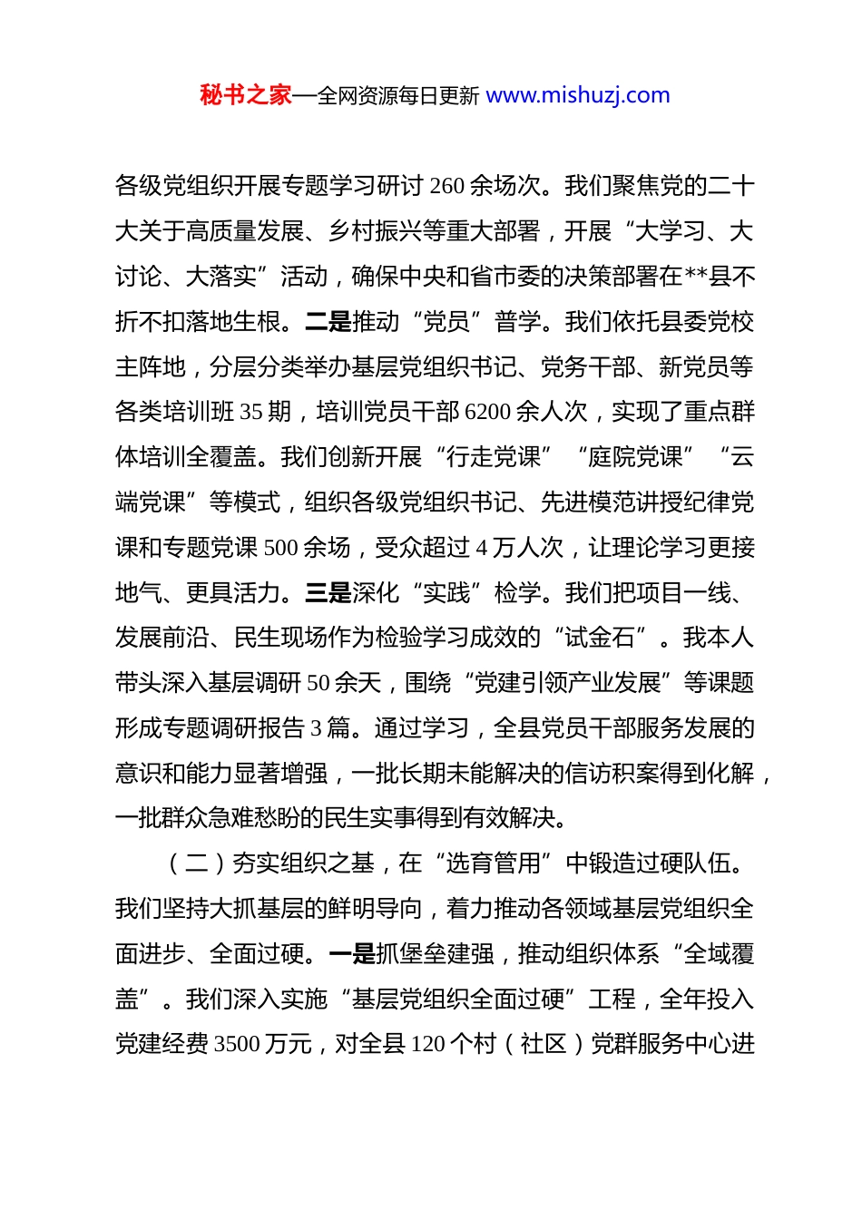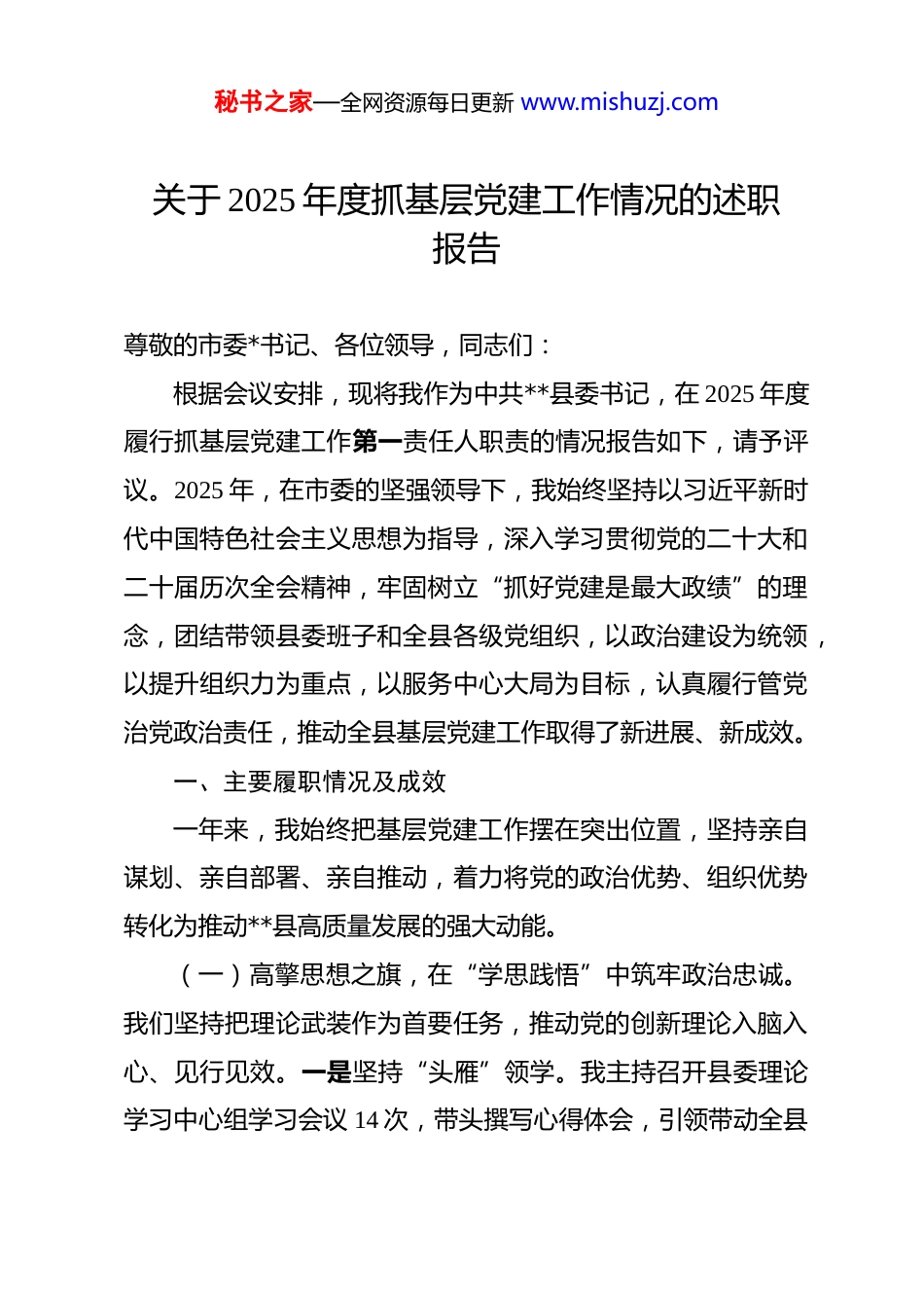 秘书之家—全网资源每日更新 www.mishuzj.com关于 2025 年度抓基层党建工作情况的述职报告 尊敬的市委*书记、各位领导,同志们:根据会议安排,现将我作为中共**县委书记,在 2025 年度履行抓基层党建工作第一责任人职责的情况报告如下,请予评议。2025 年,在市委的坚强领导下,我始终坚持以习近平新时代中国特色社会主义思想为指导,深入学习贯彻党的二十大和二十届历次全会精神,牢固树立“抓好党建是最大政绩”的理念,团结带领县委班子和全县各级党组织,以政治建设为统领,以提升组织力为重点,以服务中心大局为目标,认真履行管党治党政治责任,推动全县基层党建工作取得了新进展、新成效。一、主要履职情况及成效一年来,我始终把基层党建工作摆在突出位置,坚持亲自谋划、亲自部署、亲自推动,着力将党的政治优势、组织优势转化为推动**县高质量发展的强大动能。(一)高擎思想之旗,在“学思践悟”中筑牢政治忠诚。我们坚持把理论武装作为首要任务,推动党的创新理论入脑入心、见行见效。一是坚持“头雁”领学。我主持召开县委理论学习中心组学习会议 14 次,带头撰写心得体会,引领带动全县秘书之家—全网资源每日更新 www.mishuzj.com各级党组织开展专题学习研讨 260 余场次。我们聚焦党的二十大关于高质量发展、乡村振兴等重大部署,开展“大学习、大讨论、大落实”活动,确保中央和省市委的决策部署在**县不折不扣落地生根。二是推动“党员”普学。我们依托县委党校主阵地,分层分类举办基层党组织书记、党务干部、新党员等各类培训班 35 期,培训党员干部 6200 余人次,实现了重点群体培训全覆盖。我们创新开展“行走党课”“庭院党课”“云端党课”等模式,组织各级党组织书记、先进模范讲授纪律党课和专题党课 500 余场,受众超过 4 万人次,让理论学习更接地气、更具活力。三是深化“实践”检学。我们把项目一线、发展前沿、民生现场作为检验学习成效的“试金石”。我本人带头深入基层调研 50 余天,围绕“党建引领产业发展”等课题形成专题调研报告 3 篇。通过学习,全县党员干部服务发展的意识和能力显著增强,一批长期未能解决的信访积案得到化解,一批群众急难愁盼的民生实事得到有效解决。(二)夯实组织之基,在“选育管用”中锻造过硬队伍。我们坚持大抓基层的鲜明导向,着力推动各领域基层党组织全面进步、全面过硬。一是抓堡垒建强,推动组织体系“全域覆盖”。我们深入实施“基层党组织全面过硬”工程,全年投入党建经费 3500 万元,对全县 120 个村(社区)党群服务中心进秘书之家—全网资源每日更新 www.mishuzj.com行标准化改造提升。我们持续整顿软弱涣散基层党组织 15 个,通过选派第一书记、班子重组、结对帮扶等方式,均已实现转化提升。截至 2025 年底,全县共创建“五星级”标准化规范化党支部 85 个,党支部标准化达标率提升至 98%,基层党组织的政治功能和组织功能显著增强。二是抓队伍优育,推动党员管理“全程精细”。我们严把党员“入口关”,全年发展党员216 名,其中 35 岁以下青年党员占比超过 60%,高知识群体、产业工人等重点领域党员比例稳步提升。我们创新实施党员“党性体检、积分管理”制度,全县 1.8 万名党员全部建立“政治体检”档案,通过量化积分,有效激发了党员发挥先锋模范作用的内生动力。我们加大对流动党员的教育管理力度,建立流动党员信息库,累计纳管外出流动党员 520 余人,确保党员“离乡不离党、流动不流失”。三是抓头雁培育,推动干部能力“全面过硬”。我们实施“头雁领航”计划,选派 32 名优秀年轻干部到乡镇(街道)担任党(工)委副书记或到村担任党组织书记。我们完成新一轮村(社区)“两委”干部全员轮训,培训 1300 余人次,有效提升了基层带头人队伍的政策水平和履职能力。我们还建立了村级后备干部库,储备后备力量450 余人,为基层组织建设提供了源源不断的人才支撑。(三)激活发展之能,在“融合赋能”中服务中心大局。秘书之家—全网资源每日更新 www.mishuzj.com我们坚持围绕中心抓党建、抓好党建促发展,推动党建工作与中心工作同频共...