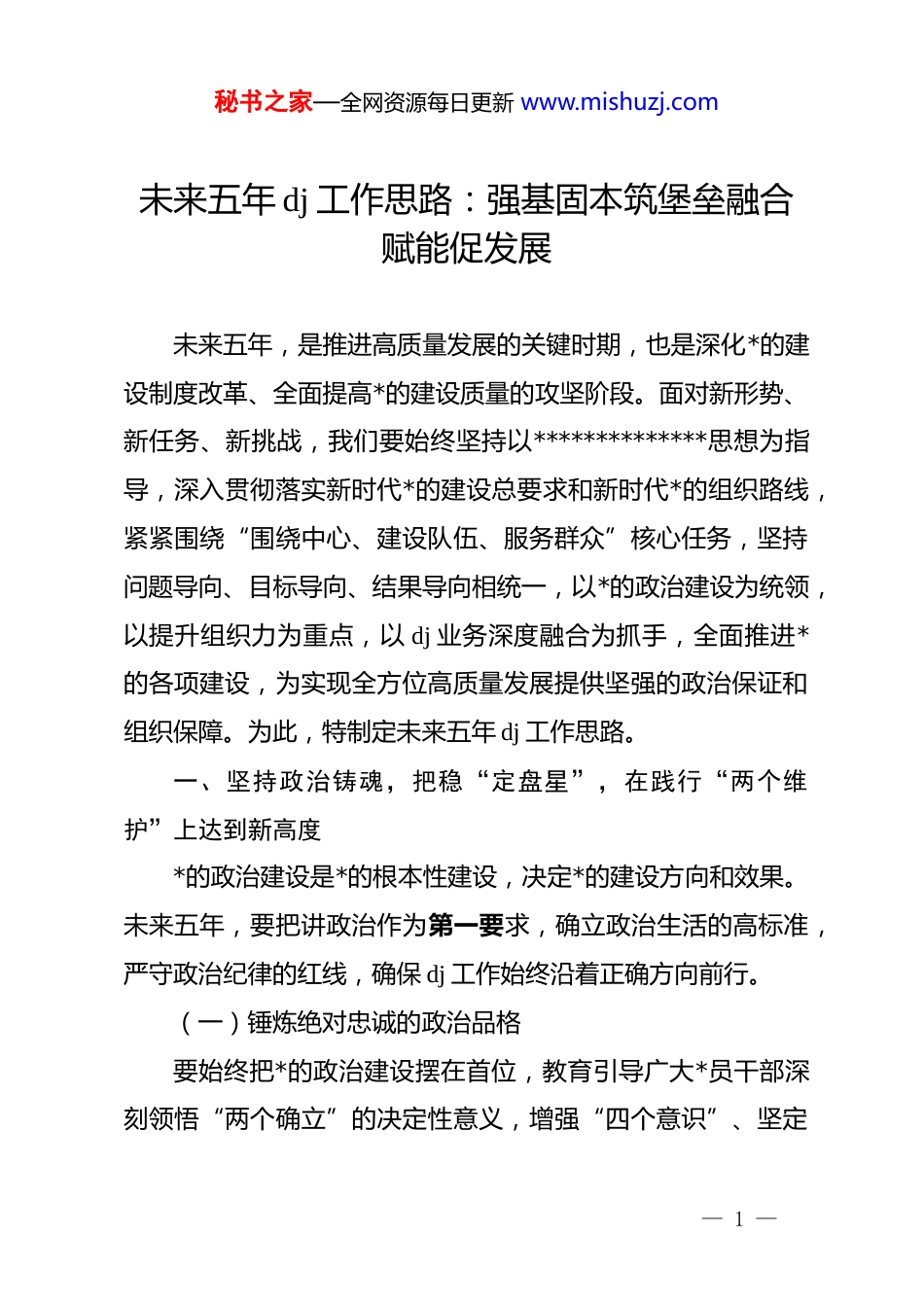 秘书之家—全网资源每日更新 www.mishuzj.com未来五年 dj 工作思路:强基固本筑堡垒融合赋能促发展未来五年,是推进高质量发展的关键时期,也是深化*的建设制度改革、全面提高*的建设质量的攻坚阶段。面对新形势、新任务、新挑战,我们要始终坚持以**************思想为指导,深入贯彻落实新时代*的建设总要求和新时代*的组织路线,紧紧围绕“围绕中心、建设队伍、服务群众”核心任务,坚持问题导向、目标导向、结果导向相统一,以*的政治建设为统领,以提升组织力为重点,以 dj 业务深度融合为抓手,全面推进*的各项建设,为实现全方位高质量发展提供坚强的政治保证和组织保障。为此,特制定未来五年 dj 工作思路。一、坚持政治铸魂,把稳“定盘星”,在践行“两个维护”上达到新高度*的政治建设是*的根本性建设,决定*的建设方向和效果。未来五年,要把讲政治作为第一要求,确立政治生活的高标准,严守政治纪律的红线,确保 dj 工作始终沿着正确方向前行。(一)锤炼绝对忠诚的政治品格要始终把*的政治建设摆在首位,教育引导广大*员干部深刻领悟“两个确立”的决定性意义,增强“四个意识”、坚定— 1 —秘书之家—全网资源每日更新 www.mishuzj.com“四个自信”、做到“两个维护”。把对*忠诚体现在贯彻*中央决策部署的行动上,体现在履职尽责、做好本职工作的实效上,体现在日常言行上。完善政治素质考察机制,将政治标准作为选人用人、评先评优的首要标准,建立*员干部政治表现负面清单,对政治上不合格的“一票否决”。通过开展重温入*誓词、过“政治生日”、参观红色教育基地等活动,不断强化*员的*员意识和*的意识,确保在思想上政治上行动上同*中央保持高度一致。(二)严肃规范*内政治生活严格执行《关于新形势下*内政治生活的若干准则》,增强*内政治生活的政治性、时代性、原则性、战斗性。认真落实“三会一课”、民主生活会、组织生活会、民主评议*员、谈心谈话等制度,坚决防止*内政治生活随意化、形式化、平淡化、庸俗化。提高民主生活会质量,坚持“团结—批评—团结”的方针,用好批评和自我批评这个锐利武器,使之成为解决*内矛盾和问题的“金钥匙”。建立健全*内政治生活督查机制,定期对下级*组织组织生活情况进行抽查检查,对开展不力、流于形式的及时通报整改,确保组织生活不仅有数量更有质量。(三)提升政治判断力领悟力执行力加强政治能力训练和政治实践历练,不断提高*员干部把握— 2 —秘书之家—全网资源每日更新 www.mishuzj.com方向、把握大势、把握全局的能力,辨别政治是非、保持政治定力、驾驭政治局面、防范政治风险的能力。建立“第一议题”制度,第一时间传达学习******重要讲话和指示批示精神,结合实际研究贯彻落实措施。实施“政治能力提升计划”,通过专题培训、轮岗交流、挂职锻炼等方式,让干部在复杂斗争和急难险重任务中经风雨、见世面、壮筋骨。建立健全贯彻落实*中央重大决策部署督查问责机制,确保政令畅通、令行禁止,把讲政治的要求从外部要求转化为内在主动。二、坚持思想引领,点亮“长明灯”,在深化理论武装上实现新突破思想建设是*的基础性建设。未来五年,要坚持不懈用*的创新理论武装头脑、指导实践、推动工作,推动学习教育常态化制度化,筑牢信仰之基、补足精神之钙、把稳思想之舵。(一)构建系统完备的学习体系健全完善*委(*组)理论学习中心组学习制度,制定未来五年理论学习规划和年度学习计划,明确学习重点、学习方式和学习要求。坚持读原著、学原文、悟原理,深入学习马克思主义基本原理,特别是**************思想,做到学思用贯通、知信行统一。推行“领学+研讨+调研”学习模式,每次学习确定一个主题,由领导班子成员领学,结合分管工作开展研讨— 3 —秘书之家—全网资源每日更新 www.mishuzj.com交流,并深入基层开展调研,推动学习成果转化为工作思路和具体举措。充分利用“学习强国”、干部网络学院等平台,打造“指尖课堂”,实现*员学习教育全覆盖、常态化。(二)打造鲜活生动的宣教阵地创新思想政治工作方式方法,注重运用新媒体新技术,增强宣传教育的吸引力和感染力。组建“...
