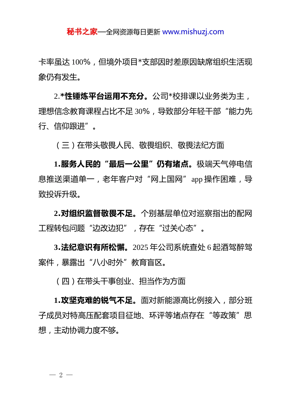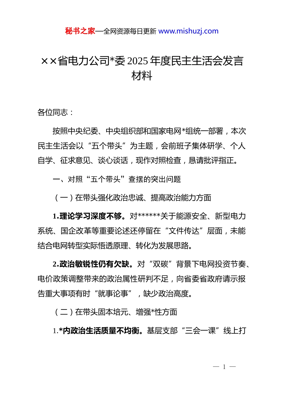 秘书之家—全网资源每日更新 www.mishuzj.com××省电力公司*委 2025 年度民主生活会发言材料各位同志:按照中央纪委、中央组织部和国家电网*组统一部署,本次民主生活会以“五个带头”为主题,会前班子集体研学、个人自学、征求意见、谈心谈话,现作对照检查,恳请批评指正。一、对照“五个带头”查摆的突出问题(一)在带头强化政治忠诚、提高政治能力方面1.理论学习深度不够。对******关于能源安全、新型电力系统、国企改革等重要论述还停留在“文件传达”层面,未能结合电网转型实际悟透原理、转化为发展思路。2.政治敏锐性仍有欠缺。对“双碳”背景下电网投资节奏、电价政策调整带来的政治属性研判不足,向省委省政府请示报告重大事项有时“就事论事”,缺少政治高度。(二)在带头固本培元、增强*性方面1.*内政治生活质量不均衡。基层支部“三会一课”线上打— 1 —秘书之家—全网资源每日更新 www.mishuzj.com卡率虽达 100%,但境外项目*支部因时差原因缺席组织生活现象仍有发生。2.*性锤炼平台运用不充分。公司*校排课以业务类为主,理想信念教育课程占比不足 30%,导致部分年轻干部“能力先行、信仰跟进”。(三)在带头敬畏人民、敬畏组织、敬畏法纪方面1.服务人民的“最后一公里”仍有堵点。极端天气停电信息推送渠道单一,老年客户对“网上国网”app 操作困难,导致投诉升级。2.对组织监督敬畏不足。个别基层单位对巡察指出的配网工程转包问题“边改边犯”,存在“过关心态”。3.法纪意识有所松懈。2025 年公司系统查处 6 起酒驾醉驾案件,暴露出“八小时外”教育盲区。(四)在带头干事创业、担当作为方面1.攻坚克难的锐气不足。面对新能源高比例接入,部分班子成员对特高压配套项目征地、环评等堵点存在“等政策”思想,主动协调力度不够。— 2 —秘书之家—全网资源每日更新 www.mishuzj.com2.改革创新的劲头有所弱化。数字孪生电网、虚拟电厂等新业态布局“雷声大、雨点小”,科研成果转化率仅 18%,低于行业平均水平。3.风险底线思维不牢。对境外项目汇率、政治、合规“三重风险”研判不足,导致上半年南美项目汇兑损失 1.2 亿元。(五)在带头坚决扛起管*治*责任方面1.“一岗双责”压力传导递减。2025 年对下属单位 dj 考核排名靠后的 3 家*委,仅作约谈提醒,未与班子薪酬硬挂钩。2.对“一把手”监督缺少硬招。所属某供电公司总经理长期“个人说了算”,民主集中制空转,直至发生重大违法案件才暴露。3.形式主义、隐形变异问题犹存。基层报表由“纸质”变“系统”,但数据重复填报、层层加码,基层仍反映“指尖上的负担”。二、问题根源剖析1.理论武装不够系统,对“两个确立”决定性意义的领悟还停留在感性层面。— 3 —秘书之家—全网资源每日更新 www.mishuzj.com2.*性修养抓得不紧,自我革命精神有所弱化。3.宗旨意识有所淡化,对“人民电业为人民”企业宗旨缺少时时对标。4.担当精神不足,面对新赛道、新规则,存在“求稳”心态。5.管*治*标准不高,对“严”的主基调把握不够一贯。三、下一步整改方向和措施(一)在强化政治忠诚上立标杆-建立“第一议题”质量评估机制,每季度开展一次“学思用贯通”案例交流,把学习成效转化为电网保供、转型、创新成果。(二)在增强*性上见真章-实施“支部建设三年登高计划”,2026 年“五星*支部”占比达到 80%;境外项目全面推广“云支部+区域联建”,确保组织生活实时可视。(三)在敬畏人民上用真情-上线“停电信息多渠道推送”系统,与社区网格、广电应— 4 —秘书之家—全网资源每日更新 www.mishuzj.com急广播对接,实现老年客户电话自动外呼;建立极端天气“先复电、后抢修”应急机制。(四)在担当作为上求突破-对特高压、分布式新能源消纳等“卡脖子”工程实行“揭榜挂帅”,班子成员每人领题攻坚;把科研成果转化率纳入任期考核,2026 年达到 30%以上。(五)在管*治*上动真格-建立“一岗双责”硬兑现机制,dj 考核排名后 20%的单位扣减班子成员年度绩效 5%;-深化“大监督”平台,对“一把手”权力运行关键环节实时预警,发现问题先停权后核查;-持续开展“指尖上的...