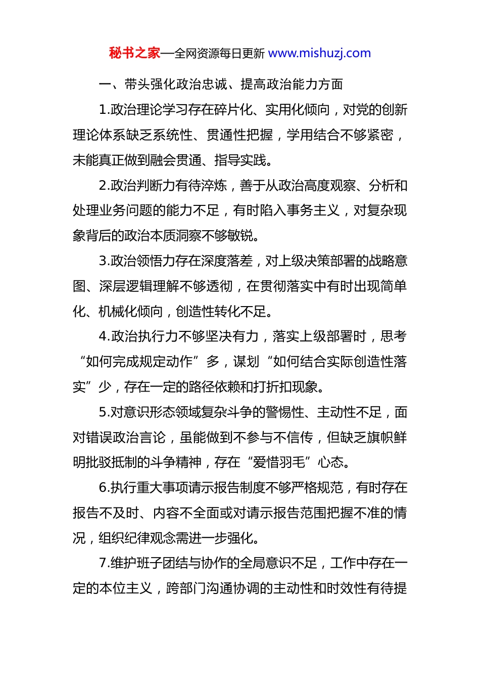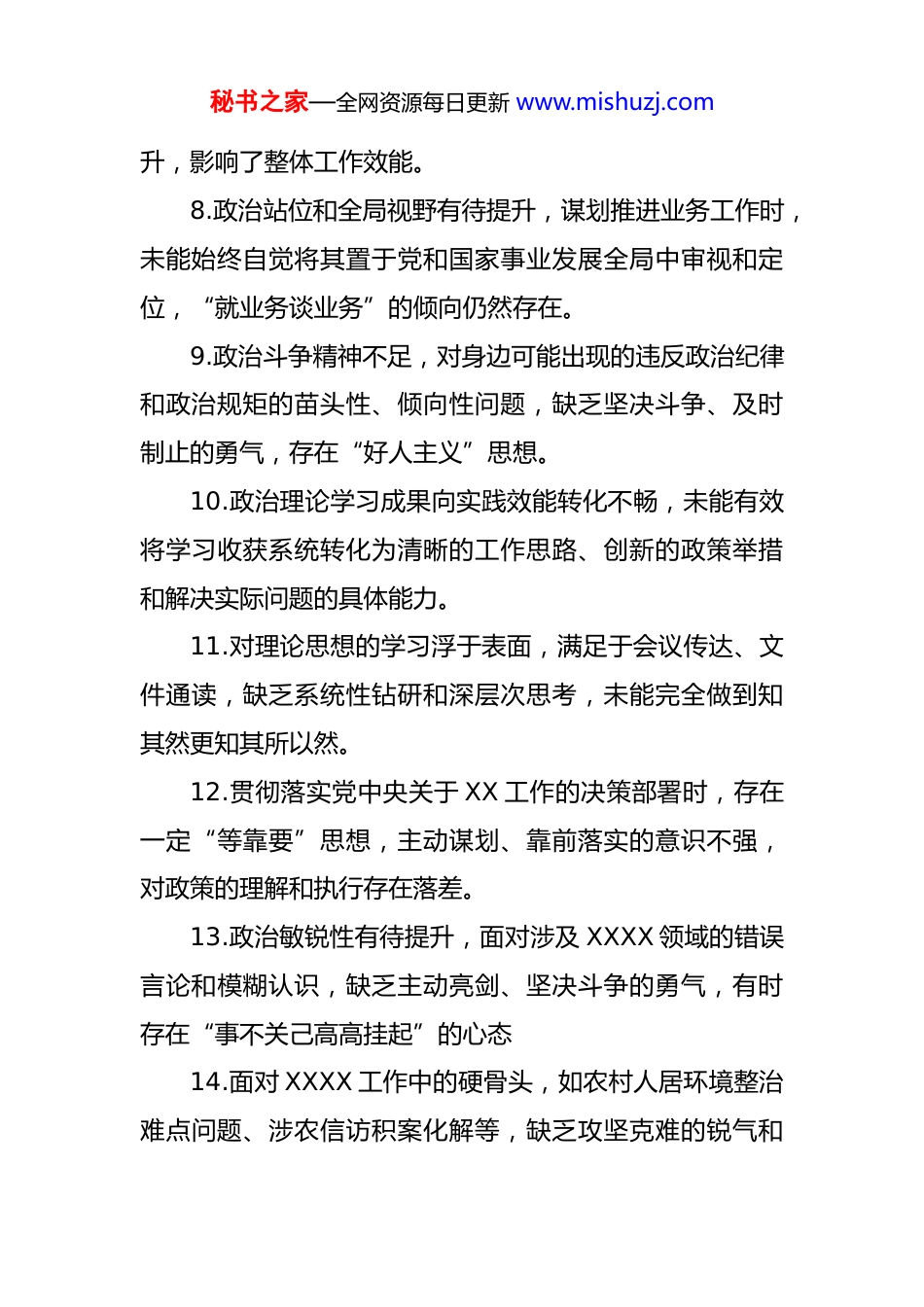 秘书之家—全网资源每日更新 www.mishuzj.com一、带头强化政治忠诚、提高政治能力方面1.政治理论学习存在碎片化、实用化倾向,对党的创新理论体系缺乏系统性、贯通性把握,学用结合不够紧密,未能真正做到融会贯通、指导实践。2.政治判断力有待淬炼,善于从政治高度观察、分析和处理业务问题的能力不足,有时陷入事务主义,对复杂现象背后的政治本质洞察不够敏锐。3.政治领悟力存在深度落差,对上级决策部署的战略意图、深层逻辑理解不够透彻,在贯彻落实中有时出现简单化、机械化倾向,创造性转化不足。4.政治执行力不够坚决有力,落实上级部署时,思考“如何完成规定动作”多,谋划“如何结合实际创造性落实”少,存在一定的路径依赖和打折扣现象。5.对意识形态领域复杂斗争的警惕性、主动性不足,面对错误政治言论,虽能做到不参与不信传,但缺乏旗帜鲜明批驳抵制的斗争精神,存在“爱惜羽毛”心态。6.执行重大事项请示报告制度不够严格规范,有时存在报告不及时、内容不全面或对请示报告范围把握不准的情况,组织纪律观念需进一步强化。7.维护班子团结与协作的全局意识不足,工作中存在一定的本位主义,跨部门沟通协调的主动性和时效性有待提秘书之家—全网资源每日更新 www.mishuzj.com升,影响了整体工作效能。8.政治站位和全局视野有待提升,谋划推进业务工作时,未能始终自觉将其置于党和国家事业发展全局中审视和定位,“就业务谈业务”的倾向仍然存在。9.政治斗争精神不足,对身边可能出现的违反政治纪律和政治规矩的苗头性、倾向性问题,缺乏坚决斗争、及时制止的勇气,存在“好人主义”思想。10.政治理论学习成果向实践效能转化不畅,未能有效将学习收获系统转化为清晰的工作思路、创新的政策举措和解决实际问题的具体能力。11.对理论思想的学习浮于表面,满足于会议传达、文件通读,缺乏系统性钻研和深层次思考,未能完全做到知其然更知其所以然。12.贯彻落实党中央关于 XX 工作的决策部署时,存在一定“等靠要”思想,主动谋划、靠前落实的意识不强,对政策的理解和执行存在落差。13.政治敏锐性有待提升,面对涉及 XXXX 领域的错误言论和模糊认识,缺乏主动亮剑、坚决斗争的勇气,有时存在“事不关己高高挂起”的心态14.面对 XXXX 工作中的硬骨头,如农村人居环境整治难点问题、涉农信访积案化解等,缺乏攻坚克难的锐气和秘书之家—全网资源每日更新 www.mishuzj.com韧劲,有时存在畏难退缩情绪。15.以人民为中心的发展思想树得不牢,深入基层一线调研不够扎实,倾听农民群众呼声不够充分,解决群众急难愁盼问题的针对性和实效性有待提升。二、带头固本培元、增强党性方面1.党性锻炼的自觉性、持续性不足,日常被事务性工作挤占,主动进行党性修养的意识有所淡化,存在“业务硬党性软”的倾向。2.参加党内政治生活有时不够严肃认真,以工作忙为由缺席或参与质量不高的情况偶有发生,在“三会一课”等活动中“身在心不在”,未能真正触及灵魂。3.运用批评与自我批评武器不够有力有效,自我批评怕亮丑,批评他人怕得罪人,“辣味”不足,“红脸出汗”的效果未充分显现。4.理想信念常态化教育抓得不紧不实,对党的创新理论学习缺乏“钻”劲和“韧”劲,理论武装未能完全内化为坚不可摧的信仰根基。5.党性原则的坚定性在利益考验面前有时出现松动,在处理个人与集体、局部与全局关系时,潜意识中掺杂私心杂念,大局观有待强化。6.自我革命的精神有所衰退,对自身存在问题的整改缺秘书之家—全网资源每日更新 www.mishuzj.com乏一以贯之的狠劲和韧劲,存在“问题反复”或“改不彻底”的现象。7.践行初心使命与岗位职责结合不够紧密,在日常工作中党员身份意识、先锋意识有所弱化,未能时刻以最高标准要求自己。8.党内谈心谈话的政治性、思想性不足,多以事务沟通替代思想交流,对同志的思想动态、真实困难了解不深、关心不够。9.党史学习的成果转化不足,对党的光荣传统和红色基因传承弘扬不够主动自觉,从中汲取党性滋养的意识和能力有待提升。10.党性修养水平与新时期履职尽责的高标准要求存在差距,面对复杂矛盾挑战时,未能始终以坚强的党性作为判断决策的...