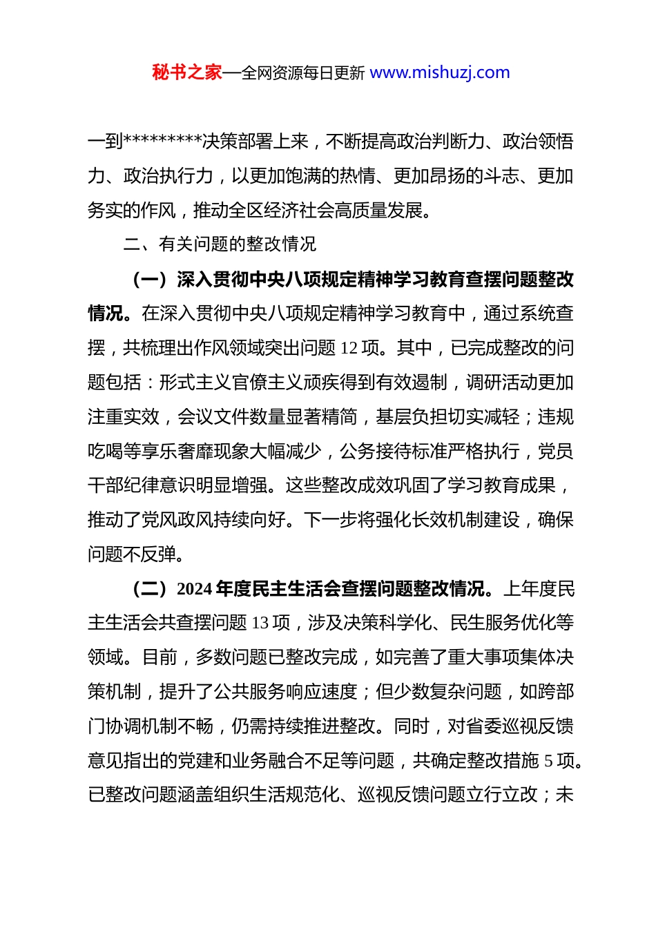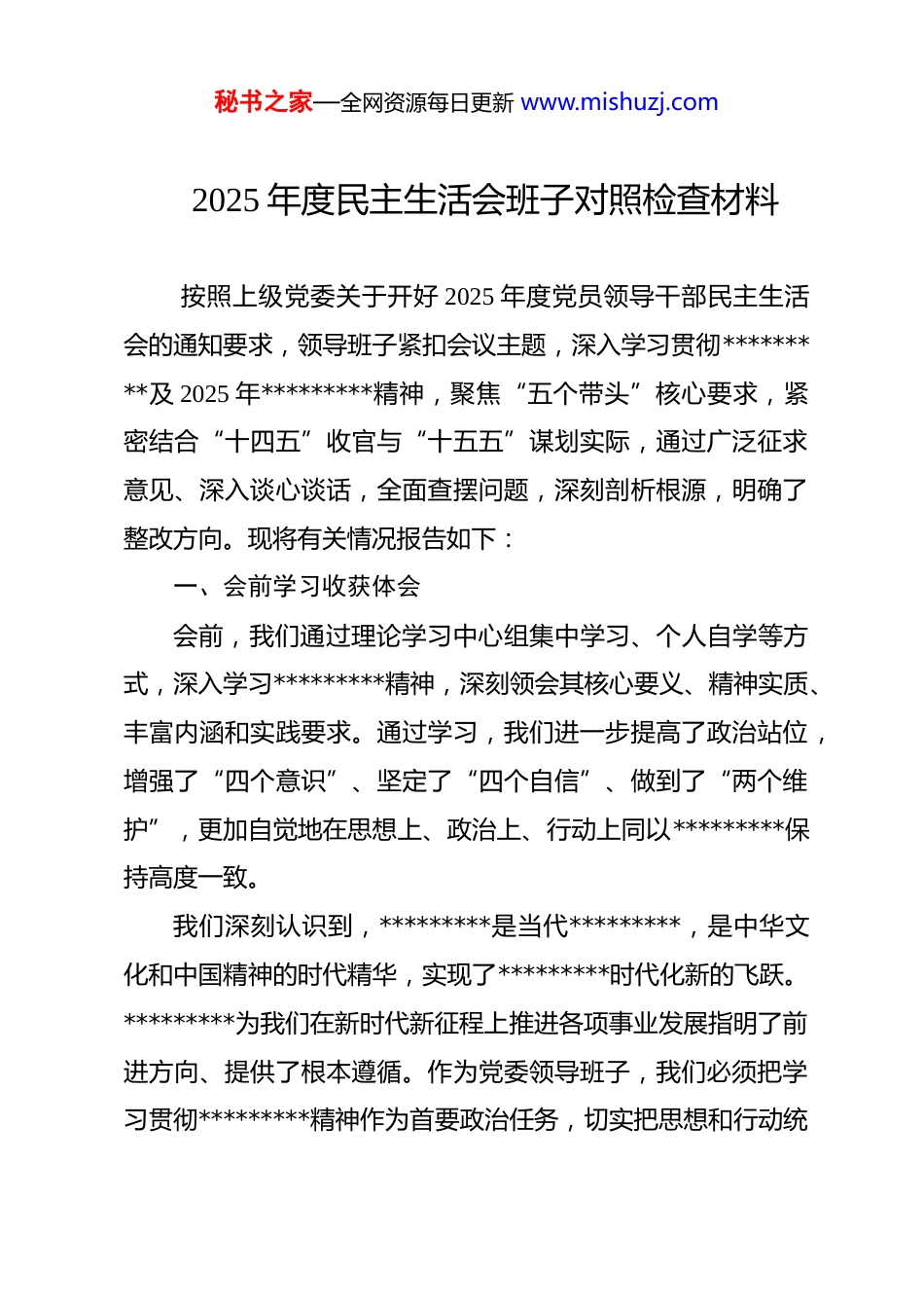 秘书之家—全网资源每日更新 www.mishuzj.com2025 年度民主生活会班子对照检查材料 按照上级党委关于开好 2025 年度党员领导干部民主生活会的通知要求,领导班子紧扣会议主题,深入学习贯彻*********及 2025 年*********精神,聚焦“五个带头”核心要求,紧密结合“十四五”收官与“十五五”谋划实际,通过广泛征求意见、深入谈心谈话,全面查摆问题,深刻剖析根源,明确了整改方向。现将有关情况报告如下:一、会前学习收获体会会前,我们通过理论学习中心组集中学习、个人自学等方式,深入学习*********精神,深刻领会其核心要义、精神实质、丰富内涵和实践要求。通过学习,我们进一步提高了政治站位,增强了“四个意识”、坚定了“四个自信”、做到了“两个维护”,更加自觉地在思想上、政治上、行动上同以*********保持高度一致。我们深刻认识到,*********是当代*********,是中华文化和中国精神的时代精华,实现了*********时代化新的飞跃。*********为我们在新时代新征程上推进各项事业发展指明了前进方向、提供了根本遵循。作为党委领导班子,我们必须把学习贯彻*********精神作为首要政治任务,切实把思想和行动统秘书之家—全网资源每日更新 www.mishuzj.com一到*********决策部署上来,不断提高政治判断力、政治领悟力、政治执行力,以更加饱满的热情、更加昂扬的斗志、更加务实的作风,推动全区经济社会高质量发展。二、有关问题的整改情况(一)深入贯彻中央八项规定精神学习教育查摆问题整改情况。在深入贯彻中央八项规定精神学习教育中,通过系统查摆,共梳理出作风领域突出问题 12 项。其中,已完成整改的问题包括:形式主义官僚主义顽疾得到有效遏制,调研活动更加注重实效,会议文件数量显著精简,基层负担切实减轻;违规吃喝等享乐奢靡现象大幅减少,公务接待标准严格执行,党员干部纪律意识明显增强。这些整改成效巩固了学习教育成果,推动了党风政风持续向好。下一步将强化长效机制建设,确保问题不反弹。(二)2024 年度民主生活会查摆问题整改情况。上年度民主生活会共查摆问题 13 项,涉及决策科学化、民生服务优化等领域。目前,多数问题已整改完成,如完善了重大事项集体决策机制,提升了公共服务响应速度;但少数复杂问题,如跨部门协调机制不畅,仍需持续推进整改。同时,对省委巡视反馈意见指出的党建和业务融合不足等问题,共确定整改措施 5 项。已整改问题涵盖组织生活规范化、巡视反馈问题立行立改;未秘书之家—全网资源每日更新 www.mishuzj.com完成整改的如部分历史遗留问题,因涉及面广,需制定分步方案,确保按期销号。三、存在的主要问题(一)在带头强化政治忠诚、提高政治能力方面班子虽能始终坚持将政治建设摆在首位,但在将政治判断力、政治领悟力、政治执行力转化为推动高质量发展的具体实践中,仍存在“温差”与“落差”。一是理论武装的“转化率”不高,对*********的整体性把握仍有欠缺,往往满足于“第一议题”的传达学习,在如何运用创新理论破解“十四五”收官阶段的痛点难点问题上,缺乏深层次的战略考量,存在“学用两张皮”现象,未能完全将政治忠诚转化为谋划“十五五”发展的科学决策;二是政治敏锐性的“触角”不够灵敏,对于新形势下意识形态领域的复杂性认识不足,特别是在网络舆情应对和风险隐患排查上,有时还习惯于“见招拆招”,缺乏“未雨绸缪”的政治预见性,未能从政治高度敏锐捕捉到某些苗头性、倾向性问题背后的深层逻辑;三是贯彻落实上级决策部署有时存在“时差”,在落实一些跨部门、跨领域的改革攻坚任务时,站位不够高,大局意识稍显不足,偶尔出现以部门利益为重的本位主义思想,导致部分政策落地出现“最后一公里”的梗阻。秘书之家—全网资源每日更新 www.mishuzj.com(二)在带头固本培元、增强党性方面班子成员能够坚守共产党人的精神家园,但在新形势下对照党性修养的高标准严要求,内心深处的“大熔炉”火候还不够旺。一是理想信念的“钙质”补充不及时,在日常繁杂的行政事务中,有时把工作实绩等同于党性锻炼,存在以干代学倾向,对党史、党章的常态化学习有所松懈,导致在面对...