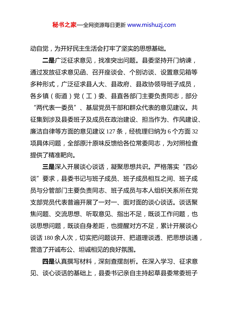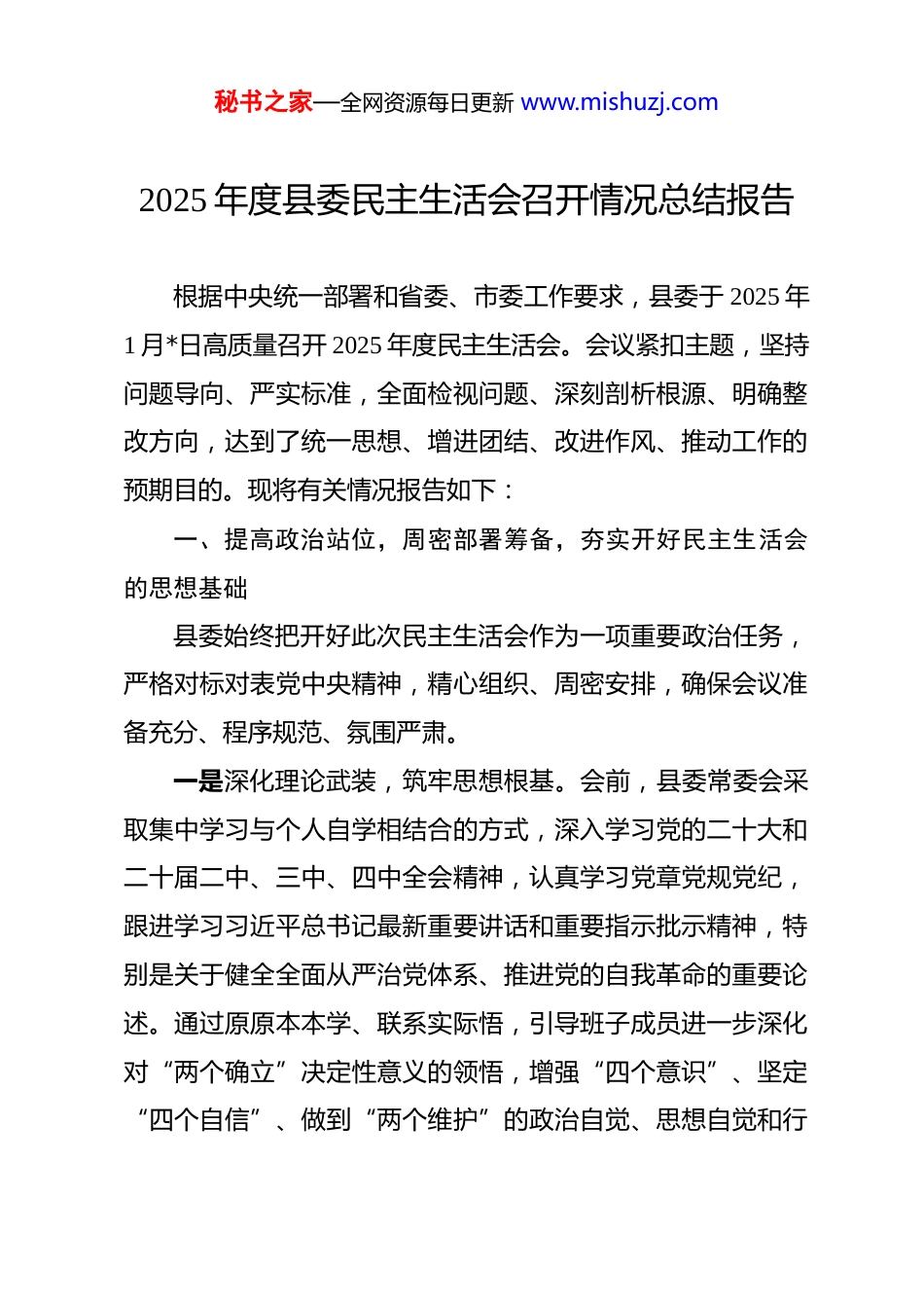 秘书之家—全网资源每日更新 www.mishuzj.com2025 年度县委民主生活会召开情况总结报告 根据中央统一部署和省委、市委工作要求,县委于 2025 年1 月*日高质量召开 2025 年度民主生活会。会议紧扣主题,坚持问题导向、严实标准,全面检视问题、深刻剖析根源、明确整改方向,达到了统一思想、增进团结、改进作风、推动工作的预期目的。现将有关情况报告如下:一、提高政治站位,周密部署筹备,夯实开好民主生活会的思想基础县委始终把开好此次民主生活会作为一项重要政治任务,严格对标对表党中央精神,精心组织、周密安排,确保会议准备充分、程序规范、氛围严肃。一是深化理论武装,筑牢思想根基。会前,县委常委会采取集中学习与个人自学相结合的方式,深入学习党的二十大和二十届二中、三中、四中全会精神,认真学习党章党规党纪,跟进学习习近平总书记最新重要讲话和重要指示批示精神,特别是关于健全全面从严治党体系、推进党的自我革命的重要论述。通过原原本本学、联系实际悟,引导班子成员进一步深化对“两个确立”决定性意义的领悟,增强“四个意识”、坚定“四个自信”、做到“两个维护”的政治自觉、思想自觉和行秘书之家—全网资源每日更新 www.mishuzj.com动自觉,为开好民主生活会打牢了坚实的思想基础。二是广泛征求意见,找准突出问题。县委坚持开门纳谏,通过发放征求意见函、召开座谈会、个别访谈、设置意见箱等多种形式,广泛征求县人大、县政府、县政协领导班子成员,各乡镇(街道)党(工)委、县直各部门主要负责同志,部分“两代表一委员”、基层党员干部和群众代表的意见建议。共征集到涉及县委班子及成员在政治建设、担当作为、作风建设、廉洁自律等方面的意见建议 127 条,经梳理归纳为 6 个方面 32项具体问题,全部原汁原味反馈给各位常委同志,为对照检查提供了精准靶向。三是深入开展谈心谈话,凝聚思想共识。严格落实“四必谈”要求,县委书记与班子成员、班子成员相互之间、班子成员与分管部门主要负责同志、班子成员与本人组织关系所在党支部党员代表普遍开展了一对一、面对面的谈心谈话。谈话聚焦问题、交流思想、听取意见、指出不足,既谈工作问题,也谈思想问题,既谈自身差距,也提醒对方不足,累计开展谈心谈话 180 余人次,切实把问题谈开、把道理谈透、把思想谈通,营造了开诚布公、坦诚相见的良好氛围。四是认真撰写材料,深刻查摆剖析。在深入学习、征求意见、谈心谈话的基础上,县委书记亲自主持起草县委常委班子秘书之家—全网资源每日更新 www.mishuzj.com对照检查材料,并多次主持召开常委会会议进行集体研究审议。各位常委同志紧密联系个人思想、学习和工作实际,主动认领班子问题,深刻反思自身不足,认真撰写个人发言提纲。大家坚持把自己摆进去、把职责摆进去、把工作摆进去,从政治、思想、能力、作风、纪律等方面深挖问题根源,做到见人见事见思想,为高质量开好民主生活会奠定了坚实基础。二、坚持刀刃向内,严肃开展批评,确保民主生活会开出高质量好效果1 月*日,县委常委班子 2025 年度民主生活会正式召开。会议由县委书记主持,市纪委监委、市委组织部有关负责同志到会指导并作点评讲话。会上,首先通报了 2024 年度县委常委班子党史学习教育专题民主生活会整改措施落实情况以及本次民主生活会征求意见情况。随后,县委书记***同志代表县委常委班子作对照检查,重点从带头深刻领悟“两个确立”的决定性意义、带头用习近平新时代中国特色社会主义思想凝心铸魂、带头坚持和加强党的全面领导、带头坚持以人民为中心的发展思想、带头发扬斗争精神、带头落实全面从严治党政治责任等方面,深入查摆了存在的突出问题,深刻剖析了问题产生的思想根源,并从强化理论武装、提升政治能力、践行初心使命、勇于担当作为、从秘书之家—全网资源每日更新 www.mishuzj.com严管党治党等 5 个方面,提出了具体可行的整改措施。紧接着,***同志带头作个人对照检查,主动接受各位常委同志的批评。其他常委同志逐一进行个人对照检查,相互之间开展了严肃认真的批评和自我批评。大家开门见山、直奔主题,自我批评不遮不...