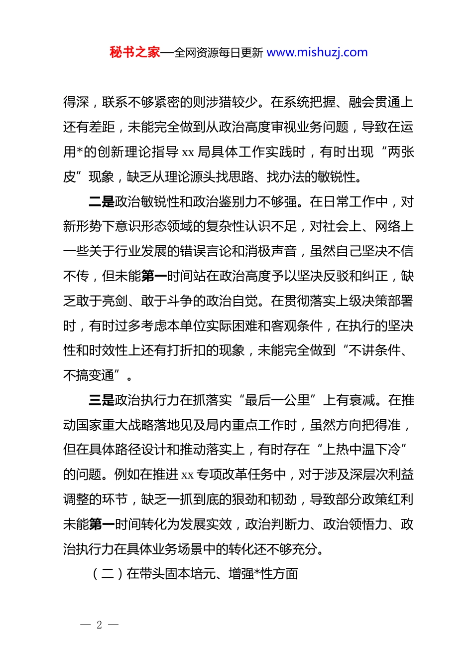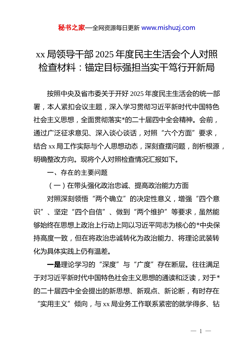 秘书之家—全网资源每日更新 www.mishuzj.comxx 局领导干部 2025 年度民主生活会个人对照检查材料:锚定目标强担当实干笃行开新局按照中央及省市委关于开好 2025 年度民主生活会的统一部署,本人紧扣会议主题,深入学习贯彻习近平新时代中国特色社会主义思想,全面贯彻落实*的二十届四中全会精神。会前,通过广泛征求意见、深入谈心谈话,对照“六个方面”要求,结合 xx 局工作实际与个人思想动态,深刻查摆问题,剖析根源,明确整改方向。现将个人对照检查情况汇报如下。一、存在的主要问题(一)在带头强化政治忠诚、提高政治能力方面对照深刻领悟“两个确立”的决定性意义,增强“四个意识”、坚定“四个自信”、做到“两个维护”等要求,虽然能够始终在思想上政治上行动上同以习近平同志为核心的*中央保持高度一致,但在将政治忠诚转化为政治能力、将理论武装转化为具体实践上仍有温差。一是理论学习的“深度”与“广度”存在断层。往往满足于对习近平新时代中国特色社会主义思想的通读和泛读,对于*的二十届四中全会提出的新思想、新观点、新论断,有时存在“实用主义”倾向,与 xx 局业务工作联系紧密的就学得多、钻— 1 —秘书之家—全网资源每日更新 www.mishuzj.com得深,联系不够紧密的则涉猎较少。在系统把握、融会贯通上还有差距,未能完全做到从政治高度审视业务问题,导致在运用*的创新理论指导 xx 局具体工作实践时,有时出现“两张皮”现象,缺乏从理论源头找思路、找办法的敏锐性。二是政治敏锐性和政治鉴别力不够强。在日常工作中,对新形势下意识形态领域的复杂性认识不足,对社会上、网络上一些关于行业发展的错误言论和消极声音,虽然自己坚决不信不传,但未能第一时间站在政治高度予以坚决反驳和纠正,缺乏敢于亮剑、敢于斗争的政治自觉。在贯彻落实上级决策部署时,有时过多考虑本单位实际困难和客观条件,在执行的坚决性和时效性上还有打折扣的现象,未能完全做到“不讲条件、不搞变通”。三是政治执行力在抓落实“最后一公里”上有衰减。在推动国家重大战略落地见及局内重点工作时,虽然方向把得准,但在具体路径设计和推动落实上,有时存在“上热中温下冷”的问题。例如在推进 xx 专项改革任务中,对于涉及深层次利益调整的环节,缺乏一抓到底的狠劲和韧劲,导致部分政策红利未能第一时间转化为发展实效,政治判断力、政治领悟力、政治执行力在具体业务场景中的转化还不够充分。(二)在带头固本培元、增强*性方面— 2 —秘书之家—全网资源每日更新 www.mishuzj.com对照坚持把政治修养摆在*性修养的首位,自觉以习近平新时代中国特色社会主义思想凝心铸魂等要求,自己在*性锻炼的经常性、自觉性上还有不足,未能时刻保持“检身若不及”的紧迫感。一是理想信念的“总开关”拧得不够紧。随着*龄增长和职务提升,潜意识里认为自己受*教育多年,政治立场坚定,不会出大问题,因而对世界观、人生观、价值观的改造有所放松。在忙碌的事务性工作中,有时把*性锻炼等同于参加会议、阅读文件,缺乏深层次的灵魂拷问和思想洗礼。特别是在面对急难险重任务时,虽然能冲锋在前,但更多是出于职责所在,从信仰高度汲取精神力量的自觉性不强,对照先辈先烈和先进典型,在精神境界和奉献精神上还有差距。二是*性修养与业务工作的融合不够紧密。习惯于从行政管理者的角度思考问题,有时忽视了作为一名*员领导干部的政治本色。在处理具体事务时,偶尔会出现重业务轻政治、重效率轻原则的倾向。例如在干部选拔任用、评优评先等环节,有时过分看重业务实绩,对干部的思想动态、作风表现考察不够深入,未能完全将*性原则贯穿于队伍建设的全过程,导致个别干部虽然业务能力强,但群众口碑一般,未能充分发挥*性修养在凝心铸魂方面的核心作用。— 3 —秘书之家—全网资源每日更新 www.mishuzj.com三是自我革命的精神有所懈怠。对照*章*规*纪进行自我检视的频率不够高,往往是开展集中教育时查一查,平时则“自我感觉良好”。在听取意见建议时,虽然态度诚恳,但内心深处有时对批评意见存在本能的防御心理,未能完全做到“闻过则喜”。对于一些苗头性、...