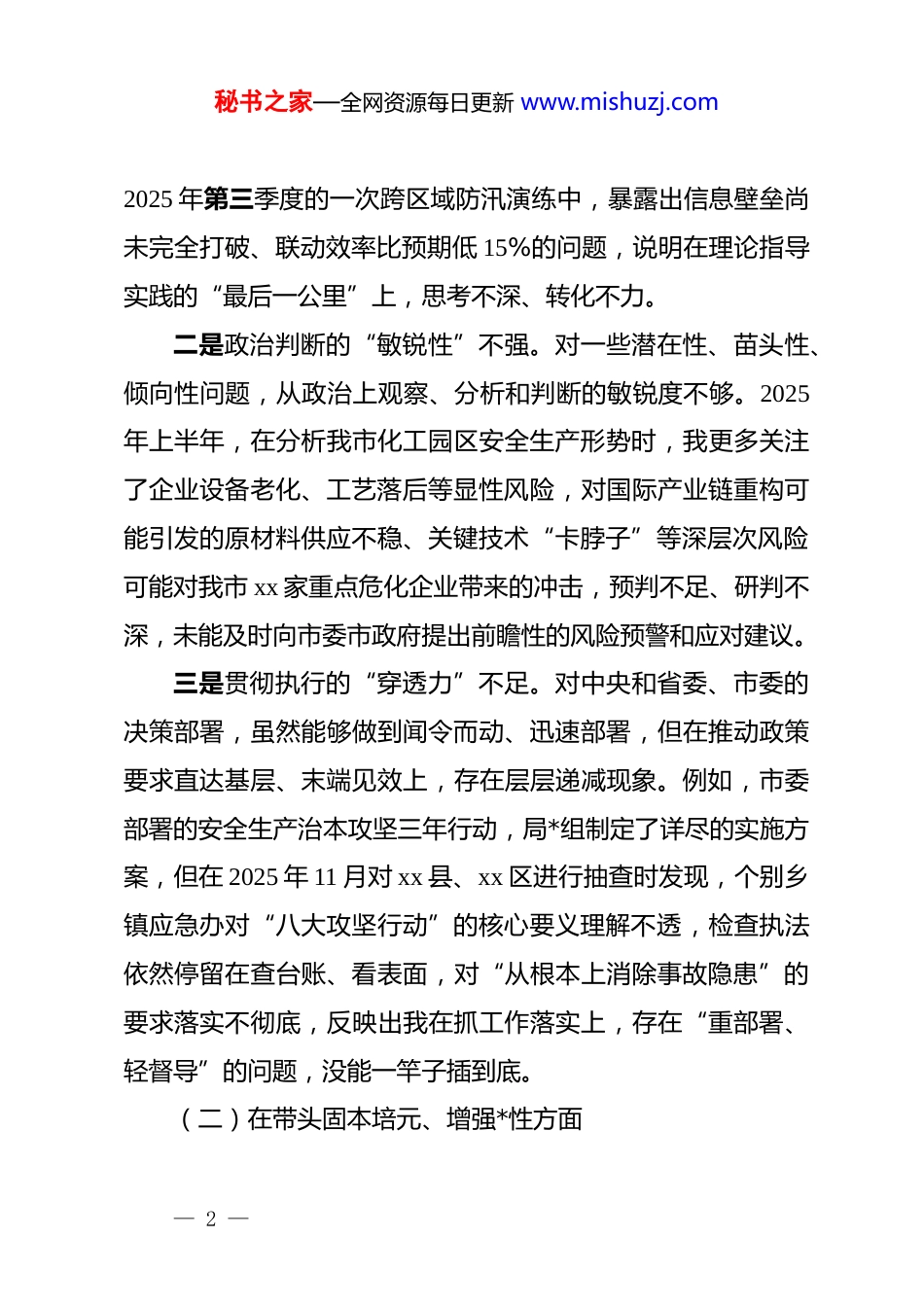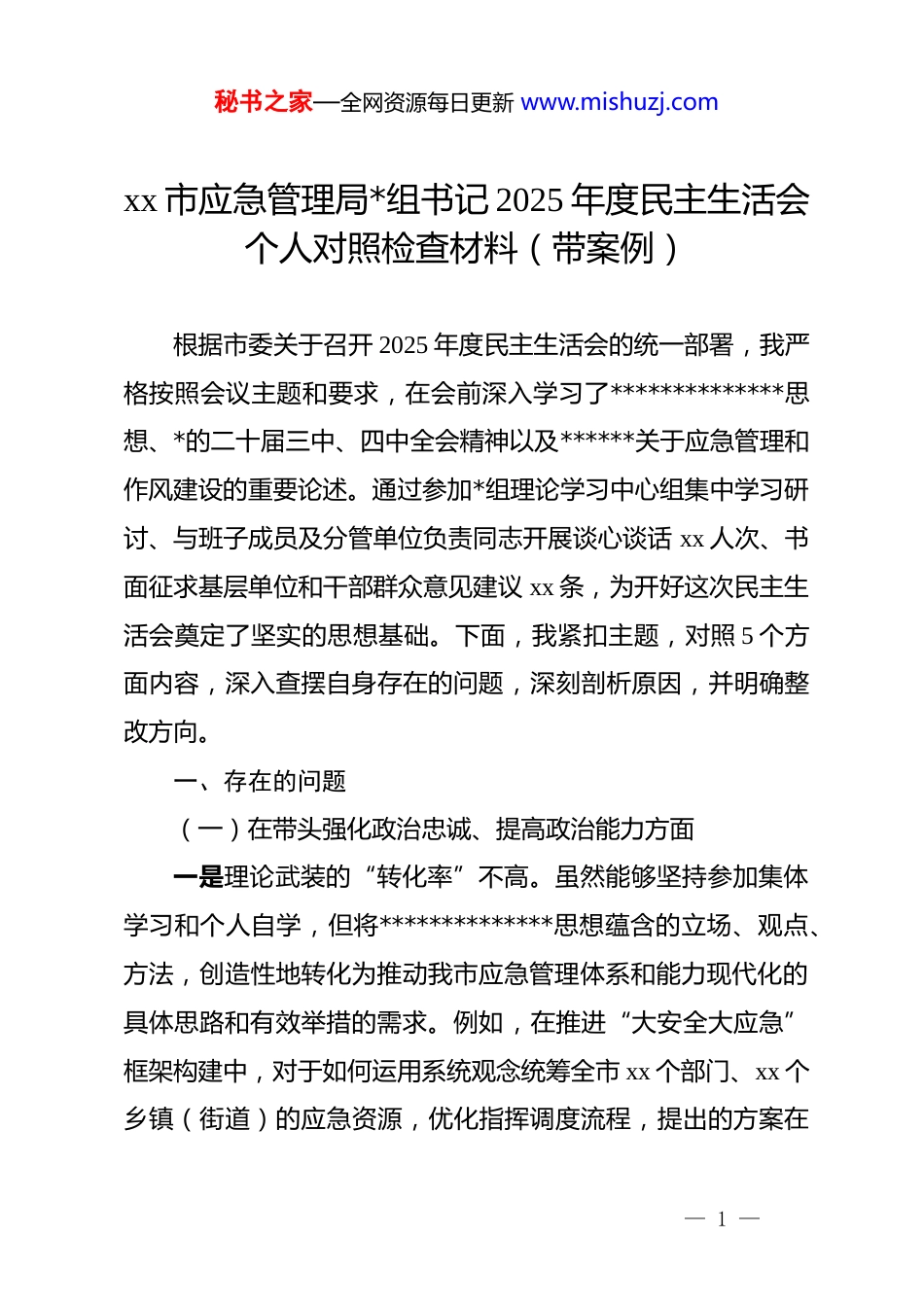 秘书之家—全网资源每日更新 www.mishuzj.comxx 市应急管理局*组书记 2025 年度民主生活会个人对照检查材料(带案例)根据市委关于召开 2025 年度民主生活会的统一部署,我严格按照会议主题和要求,在会前深入学习了**************思想、*的二十届三中、四中全会精神以及******关于应急管理和作风建设的重要论述。通过参加*组理论学习中心组集中学习研讨、与班子成员及分管单位负责同志开展谈心谈话 xx 人次、书面征求基层单位和干部群众意见建议 xx 条,为开好这次民主生活会奠定了坚实的思想基础。下面,我紧扣主题,对照 5 个方面内容,深入查摆自身存在的问题,深刻剖析原因,并明确整改方向。一、存在的问题(一)在带头强化政治忠诚、提高政治能力方面一是理论武装的“转化率”不高。虽然能够坚持参加集体学习和个人自学,但将**************思想蕴含的立场、观点、方法,创造性地转化为推动我市应急管理体系和能力现代化的具体思路和有效举措的需求。例如,在推进“大安全大应急”框架构建中,对于如何运用系统观念统筹全市 xx 个部门、xx 个乡镇(街道)的应急资源,优化指挥调度流程,提出的方案在— 1 —秘书之家—全网资源每日更新 www.mishuzj.com2025 年第三季度的一次跨区域防汛演练中,暴露出信息壁垒尚未完全打破、联动效率比预期低 15%的问题,说明在理论指导实践的“最后一公里”上,思考不深、转化不力。二是政治判断的“敏锐性”不强。对一些潜在性、苗头性、倾向性问题,从政治上观察、分析和判断的敏锐度不够。2025年上半年,在分析我市化工园区安全生产形势时,我更多关注了企业设备老化、工艺落后等显性风险,对国际产业链重构可能引发的原材料供应不稳、关键技术“卡脖子”等深层次风险可能对我市 xx 家重点危化企业带来的冲击,预判不足、研判不深,未能及时向市委市政府提出前瞻性的风险预警和应对建议。三是贯彻执行的“穿透力”不足。对中央和省委、市委的决策部署,虽然能够做到闻令而动、迅速部署,但在推动政策要求直达基层、末端见效上,存在层层递减现象。例如,市委部署的安全生产治本攻坚三年行动,局*组制定了详尽的实施方案,但在 2025 年 11 月对 xx 县、xx 区进行抽查时发现,个别乡镇应急办对“八大攻坚行动”的核心要义理解不透,检查执法依然停留在查台账、看表面,对“从根本上消除事故隐患”的要求落实不彻底,反映出我在抓工作落实上,存在“重部署、轻督导”的问题,没能一竿子插到底。(二)在带头固本培元、增强*性方面— 2 —秘书之家—全网资源每日更新 www.mishuzj.com一是*性锤炼的“熔炉火”不旺。随着工作头绪增多、事务性工作繁忙,有时不自觉地产生了“事务主义”倾向,把更多的精力投入到抓安全生产、防灾减灾等具体业务中,而静下心来读原著、学原文、悟原理的时间被挤占,参与*支部组织生活时,更多是以普通*员身份参加,指导和带动作用发挥不充分。*性修养的日常锤炼有所放松,导致在面对复杂局面时,从*性原则出发进行决断的定力有所减弱。二是理想信念的“压舱石”不稳。在长期、艰巨的应急管理工作中,特别是面对一些久拖不决的安全生产顽瘴痼疾和突发事件的巨大压力时,偶尔会产生畏难情绪和“歇歇脚”的念头。例如,在推动老旧工业园区消防设施整体升级改造这一历史遗留问题时,因涉及资金量大、协调部门多、企业配合难,连续两年进展缓慢,一度产生了“等一等、看一看”的消极想法,攻坚克难的革命意志和奋斗精神有所消退,理想信念这个“压舱石”的分量有所减轻。三是精神家园的“篱笆墙”不牢。在八小时之外的自我约束和管理不严格,对社会上的一些错误思潮和网络上的负面言论,警惕性不高、斗争性不强。有时在非正式场合,听到一些对*的方针政策的议论或牢骚,没有第一时间旗帜鲜明地予以批驳和纠正,认为“清者自清”,没必要为此争论。这实质上是*— 3 —秘书之家—全网资源每日更新 www.mishuzj.com性原则不强的表现,未能时刻以*员领导干部的标准严格要求自己,主动净化政治生态的意识和行动不坚决。(三)在带头敬畏人民、敬畏组织、敬畏法纪方面一是深入基层的“...