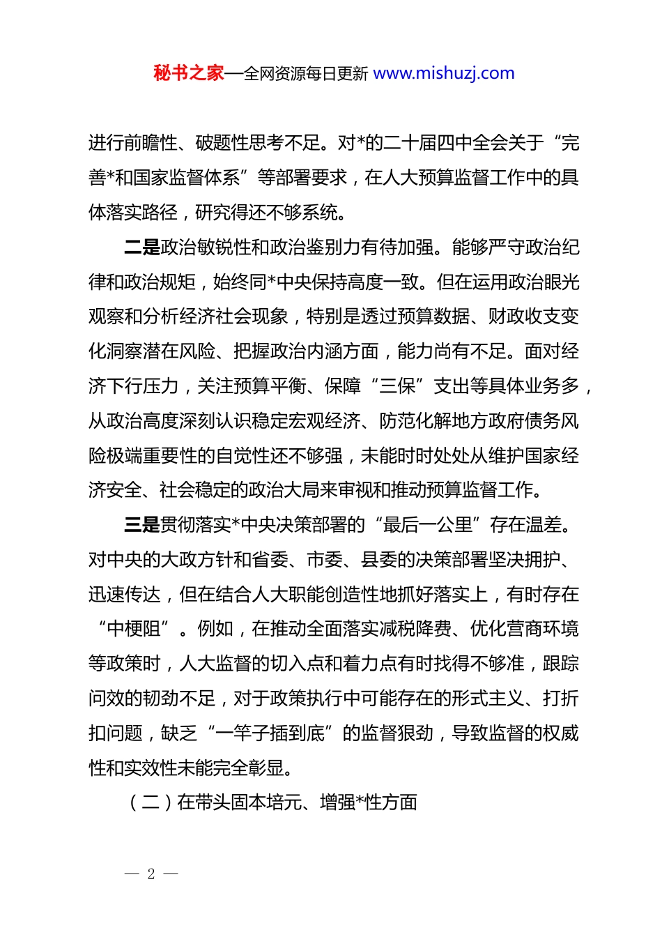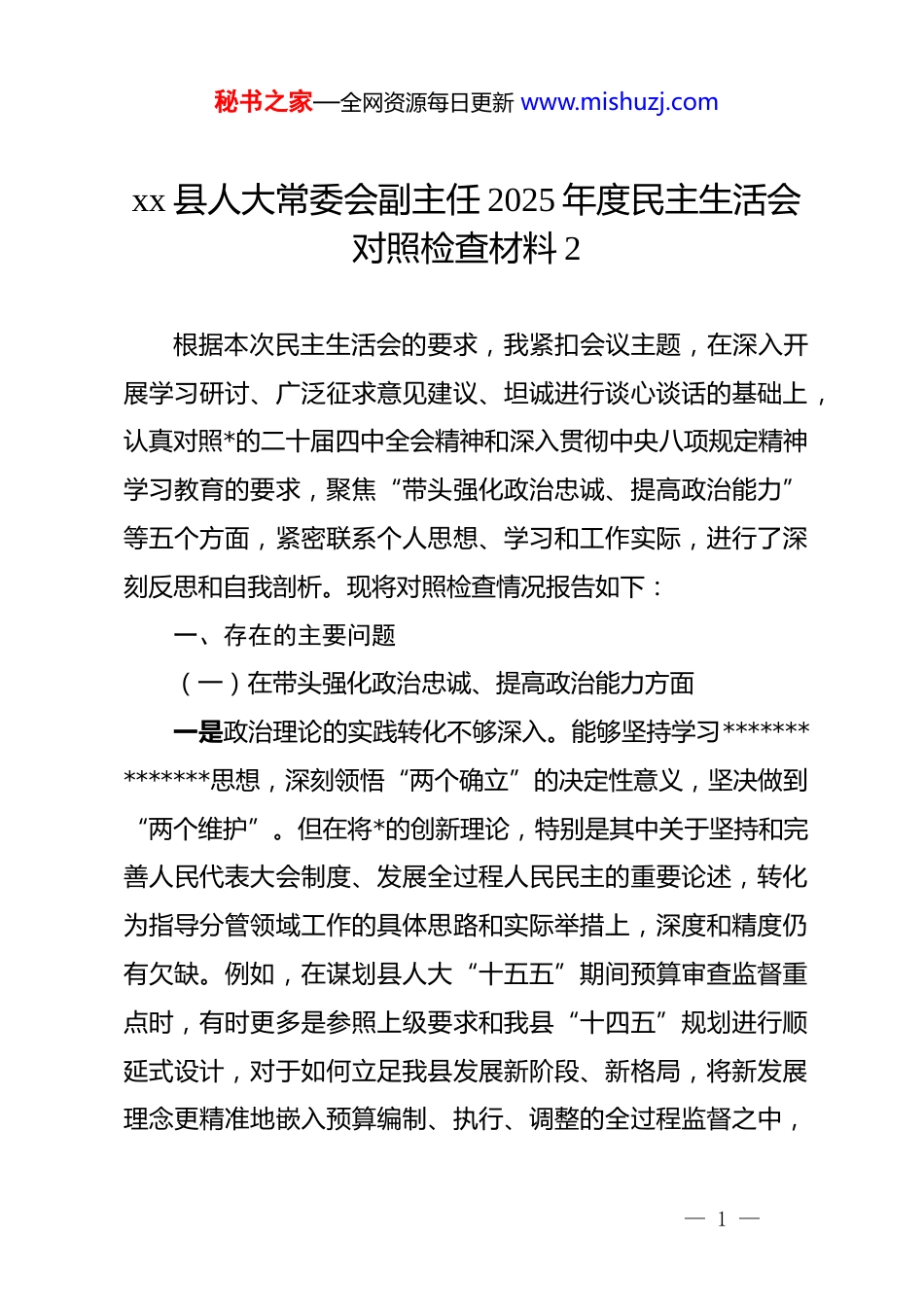 秘书之家—全网资源每日更新 www.mishuzj.comxx 县人大常委会副主任 2025 年度民主生活会对照检查材料 2根据本次民主生活会的要求,我紧扣会议主题,在深入开展学习研讨、广泛征求意见建议、坦诚进行谈心谈话的基础上,认真对照*的二十届四中全会精神和深入贯彻中央八项规定精神学习教育的要求,聚焦“带头强化政治忠诚、提高政治能力”等五个方面,紧密联系个人思想、学习和工作实际,进行了深刻反思和自我剖析。现将对照检查情况报告如下:一、存在的主要问题(一)在带头强化政治忠诚、提高政治能力方面一是政治理论的实践转化不够深入。能够坚持学习**************思想,深刻领悟“两个确立”的决定性意义,坚决做到“两个维护”。但在将*的创新理论,特别是其中关于坚持和完善人民代表大会制度、发展全过程人民民主的重要论述,转化为指导分管领域工作的具体思路和实际举措上,深度和精度仍有欠缺。例如,在谋划县人大“十五五”期间预算审查监督重点时,有时更多是参照上级要求和我县“十四五”规划进行顺延式设计,对于如何立足我县发展新阶段、新格局,将新发展理念更精准地嵌入预算编制、执行、调整的全过程监督之中,— 1 —秘书之家—全网资源每日更新 www.mishuzj.com进行前瞻性、破题性思考不足。对*的二十届四中全会关于“完善*和国家监督体系”等部署要求,在人大预算监督工作中的具体落实路径,研究得还不够系统。二是政治敏锐性和政治鉴别力有待加强。能够严守政治纪律和政治规矩,始终同*中央保持高度一致。但在运用政治眼光观察和分析经济社会现象,特别是透过预算数据、财政收支变化洞察潜在风险、把握政治内涵方面,能力尚有不足。面对经济下行压力,关注预算平衡、保障“三保”支出等具体业务多,从政治高度深刻认识稳定宏观经济、防范化解地方政府债务风险极端重要性的自觉性还不够强,未能时时处处从维护国家经济安全、社会稳定的政治大局来审视和推动预算监督工作。三是贯彻落实*中央决策部署的“最后一公里”存在温差。对中央的大政方针和省委、市委、县委的决策部署坚决拥护、迅速传达,但在结合人大职能创造性地抓好落实上,有时存在“中梗阻”。例如,在推动全面落实减税降费、优化营商环境等政策时,人大监督的切入点和着力点有时找得不够准,跟踪问效的韧劲不足,对于政策执行中可能存在的形式主义、打折扣问题,缺乏“一竿子插到底”的监督狠劲,导致监督的权威性和实效性未能完全彰显。(二)在带头固本培元、增强*性方面— 2 —秘书之家—全网资源每日更新 www.mishuzj.com一是*性修养的常态化锤炼有所松懈。认为自己受*教育培养多年,政治立场是坚定的,世界观、人生观、价值观这个“总开关”拧得是牢的,从而不自觉地放松了持续性的*性锻炼。有时满足于参加集体学习、完成“规定动作”,把更多精力投入到了分管的具体业务中,静下心来对照*章*规 dj 进行自我反省、自我净化、自我提高不够经常。特别是在工作繁忙时,存在“业务硬、政治软”的倾向,未能始终将*性修养作为终身课题融入日常、抓在经常。二是理想信念教育的融入度不够深。虽然始终坚守共产*人的精神追求,但在如何将坚定理想信念与做好新时代人大工作,特别是枯燥细致的预算报表审查、繁杂的办公室协调服务工作紧密结合方面,探索不深、抓手不多。例如,在组织分管委室同志学习时,谈业务要求、工作规范多,结合财政预算发展史、国家治理体系现代化进程来阐释中国特色社会主义制度优越性,从而激发大家政治认同和职业自豪感方面做得不够,理想信念教育未能完全做到润物无声、触动心灵。三是严肃*内政治生活的战斗性有待提升。能够自觉参加常委会*组和所在*支部的组织生活,但在开展批评和自我批评时,有时还存在“好人主义”思想。自我批评时,谈工作层面的问题多,从*性根源、思想深处进行剖析的勇气不足;相互批评时,— 3 —秘书之家—全网资源每日更新 www.mishuzj.com顾及情面、怕伤和气,对同志存在的问题常以希望、建议代替直接的批评,缺乏“辣味”,使得*内政治生活的“熔炉”作用未能得到充分发挥。(三)在带头敬畏人民、敬畏组织、敬畏法纪方面一是...