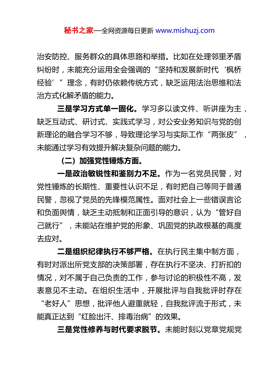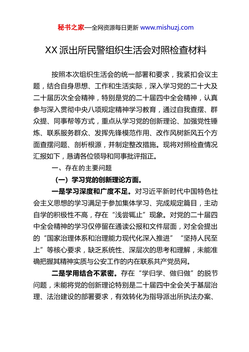 秘书之家—全网资源每日更新 www.mishuzj.comXX 派出所民警组织生活会对照检查材料按照本次组织生活会的统一部署和要求,我紧扣会议主题,结合自身思想、工作和生活实际,深入学习党的二十大及二十届历次全会精神,特别是党的二十届四中全会精神,认真参与深入贯彻中央八项规定精神学习教育,通过自我查摆、群众提、同事帮等方式,重点从学习党的创新理论、加强党性锤炼、联系服务群众、发挥先锋模范作用、改作风树新风五个方面查摆问题、剖析根源,并制定整改措施。现将对照检查情况汇报如下,恳请各位领导和同事批评指正。一、存在的主要问题(一)学习党的创新理论方面。一是学习深度和广度不足。对习近平新时代中国特色社会主义思想的学习满足于参加集体学习、完成规定篇目,主动自学的积极性不高,存在“浅尝辄止”现象。对党的二十届四中全会精神的学习仅停留在通读公报和文件层面,对全会提出的“国家治理体系和治理能力现代化深入推进”“坚持人民至上”等核心要求,缺乏系统性、深层次的思考和理解,未能准确把握其精神实质与公安工作的内在联系共产党员网。二是学用结合不紧密。存在“学归学、做归做”的脱节问题,未能将党的创新理论特别是二十届四中全会关于基层治理、法治建设的部署要求,有效转化为指导派出所执法办案、秘书之家—全网资源每日更新 www.mishuzj.com治安防控、服务群众的具体思路和举措。比如在处理邻里矛盾纠纷时,未能充分运用全会强调的“坚持和发展新时代‘枫桥经验’”理念,有时仍依赖传统方式,缺乏运用法治思维和法治方式化解矛盾的能力。三是学习方式单一固化。学习多以读文件、听讲座为主,缺乏互动式、研讨式、实践式学习,对公安业务知识与党的创新理论的融合学习不够,导致理论学习与实际工作“两张皮”,未能通过学习有效提升解决复杂问题的能力。(二)加强党性锤炼方面。一是政治敏锐性和鉴别力不足。作为一名党员民警,对党性锤炼的长期性、重要性认识不足,有时把自己等同于普通民警,忽视了党员的先锋模范属性。面对社会上一些错误言论和负面舆情,缺乏主动抵制和正面引导的意识,认为“管好自己就行”,未能站在维护党的形象、巩固党的执政根基的高度去应对。二是组织纪律执行不够严格。在执行民主集中制方面,有时对派出所党支部的决策部署,存在执行不坚决、打折扣的情况,对不属于自己负责的工作,参与讨论的积极性不高,发表意见不主动。在组织生活中,开展批评与自我批评时存在“老好人”思想,批评他人避重就轻,自我批评流于形式,未能真正达到“红脸出汗、排毒治病”的效果。三是党性修养与时代要求脱节。未能时刻以党章党规党秘书之家—全网资源每日更新 www.mishuzj.com纪严格要求自己,在面对工作压力和个人利益时,偶尔会出现浮躁情绪,艰苦奋斗、无私奉献的精神有所减退。对党的二十届四中全会提出的“全面从严治党”“强化权力监督”等要求,未能内化于心、外化于行,在日常工作中仍存在重业务、轻党建的倾向。(三)联系服务群众方面。一是深入群众不够经常。落实“从群众中来,到群众中去”的工作方法不到位,日常工作中多坐在办公室处理台账、办理业务,主动深入社区、村组走访群众的次数不多,对辖区群众的所思所想、急难愁盼问题掌握不全面、不精准。比如对辖区老年人、留守儿童等特殊群体的服务需求了解不足,未能针对性地开展帮扶工作。二是服务群众效率和质量有待提升。在户籍办理、证明开具等窗口服务中,有时存在流程解释不清晰、一次性告知不到位的情况,导致群众“多跑腿”。面对群众的报警求助,部分警情处理存在响应不及时、处置不细致的问题,未能充分践行党的二十届四中全会强调的“以满足人民日益增长的美好生活需要为根本目的”的要求。三是矛盾纠纷化解能力不足。对辖区内的邻里纠纷、物业纠纷等民事矛盾,有时存在“重处置、轻化解”的倾向,未能充分发挥基层民警在矛盾调解中的作用,导致部分矛盾未能及时化解在萌芽状态,与全会提出的“完善社会矛盾纠纷多元秘书之家—全网资源每日更新 www.mishuzj.com预防调处化解综合机制”的要求存在差距。(四)发挥先锋模范作用方面。一是急难险...