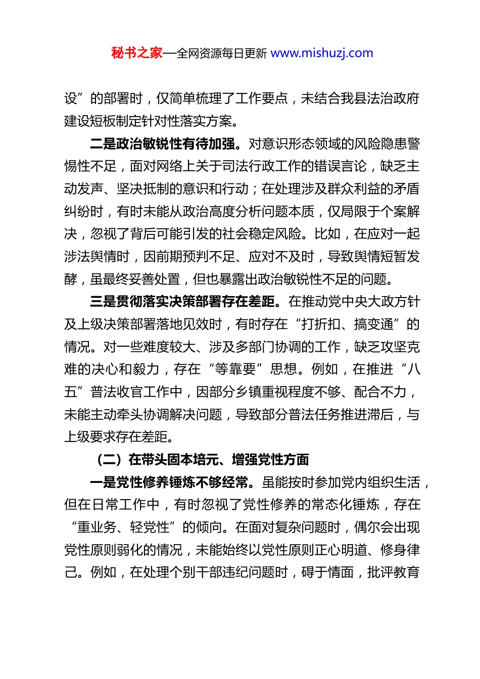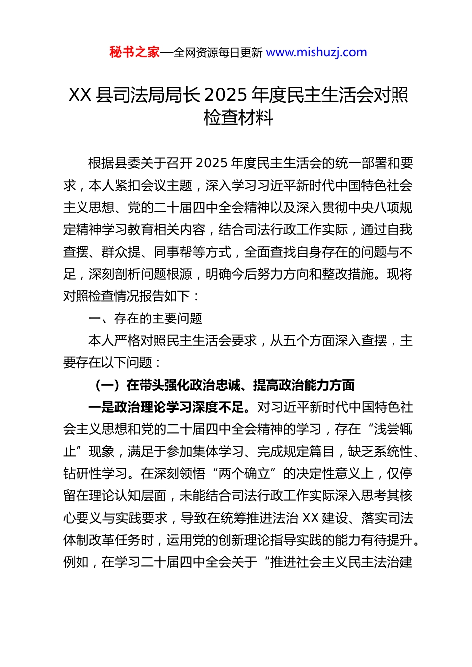 秘书之家—全网资源每日更新 www.mishuzj.comXX 县司法局局长 2025 年度民主生活会对照检查材料根据县委关于召开 2025 年度民主生活会的统一部署和要求,本人紧扣会议主题,深入学习习近平新时代中国特色社会主义思想、党的二十届四中全会精神以及深入贯彻中央八项规定精神学习教育相关内容,结合司法行政工作实际,通过自我查摆、群众提、同事帮等方式,全面查找自身存在的问题与不足,深刻剖析问题根源,明确今后努力方向和整改措施。现将对照检查情况报告如下:一、存在的主要问题本人严格对照民主生活会要求,从五个方面深入查摆,主要存在以下问题:(一)在带头强化政治忠诚、提高政治能力方面一是政治理论学习深度不足。对习近平新时代中国特色社会主义思想和党的二十届四中全会精神的学习,存在“浅尝辄止”现象,满足于参加集体学习、完成规定篇目,缺乏系统性、钻研性学习。在深刻领悟“两个确立”的决定性意义上,仅停留在理论认知层面,未能结合司法行政工作实际深入思考其核心要义与实践要求,导致在统筹推进法治 XX 建设、落实司法体制改革任务时,运用党的创新理论指导实践的能力有待提升。例如,在学习二十届四中全会关于“推进社会主义民主法治建秘书之家—全网资源每日更新 www.mishuzj.com设”的部署时,仅简单梳理了工作要点,未结合我县法治政府建设短板制定针对性落实方案。二是政治敏锐性有待加强。对意识形态领域的风险隐患警惕性不足,面对网络上关于司法行政工作的错误言论,缺乏主动发声、坚决抵制的意识和行动;在处理涉及群众利益的矛盾纠纷时,有时未能从政治高度分析问题本质,仅局限于个案解决,忽视了背后可能引发的社会稳定风险。比如,在应对一起涉法舆情时,因前期预判不足、应对不及时,导致舆情短暂发酵,虽最终妥善处置,但也暴露出政治敏锐性不足的问题。三是贯彻落实决策部署存在差距。在推动党中央大政方针及上级决策部署落地见效时,有时存在“打折扣、搞变通”的情况。对一些难度较大、涉及多部门协调的工作,缺乏攻坚克难的决心和毅力,存在“等靠要”思想。例如,在推进“八五”普法收官工作中,因部分乡镇重视程度不够、配合不力,未能主动牵头协调解决问题,导致部分普法任务推进滞后,与上级要求存在差距。(二)在带头固本培元、增强党性方面一是党性修养锤炼不够经常。虽能按时参加党内组织生活,但在日常工作中,有时忽视了党性修养的常态化锤炼,存在“重业务、轻党性”的倾向。在面对复杂问题时,偶尔会出现党性原则弱化的情况,未能始终以党性原则正心明道、修身律己。例如,在处理个别干部违纪问题时,碍于情面,批评教育秘书之家—全网资源每日更新 www.mishuzj.com多、严肃处理少,未能充分发挥纪律的惩戒和警示作用。二是党章党规党纪学习不扎实。对党章党规党纪的学习缺乏系统性,对新修订的纪律处分条例等重要法规,仅满足于知晓基本内容,未能深入钻研其立法本意和适用要求。在日常工作中,未能严格以党章党规党纪约束自身言行,存在“小节不拘”的思想,比如在公务接待中,偶尔存在超标准陪同的情况,违背了廉洁自律的相关要求。三是理想信念与实际工作结合不紧密。在坚守共产党人精神追求、解决“三观”总开关问题上,存在理论与实践脱节的现象。虽然口头强调要坚定理想信念、厚植为民情怀,但在实际工作中,有时未能站在群众立场思考问题,对群众反映强烈的法律服务需求回应不够及时。例如,对偏远乡镇法律援助资源不足的问题,虽有了解,但未能及时推动制定有效解决方案,导致部分群众维权困难。(三)在带头敬畏人民、敬畏组织、敬畏法纪方面一是践行群众路线不够深入。落实“四下基层”制度不到位,深入乡镇、社区、企业调研频次不足,且调研存在“走马观花”现象,未能真正倾听群众心声、掌握实际情况。对人民群众急难愁盼的法律服务问题,如医患纠纷、劳动争议等领域的法律援助需求,了解不够全面,解决措施缺乏针对性。例如,在开展“法律明白人”培育工作中,未能充分结合群众实际需求制定培训内容,导致培训效果不佳。秘书之家—全网资源每日更新 www.mishuzj.com二是民主集中制执行不够严格...