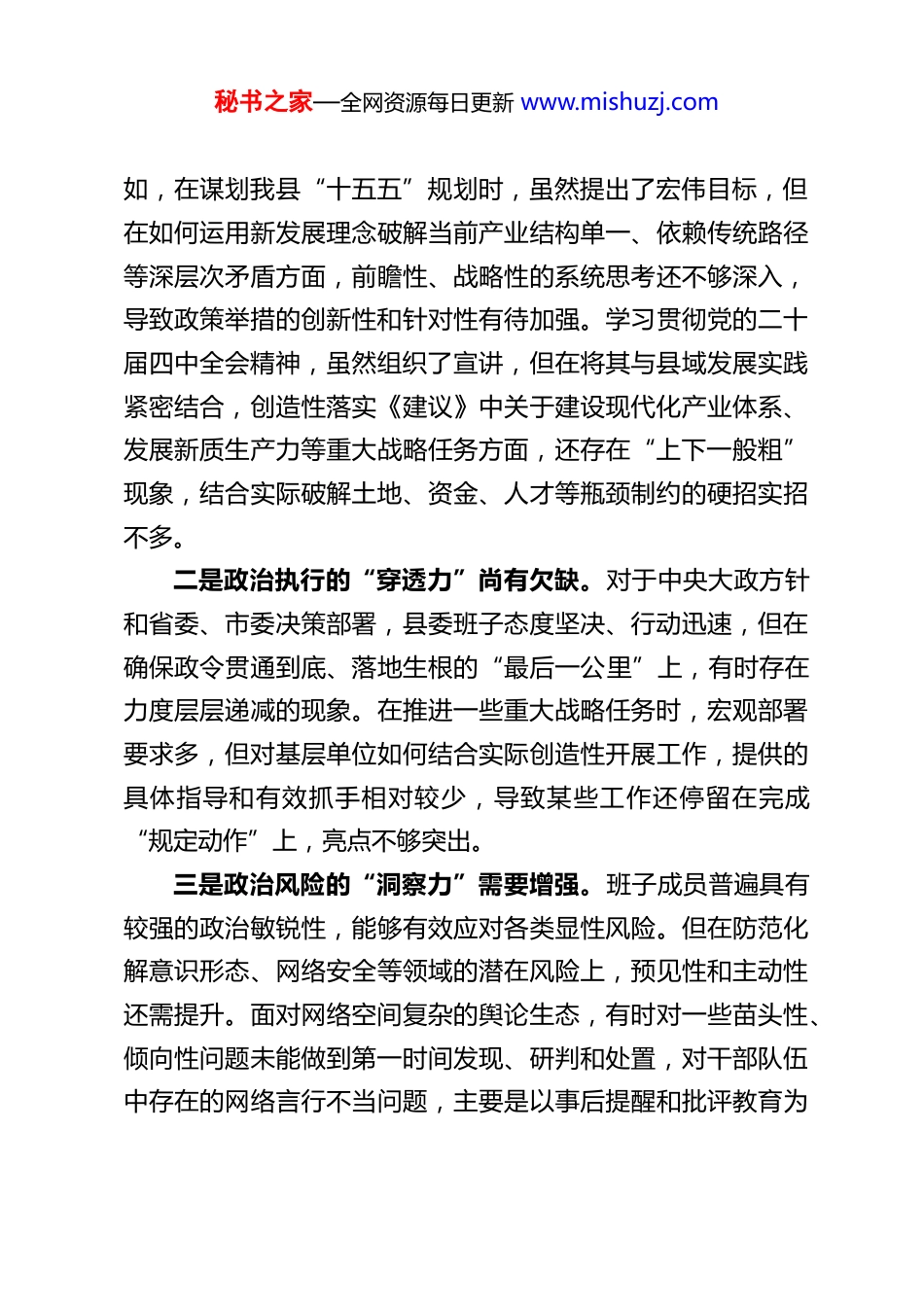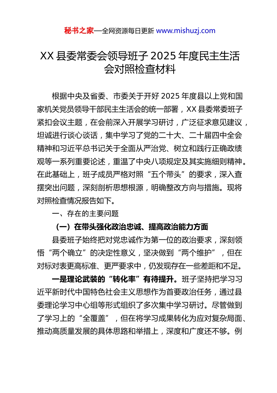 秘书之家—全网资源每日更新 www.mishuzj.comXX 县委常委会领导班子 2025 年度民主生活会对照检查材料根据中央及省委、市委关于开好 2025 年度县以上党和国家机关党员领导干部民主生活会的统一部署,XX 县委常委班子紧扣会议主题,在会前深入开展学习研讨,广泛征求意见建议,坦诚进行谈心谈话,集中学习了党的二十大、二十届四中全会精神和习近平总书记关于全面从严治党、树立和践行正确政绩观等一系列重要论述,重温了中央八项规定及其实施细则精神。在此基础上,班子成员严格对照“五个带头”的要求,深入查摆突出问题,深刻剖析思想根源,明确整改方向与措施。现将对照检查情况报告如下。一、存在的主要问题(一)在带头强化政治忠诚、提高政治能力方面县委班子始终把对党忠诚作为第一位的政治要求,深刻领悟“两个确立”的决定性意义,坚决做到“两个维护”,但在对标对表更高标准、更严要求中,仍发现存在一些差距和不足。一是理论武装的“转化率”有待提升。班子坚持把学习习近平新时代中国特色社会主义思想作为首要政治任务,通过县委理论学习中心组等形式组织了多次集中学习研讨。尽管做到了学习上的“全覆盖”,但在将学习成果转化为应对复杂局面、推动高质量发展的具体思路和举措上,深度和广度还不够。例秘书之家—全网资源每日更新 www.mishuzj.com如,在谋划我县“十五五”规划时,虽然提出了宏伟目标,但在如何运用新发展理念破解当前产业结构单一、依赖传统路径等深层次矛盾方面,前瞻性、战略性的系统思考还不够深入,导致政策举措的创新性和针对性有待加强。学习贯彻党的二十届四中全会精神,虽然组织了宣讲,但在将其与县域发展实践紧密结合,创造性落实《建议》中关于建设现代化产业体系、发展新质生产力等重大战略任务方面,还存在“上下一般粗”现象,结合实际破解土地、资金、人才等瓶颈制约的硬招实招不多。二是政治执行的“穿透力”尚有欠缺。对于中央大政方针和省委、市委决策部署,县委班子态度坚决、行动迅速,但在确保政令贯通到底、落地生根的“最后一公里”上,有时存在力度层层递减的现象。在推进一些重大战略任务时,宏观部署要求多,但对基层单位如何结合实际创造性开展工作,提供的具体指导和有效抓手相对较少,导致某些工作还停留在完成“规定动作”上,亮点不够突出。三是政治风险的“洞察力”需要增强。班子成员普遍具有较强的政治敏锐性,能够有效应对各类显性风险。但在防范化解意识形态、网络安全等领域的潜在风险上,预见性和主动性还需提升。面对网络空间复杂的舆论生态,有时对一些苗头性、倾向性问题未能做到第一时间发现、研判和处置,对干部队伍中存在的网络言行不当问题,主要是以事后提醒和批评教育为秘书之家—全网资源每日更新 www.mishuzj.com主,未能建立起一套行之有效的常态化引导和规范机制。(二)在带头固本培元、增强党性方面县委班子始终坚持把加强党性修养作为终身课题,但深刻反思,党性锤炼仍未达到炉火纯青的境界。一是理想信念的“压舱石”作用发挥不充分。在日常工作中,班子成员能够坚定共产主义远大理想和中国特色社会主义共同理想。但在面对繁重的发展任务和巨大的工作压力时,偶尔会不自觉地将更多精力投入到抓经济指标、推项目建设等具体事务中,相对放松了对世界观、人生观、价值观这个“总开关”的经常性审视和改造。这种“重事功、轻内省”的倾向,在一定程度上影响了党性修养的持续深化。二是党内政治生活的“熔炉”作用有待加强。班子严格执行民主生活会、组织生活会等制度,但在开展批评和自我批评时,有时还存在“辣味”不足的现象。自我批评时,谈工作问题多、谈思想根源少;相互批评时,提希望建议多、点要害问题少,存在一定的“你好我好大家好”的倾向,使得党内政治生活锤炼党性、修正错误、增进团结的政治功能未能得到最充分的发挥。三是纪律规矩的“高压线”意识需时刻绷紧。班子成员能够带头学习党章党规党纪,但在抓常抓长、防微杜渐上还存在薄弱环节。从我县近年来查处的一些违纪违法案件来看,反映出班子在推动纪律教育入脑入心、抓实干部日常监督管理方面,秘书之家—全网资...