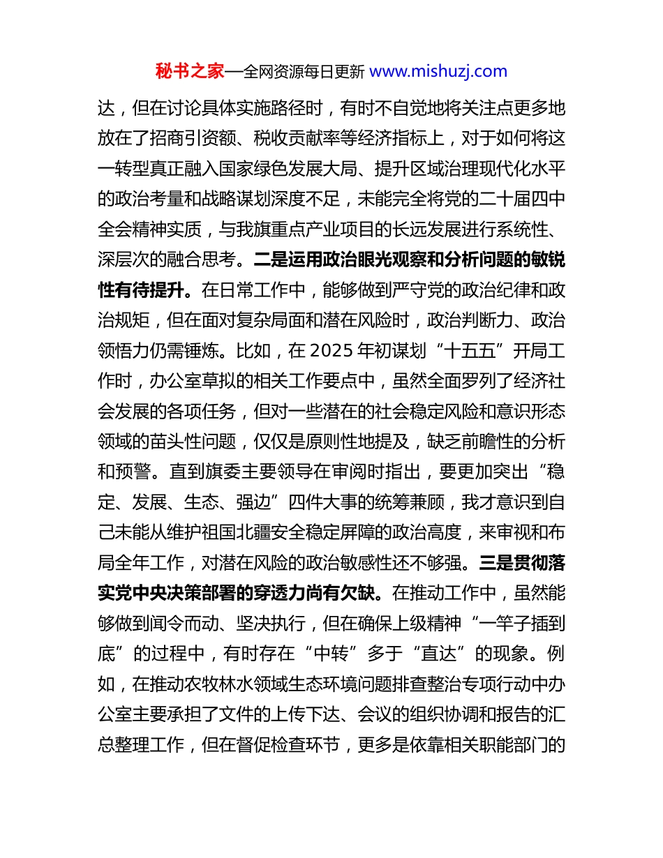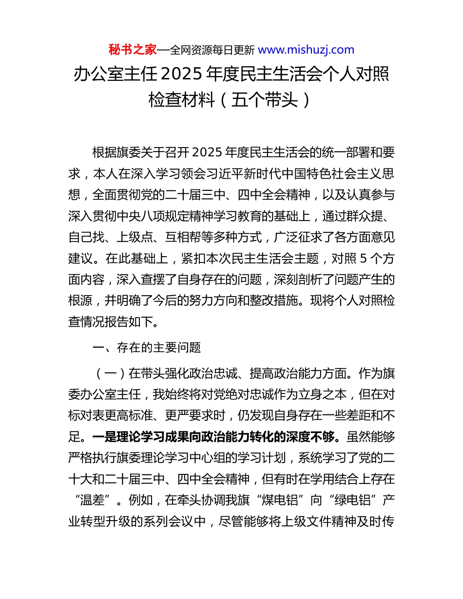 秘书之家—全网资源每日更新 www.mishuzj.com办公室主任 2025 年度民主生活会个人对照检查材料(五个带头)根据旗委关于召开 2025 年度民主生活会的统一部署和要求,本人在深入学习领会习近平新时代中国特色社会主义思想,全面贯彻党的二十届三中、四中全会精神,以及认真参与深入贯彻中央八项规定精神学习教育的基础上,通过群众提、自己找、上级点、互相帮等多种方式,广泛征求了各方面意见建议。在此基础上,紧扣本次民主生活会主题,对照 5 个方面内容,深入查摆了自身存在的问题,深刻剖析了问题产生的根源,并明确了今后的努力方向和整改措施。现将个人对照检查情况报告如下。一、存在的主要问题(一)在带头强化政治忠诚、提高政治能力方面。作为旗委办公室主任,我始终将对党绝对忠诚作为立身之本,但在对标对表更高标准、更严要求时,仍发现自身存在一些差距和不足。一是理论学习成果向政治能力转化的深度不够。虽然能够严格执行旗委理论学习中心组的学习计划,系统学习了党的二十大和二十届三中、四中全会精神,但有时在学用结合上存在“温差”。例如,在牵头协调我旗“煤电铝”向“绿电铝”产业转型升级的系列会议中,尽管能够将上级文件精神及时传秘书之家—全网资源每日更新 www.mishuzj.com达,但在讨论具体实施路径时,有时不自觉地将关注点更多地放在了招商引资额、税收贡献率等经济指标上,对于如何将这一转型真正融入国家绿色发展大局、提升区域治理现代化水平的政治考量和战略谋划深度不足,未能完全将党的二十届四中全会精神实质,与我旗重点产业项目的长远发展进行系统性、深层次的融合思考。二是运用政治眼光观察和分析问题的敏锐性有待提升。在日常工作中,能够做到严守党的政治纪律和政治规矩,但在面对复杂局面和潜在风险时,政治判断力、政治领悟力仍需锤炼。比如,在 2025 年初谋划“十五五”开局工作时,办公室草拟的相关工作要点中,虽然全面罗列了经济社会发展的各项任务,但对一些潜在的社会稳定风险和意识形态领域的苗头性问题,仅仅是原则性地提及,缺乏前瞻性的分析和预警。直到旗委主要领导在审阅时指出,要更加突出“稳定、发展、生态、强边”四件大事的统筹兼顾,我才意识到自己未能从维护祖国北疆安全稳定屏障的政治高度,来审视和布局全年工作,对潜在风险的政治敏感性还不够强。三是贯彻落实党中央决策部署的穿透力尚有欠缺。在推动工作中,虽然能够做到闻令而动、坚决执行,但在确保上级精神“一竿子插到底”的过程中,有时存在“中转”多于“直达”的现象。例如,在推动农牧林水领域生态环境问题排查整治专项行动中办公室主要承担了文件的上传下达、会议的组织协调和报告的汇总整理工作,但在督促检查环节,更多是依靠相关职能部门的秘书之家—全网资源每日更新 www.mishuzj.com汇报材料来掌握进度,亲自深入嘎查村、田间地头一线去核实整治效果、倾听群众反馈的次数不多,导致对一些深层次、隐蔽性问题的了解不够透彻,影响了决策部署落实的最终成效。(二)在带头固本培元、增强党性方面。我深知党性修养是共产党人的终身课题,时刻注重加强自身党性锻炼,但在“吾日三省吾身”的自我革命精神上,还做得不够彻底。一是理想信念的“压舱石”作用发挥不够充分。尽管能够做到在大是大非面前旗帜鲜明,但在面对日常繁重的工作压力时,有时会不自觉地陷入事务主义,导致对世界观、人生观、价值观这个“总开关”问题的深入思考和持续校准有所放松。比如,在参与组织全旗范围内的党的二十届四中全会精神专题轮训班期间,我将更多精力放在了课程安排、后勤保障等具体事务上,确保了培训的顺利进行,但对自己作为一名党员领导干部,如何在思想深处真正实现对全会精神的内化于心、外化于行,如何从党的创新理论中汲取改造主观世界的精神力量,思考得不够深入,存在以事务性工作的忙碌代替思想政治的淬炼的倾向。二是党章党规党纪的学习遵守未能完全融入日常。能够做到在重要节点和关键时刻严守纪律底线,但在将党章党规党纪的要求转化为日常言行的思维习惯和行动自觉上还有差距。例如,在主持办公室内部会议时,虽然议事规则和流程是...