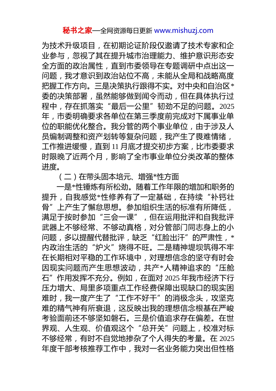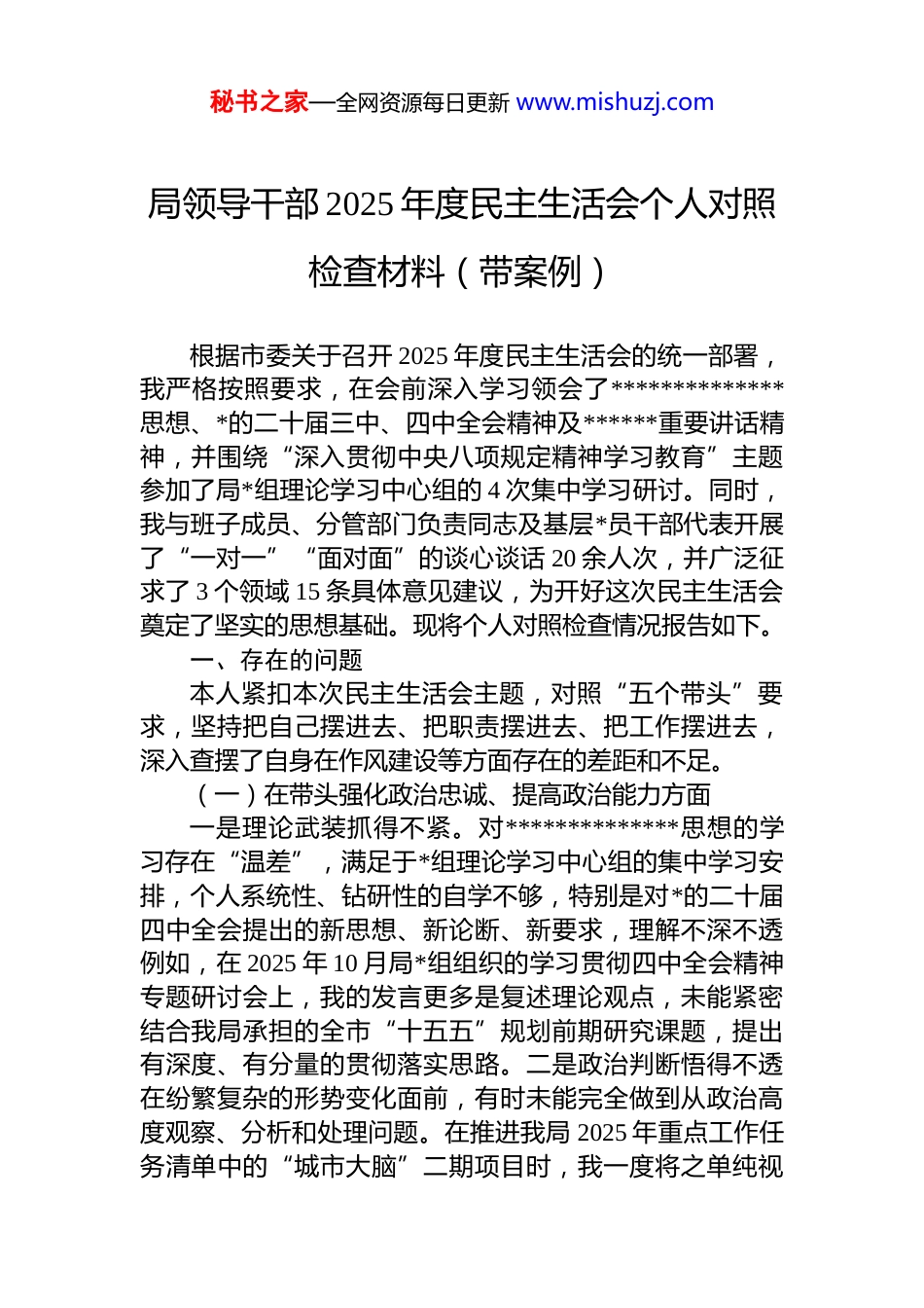 秘书之家—全网资源每日更新 www.mishuzj.com局领导干部 2025 年度民主生活会个人对照检查材料(带案例)根据市委关于召开 2025 年度民主生活会的统一部署,我严格按照要求,在会前深入学习领会了**************思想、*的二十届三中、四中全会精神及******重要讲话精神,并围绕“深入贯彻中央八项规定精神学习教育”主题参加了局*组理论学习中心组的 4 次集中学习研讨。同时,我与班子成员、分管部门负责同志及基层*员干部代表开展了“一对一”“面对面”的谈心谈话 20 余人次,并广泛征求了 3 个领域 15 条具体意见建议,为开好这次民主生活会奠定了坚实的思想基础。现将个人对照检查情况报告如下。一、存在的问题本人紧扣本次民主生活会主题,对照“五个带头”要求,坚持把自己摆进去、把职责摆进去、把工作摆进去,深入查摆了自身在作风建设等方面存在的差距和不足。(一)在带头强化政治忠诚、提高政治能力方面一是理论武装抓得不紧。对**************思想的学习存在“温差”,满足于*组理论学习中心组的集中学习安排,个人系统性、钻研性的自学不够,特别是对*的二十届四中全会提出的新思想、新论断、新要求,理解不深不透例如,在 2025 年 10 月局*组组织的学习贯彻四中全会精神专题研讨会上,我的发言更多是复述理论观点,未能紧密结合我局承担的全市“十五五”规划前期研究课题,提出有深度、有分量的贯彻落实思路。二是政治判断悟得不透在纷繁复杂的形势变化面前,有时未能完全做到从政治高度观察、分析和处理问题。在推进我局 2025 年重点工作任务清单中的“城市大脑”二期项目时,我一度将之单纯视秘书之家—全网资源每日更新 www.mishuzj.com为技术升级项目,在初期论证阶段仅邀请了技术专家和企业参与,忽视了其在提升城市治理能力、维护意识形态安全方面的政治属性,直到市委领导在专题调研中点出这一问题,我才意识到政治站位不高,未能从全局和战略高度把握工作方向。三是决策执行跟得不实。对中央和自治区*委的决策部署,虽然能够做到闻令而动,但在具体执行过程中,存在抓落实“最后一公里”韧劲不足的问题。2025年,市委明确要求各单位在第三季度前完成对下属事业单位的职能优化整合。我分管的两个事业单位,由于涉及人员编制调整和资产划转等复杂问题,我产生了畏难情绪,工作推进缓慢,直到 11 月底才提交初步方案,比市委要求时限晚了近两个月,影响了全市事业单位分类改革的整体进度。(二)在带头固本培元、增强*性方面一是*性锤炼有所松劲。随着工作年限的增加和职务的提升,自我感觉*性修养有了一定基础,在持续“补钙壮骨”上产生了懈怠思想。参加组织生活的标准有所降低,满足于按时参加“三会一课”,但在运用批评和自我批评武器上不够经常、不够动真格,对分管部门同志身上的小问题,多以提醒代替批评,缺乏“红脸出汗”的严肃性,*内政治生活的“炉火”烧得不旺。二是精神堤坝筑得不牢在长期相对平稳的工作环境中,对理想信念的坚守有时会因现实问题而产生思想波动,共产*人精神追求的“压舱石”作用发挥不充分。例如,在面对 2025 年我市经济下行压力增大、局里多项重点工作经费保障出现缺口的现实困难时,我一度产生了“工作不好干”的消极念头,攻坚克难的精气神有所衰退,这反映出我的理想信念根基在严峻考验面前还不够坚如磐石。三是价值追求存在偏差。在世界观、人生观、价值观这个“总开关”问题上,校准对标不够经常,有时不自觉地掺杂了个人得失的考量。在 2025年度干部考核推荐工作中,我对一名业务能力突出但性格秘书之家—全网资源每日更新 www.mishuzj.com比较耿直、曾当面顶撞过我的干部,在推荐使用上有所犹豫,虽然最终还是客观公正地进行了推荐,但这个思想斗争的过程,说明我的个人胸襟和以事业为重的价值追求还存在提升空间。(三)在带头敬畏人民、敬畏组织、敬畏法纪方面一是群众观念树得不稳。落实“四下基层”制度不扎实,下基层调研存在“走马观花”现象。2025 年,我累计下基层调研 12 次,但真正带着问题、深入一线解剖麻雀式地调研仅有 2 次。比如在 7 月份就“优化公共服务供给”课...