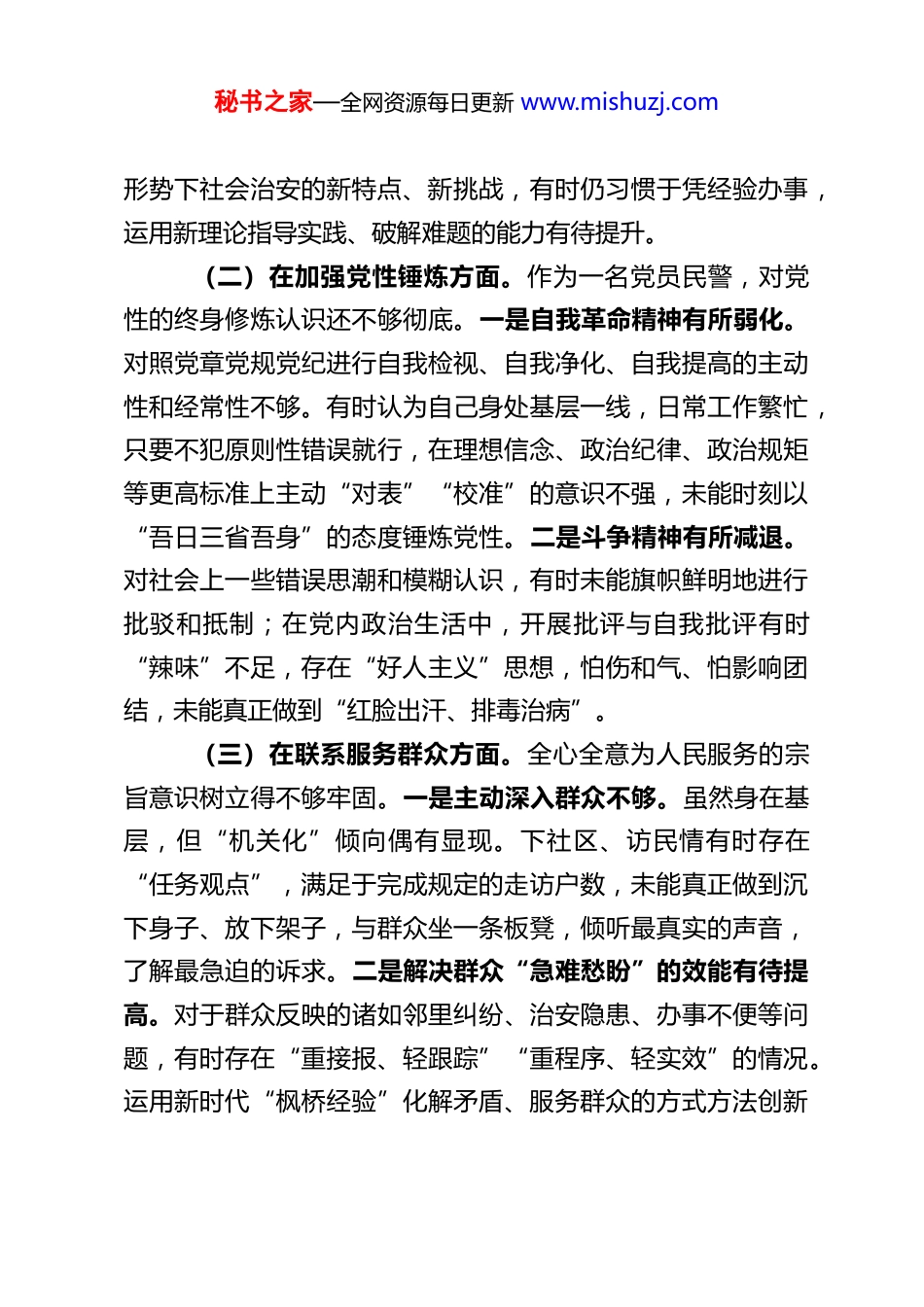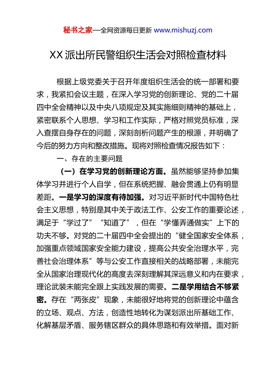 秘书之家—全网资源每日更新 www.mishuzj.comXX 派出所民警组织生活会对照检查材料根据上级党委关于召开年度组织生活会的统一部署和要求,我紧扣会议主题,在深入学习党的创新理论、党的二十届四中全会精神以及中央八项规定及其实施细则精神的基础上,紧密联系个人思想、学习和工作实际,严格对照党员标准,深入查摆自身存在的问题,深刻剖析问题产生的根源,并明确了今后的努力方向和整改措施。现将对照检查情况报告如下:一、存在的主要问题(一)在学习党的创新理论方面。虽然能够坚持参加集体学习并进行个人自学,但在系统把握、融会贯通上仍有明显差距。一是学习的深度有待加强。对习近平新时代中国特色社会主义思想,特别是其中关于政法工作、公安工作的重要论述,满足于“学过了”“知道了”,但在“学懂弄通做实”上下的功夫不够。对党的二十届四中全会提出的“健全国家安全体系,加强重点领域国家安全能力建设,提高公共安全治理水平,完善社会治理体系”等与公安工作直接相关的战略部署,未能完全从国家治理现代化的高度去深刻理解其深远意义和内在要求,理论武装未能完全跟上实践发展的需要。二是学用结合不够紧密。存在“两张皮”现象,未能很好地将党的创新理论中蕴含的立场、观点、方法,创造性地转化为谋划派出所基础工作、化解基层矛盾、服务辖区群众的具体思路和有效举措。面对新秘书之家—全网资源每日更新 www.mishuzj.com形势下社会治安的新特点、新挑战,有时仍习惯于凭经验办事,运用新理论指导实践、破解难题的能力有待提升。(二)在加强党性锤炼方面。作为一名党员民警,对党性的终身修炼认识还不够彻底。一是自我革命精神有所弱化。对照党章党规党纪进行自我检视、自我净化、自我提高的主动性和经常性不够。有时认为自己身处基层一线,日常工作繁忙,只要不犯原则性错误就行,在理想信念、政治纪律、政治规矩等更高标准上主动“对表”“校准”的意识不强,未能时刻以“吾日三省吾身”的态度锤炼党性。二是斗争精神有所减退。对社会上一些错误思潮和模糊认识,有时未能旗帜鲜明地进行批驳和抵制;在党内政治生活中,开展批评与自我批评有时“辣味”不足,存在“好人主义”思想,怕伤和气、怕影响团结,未能真正做到“红脸出汗、排毒治病”。(三)在联系服务群众方面。全心全意为人民服务的宗旨意识树立得不够牢固。一是主动深入群众不够。虽然身在基层,但“机关化”倾向偶有显现。下社区、访民情有时存在“任务观点”,满足于完成规定的走访户数,未能真正做到沉下身子、放下架子,与群众坐一条板凳,倾听最真实的声音,了解最急迫的诉求。二是解决群众“急难愁盼”的效能有待提高。对于群众反映的诸如邻里纠纷、治安隐患、办事不便等问题,有时存在“重接报、轻跟踪”“重程序、轻实效”的情况。运用新时代“枫桥经验”化解矛盾、服务群众的方式方法创新秘书之家—全网资源每日更新 www.mishuzj.com不足,未能完全做到“民有所呼、我有所应”,与群众期待的“家门口的派出所”还有距离。(四)在发挥先锋模范作用方面。对照党员民警的先进标准,冲锋在前、示范引领作用发挥不充分。一是在攻坚克难上担当作为有欠缺。面对派出所工作中一些历史遗留的“硬骨头”或需要多方协调的复杂案件、事件时,有时存在畏难情绪和“等靠要”思想,主动“揭榜挂帅”、迎难而上的劲头不足。二是日常工作中的标杆作用不突出。满足于完成领导交办的任务和本职工作,但在“主动想事、积极干事、努力成事”上标准不高。在警务技能提升、执法规范化建设、智慧警务应用等方面,刻苦钻研、精益求精的精神有所懈怠,未能时时处处以“排头兵”的标准要求自己,带动身边同事共同进步的意识和行动不够。(五)在改作风树新风方面。对照中央八项规定精神及其实施细则的要求,以及全党正在开展的深入贯彻中央八项规定精神学习教育活动部署,自身作风建设仍有短板。一是形式主义、官僚主义仍有残留。例如,在撰写部分工作汇报、台账记录时,有时过于强调形式规范,而在内容实效上思考不深;在落实上级部署时,偶尔存在简单传达、机械执行的情况,未能紧密结合辖区实际进行创造性...