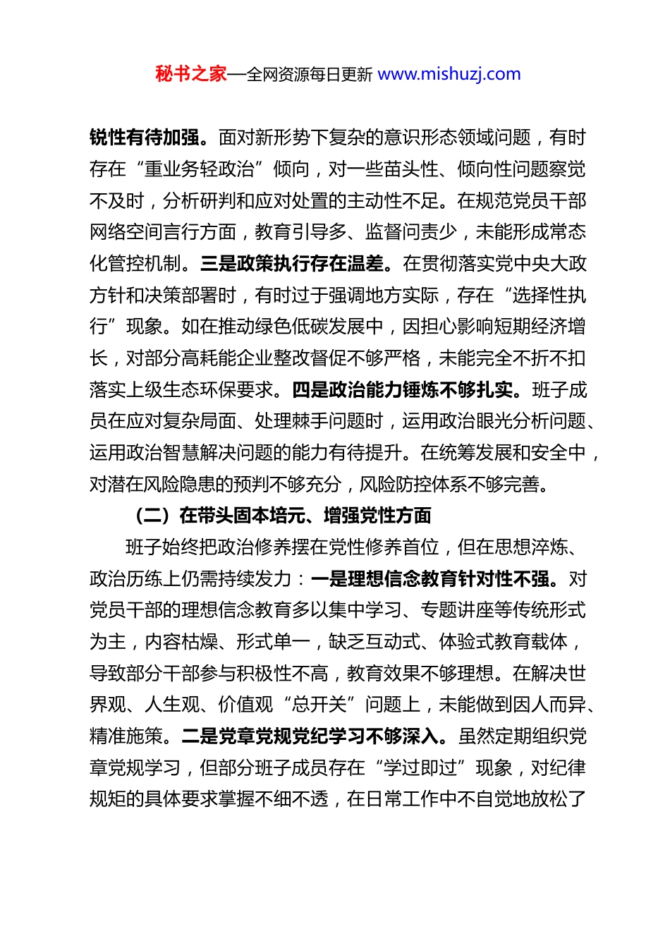 秘书之家—全网资源每日更新 www.mishuzj.comXX 市委领导班子 2025 年度民主生活会对照检查材料根据中央和省委关于召开 2025 年度民主生活会的统一部署,XX 市委领导班子紧扣会议主题,深入学习贯彻习近平新时代中国特色社会主义思想和党的二十届四中全会精神,扎实开展深入贯彻中央八项规定精神学习教育,通过群众提、自己找、上级点、互相帮等方式,全面查摆问题、深刻剖析根源,明确了今后努力方向和整改措施。现将对照检查情况报告如下:一、存在的主要问题市委领导班子始终坚持问题导向,聚焦五个重点方面深入查摆,发现存在以下突出问题:(一)在带头强化政治忠诚、提高政治能力方面班子成员深刻领悟“两个确立”的决定性意义,始终把“两个维护”作为最高政治原则,但对照更高标准仍有差距:一是政治理论转化实效不足。对习近平新时代中国特色社会主义思想和党的二十届四中全会精神的学习多停留在会议传达、文件解读层面,结合 XX 实际谋划贯彻落实的深度不够,将制度优势转化为治理效能的具体举措不够精准。如在推进基层治理体系和治理能力现代化建设中,对全会提出的“统筹推进各领域基层党组织建设”要求,缺乏系统性制度设计,部分乡镇(街道)治理仍存在权责不清、协同不畅等问题。二是政治敏秘书之家—全网资源每日更新 www.mishuzj.com锐性有待加强。面对新形势下复杂的意识形态领域问题,有时存在“重业务轻政治”倾向,对一些苗头性、倾向性问题察觉不及时,分析研判和应对处置的主动性不足。在规范党员干部网络空间言行方面,教育引导多、监督问责少,未能形成常态化管控机制。三是政策执行存在温差。在贯彻落实党中央大政方针和决策部署时,有时过于强调地方实际,存在“选择性执行”现象。如在推动绿色低碳发展中,因担心影响短期经济增长,对部分高耗能企业整改督促不够严格,未能完全不折不扣落实上级生态环保要求。四是政治能力锤炼不够扎实。班子成员在应对复杂局面、处理棘手问题时,运用政治眼光分析问题、运用政治智慧解决问题的能力有待提升。在统筹发展和安全中,对潜在风险隐患的预判不够充分,风险防控体系不够完善。(二)在带头固本培元、增强党性方面班子始终把政治修养摆在党性修养首位,但在思想淬炼、政治历练上仍需持续发力:一是理想信念教育针对性不强。对党员干部的理想信念教育多以集中学习、专题讲座等传统形式为主,内容枯燥、形式单一,缺乏互动式、体验式教育载体,导致部分干部参与积极性不高,教育效果不够理想。在解决世界观、人生观、价值观“总开关”问题上,未能做到因人而异、精准施策。二是党章党规党纪学习不够深入。虽然定期组织党章党规学习,但部分班子成员存在“学过即过”现象,对纪律规矩的具体要求掌握不细不透,在日常工作中不自觉地放松了秘书之家—全网资源每日更新 www.mishuzj.com对自身的要求。如在公务接待中,偶尔存在超标准陪同、细节不够规范等问题,反映出对纪律规矩的敬畏之心不够强烈。三是党性锤炼常态化不足。班子成员忙于日常事务,主动加强党性锻炼的意识不够,在重大任务、关键时刻的政治担当和斗争精神有待加强。在推进改革发展中的难点工作时,有时存在畏难情绪,缺乏“逢山开路、遇水架桥”的闯劲和韧劲。四是为民情怀树得不牢。部分班子成员深入基层、联系群众不够紧密,对群众的所思所想所盼了解不够全面,在解决群众急难愁盼问题上存在“等靠要”思想,主动服务意识不足。(三)在带头敬畏人民、敬畏组织、敬畏法纪方面班子始终坚守人民立场、严守组织纪律,但对照新时代要求仍有明显短板:一是群众路线践行不够扎实。落实“四下基层”制度不够常态化,存在“走马观花”式调研,深入村屯社区、企业车间倾听群众心声不够,对群众反映强烈的教育、医疗、养老等民生问题,解决进度与群众期望存在差距。如针对老旧小区改造问题,因前期调研不充分,部分改造项目未能充分满足群众实际需求,导致群众满意度不高。二是民主集中制执行不够严格。在重大事项决策中,虽然坚持集体讨论决定,但有时存在“一把手”先表态定调的情况,其他班子成员发表不同意见的主动性不足,存在“随大流”...