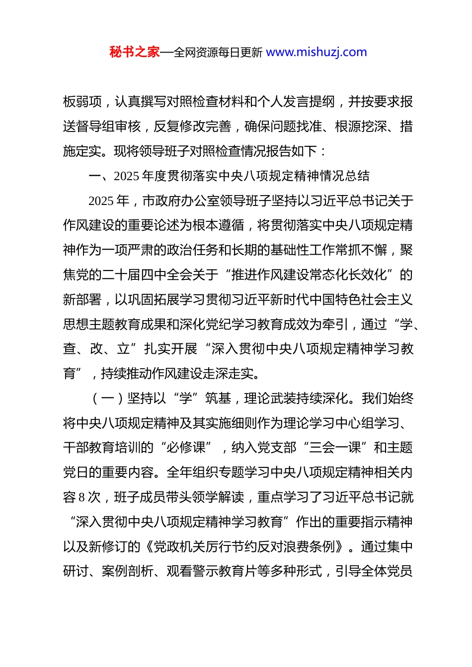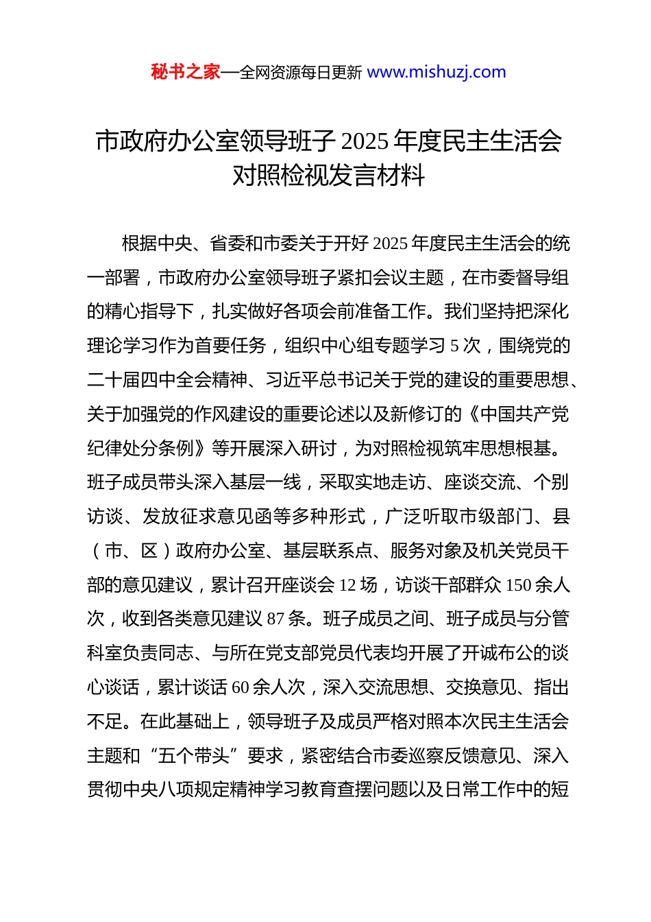秘书之家—全网资源每日更新 www.mishuzj.com市政府办公室领导班子 2025 年度民主生活会对照检视发言材料 根据中央、省委和市委关于开好 2025 年度民主生活会的统一部署,市政府办公室领导班子紧扣会议主题,在市委督导组的精心指导下,扎实做好各项会前准备工作。我们坚持把深化理论学习作为首要任务,组织中心组专题学习 5 次,围绕党的二十届四中全会精神、习近平总书记关于党的建设的重要思想、关于加强党的作风建设的重要论述以及新修订的《中国共产党纪律处分条例》等开展深入研讨,为对照检视筑牢思想根基。班子成员带头深入基层一线,采取实地走访、座谈交流、个别访谈、发放征求意见函等多种形式,广泛听取市级部门、县(市、区)政府办公室、基层联系点、服务对象及机关党员干部的意见建议,累计召开座谈会 12 场,访谈干部群众 150 余人次,收到各类意见建议 87 条。班子成员之间、班子成员与分管科室负责同志、与所在党支部党员代表均开展了开诚布公的谈心谈话,累计谈话 60 余人次,深入交流思想、交换意见、指出不足。在此基础上,领导班子及成员严格对照本次民主生活会主题和“五个带头”要求,紧密结合市委巡察反馈意见、深入贯彻中央八项规定精神学习教育查摆问题以及日常工作中的短秘书之家—全网资源每日更新 www.mishuzj.com板弱项,认真撰写对照检查材料和个人发言提纲,并按要求报送督导组审核,反复修改完善,确保问题找准、根源挖深、措施定实。现将领导班子对照检查情况报告如下:一、2025 年度贯彻落实中央八项规定精神情况总结2025 年,市政府办公室领导班子坚持以习近平总书记关于作风建设的重要论述为根本遵循,将贯彻落实中央八项规定精神作为一项严肃的政治任务和长期的基础性工作常抓不懈,聚焦党的二十届四中全会关于“推进作风建设常态化长效化”的新部署,以巩固拓展学习贯彻习近平新时代中国特色社会主义思想主题教育成果和深化党纪学习教育成效为牵引,通过“学、查、改、立”扎实开展“深入贯彻中央八项规定精神学习教育”,持续推动作风建设走深走实。(一)坚持以“学”筑基,理论武装持续深化。我们始终将中央八项规定精神及其实施细则作为理论学习中心组学习、干部教育培训的“必修课”,纳入党支部“三会一课”和主题党日的重要内容。全年组织专题学习中央八项规定精神相关内容 8 次,班子成员带头领学解读,重点学习了习近平总书记就“深入贯彻中央八项规定精神学习教育”作出的重要指示精神以及新修订的《党政机关厉行节约反对浪费条例》。通过集中研讨、案例剖析、观看警示教育片等多种形式,引导全体党员秘书之家—全网资源每日更新 www.mishuzj.com干部深刻认识“四风”问题的顽固性、反复性,准确把握新时代新征程上作风建设的政治内涵和实践要求,不断强化“不是要过关,而是要过硬”的思想自觉。我们紧密结合党纪学习教育,组织对《中国共产党纪律处分条例》中涉及违反中央八项规定精神条款的逐条学习,举办年轻干部、新提拔干部纪律作风专题培训班 2 期,覆盖 45 人次,切实筑牢拒腐防变的思想堤坝。(二)坚持以“查”破题,问题导向精准聚焦。我们坚决摒弃“走过场”心态,将发现问题、找准问题作为关键环节。对照中央八项规定精神各项要求,领导班子带头自查,各科室全面排查,重点围绕违规吃喝、违规收送礼品礼金、违规配备使用办公用房和公务用车、文山会海、督查检查考核过多过频等顽瘴痼疾。结合市委巡察反馈指出的“落实整治形式主义为基层减负不到位”等问题,我们主动将整治公文抄袭、调研考察形式主义等纳入重点查摆范围。通过设立意见箱、公开监督电话、梳理信访举报、分析审计报告等多种渠道,广泛收集问题线索。全年共梳理排查出涉及文风会风、调研接待、后勤管理等方面潜在风险点 15 个,对 3 起苗头性倾向性问题进行了提醒谈话,做到了查摆问题到边到角、不留死角。(三)坚持以“改”见效,动真碰硬纠治顽疾。我们坚持秘书之家—全网资源每日更新 www.mishuzj.com即知即改、立行立改与持续整改、建章立制相结合。针对查摆出的问题和巡察反馈意见,建立整改台账,实行清单化...