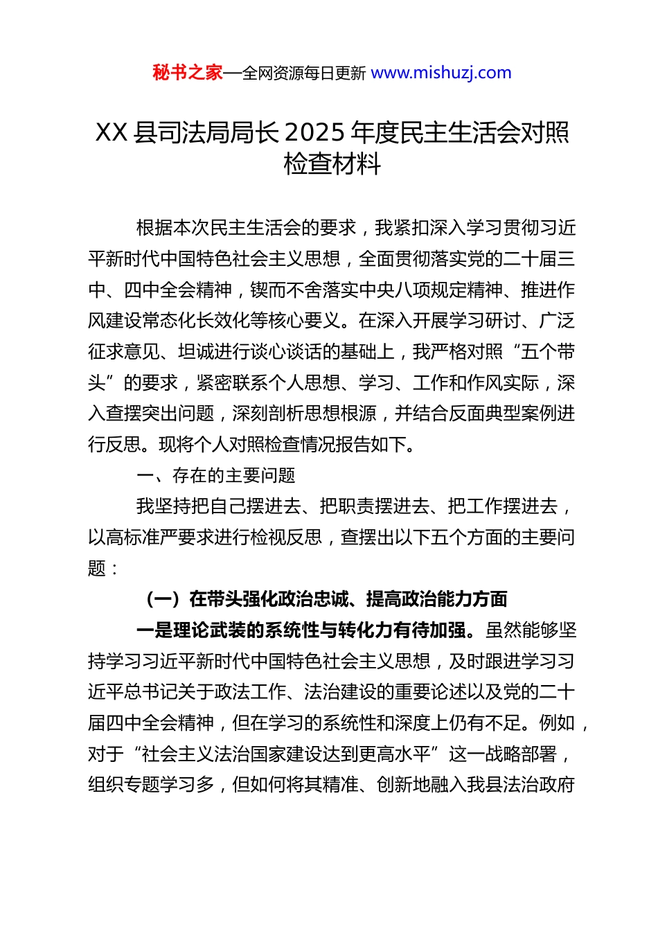 秘书之家—全网资源每日更新 www.mishuzj.comXX 县司法局局长 2025 年度民主生活会对照检查材料根据本次民主生活会的要求,我紧扣深入学习贯彻习近平新时代中国特色社会主义思想,全面贯彻落实党的二十届三中、四中全会精神,锲而不舍落实中央八项规定精神、推进作风建设常态化长效化等核心要义。在深入开展学习研讨、广泛征求意见、坦诚进行谈心谈话的基础上,我严格对照“五个带头”的要求,紧密联系个人思想、学习、工作和作风实际,深入查摆突出问题,深刻剖析思想根源,并结合反面典型案例进行反思。现将个人对照检查情况报告如下。一、存在的主要问题我坚持把自己摆进去、把职责摆进去、把工作摆进去,以高标准严要求进行检视反思,查摆出以下五个方面的主要问题:(一)在带头强化政治忠诚、提高政治能力方面一是理论武装的系统性与转化力有待加强。虽然能够坚持学习习近平新时代中国特色社会主义思想,及时跟进学习习近平总书记关于政法工作、法治建设的重要论述以及党的二十届四中全会精神,但在学习的系统性和深度上仍有不足。例如,对于“社会主义法治国家建设达到更高水平”这一战略部署,组织专题学习多,但如何将其精准、创新地融入我县法治政府秘书之家—全网资源每日更新 www.mishuzj.com建设示范创建、矛盾纠纷多元化解、公共法律服务体系建设等具体工作中,缺乏系统性的“施工图”和突破性的“新招数”,存在一定的“上下一般粗”现象。将宏大理论叙事转化为符合本地实际、可操作、能见效的实践路径的“桥”和“船”搭建得不够稳固。二是政治“三力”在复杂情境下的穿透性有待提升。能够坚决在思想上政治上行动上同以习近平同志为核心的党中央保持高度一致,但在面对司法行政领域日益复杂的新情况、新挑战时,从政治高度观察、分析、处置问题的敏锐性和能力尚有欠缺。比如,在牵头优化法治化营商环境工作中,更多关注于合同审查、法律咨询等具体业务,未能始终自觉地从服务全县高质量发展大局、巩固党的执政根基的政治维度,去顶层设计和整合律师、公证、人民调解等资源,未能完全做到将政治效果、社会效果、法律效果有机统一于每一项服务、每一起案件中。三是政治纪律规矩的内化践行标准有待提高。能够自觉遵守党的政治纪律和政治规矩,但在一些细节和“隐形”问题上,自我要求的标尺可以再拉高。例如,在组织党组理论学习中心组学习时,有时满足于完成“规定动作”,对学习内容的消化吸收、研讨交流的思想碰撞深度要求不够严,未能始终以“刨根问底”的精神探究理论背后的政治逻辑和实践要求。(二)在带头固本培元、增强党性方面一是党性修养的主动性、锤炼的经常性有所弱化。在大秘书之家—全网资源每日更新 www.mishuzj.com是大非面前能够保持清醒坚定,但在繁忙的事务性工作冲击下,有时不自觉地放松了党性锻炼的主动性和高标准,存在“抓业务见效快、抓修养见效慢”的模糊认识。未能时刻将强化理想信念、筑牢精神支柱贯穿于日常工作生活的全过程,对照党章党规党纪进行自我检视、自我净化、自我提高的“内驱力”不足。二是世界观、人生观、价值观“总开关”拧得不够紧。随着工作阅历增长,有时不自觉地产生了“歇歇脚”的想法,攻坚克难的锐气和艰苦奋斗的精神有所减退。在面对司法行政改革中的难点、堵点时,有时首先考虑的是现实困难和潜在风险,从理想信念中汲取的“敢教日月换新天”的奋斗精神不足,缺乏“功成不必在我,功成必定有我”的境界和担当。三是以党性原则修身律己的标尺不够严格。虽然注重个人品德修养,但在用纯粹的党性原则来正心明道、防微杜渐方面,警惕性还可以更高。例如,对社会上的一些不良风气和潜规则,有时虽能做到不参与,但缺乏旗帜鲜明地抵制和斗争的锐气;在弘扬共产党人高尚道德情操、自觉远离低级趣味方面,表率作用发挥得还不够充分。(三)在带头敬畏人民、敬畏组织、敬畏法纪方面一是践行群众路线、“四下基层”不够扎实深入。存在“坐机关”多、“跑基层”少的情况,虽然定期下基层,但“走马观花”式调研多,真正沉下去与群众面对面拉家常、心贴心解难题的时候少。对人民群众在法治领域的新需求、新期秘书之...