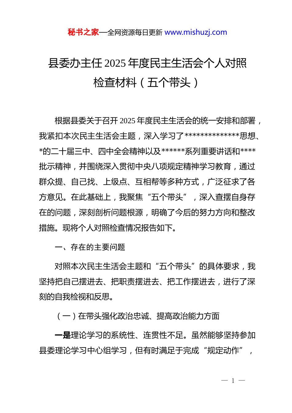 秘书之家—全网资源每日更新 www.mishuzj.com县委办主任 2025 年度民主生活会个人对照检查材料(五个带头)根据县委关于召开 2025 年度民主生活会的统一安排和部署,我紧扣本次民主生活会主题,深入学习了**************思想、*的二十届三中、四中全会精神以及******系列重要讲话和****批示精神,并围绕深入贯彻中央八项规定精神学习教育,通过群众提、自己找、上级点、互相帮等多种方式,广泛征求了各方意见。在此基础上,我聚焦“五个带头”,深入查摆自身存在的问题,深刻剖析问题根源,明确了今后的努力方向和整改措施。现将个人对照检查情况报告如下。一、存在的主要问题对照本次民主生活会主题和“五个带头”的具体要求,我坚持把自己摆进去、把职责摆进去、把工作摆进去,进行了深刻的自我检视和反思。(一)在带头强化政治忠诚、提高政治能力方面一是理论学习的系统性、连贯性不足。虽然能够坚持参加县委理论学习中心组学习,但有时满足于完成“规定动作”,— 1 —秘书之家—全网资源每日更新 www.mishuzj.com在学懂弄通做实**************思想上还存在差距。例如,在学习*的二十届四中全会的重大决策部署时,更多地停留在通读文件和会议精神层面,未能第一时间结合办公室“三服务”工作实际,系统思考如何将全会精神转化为优化办文办会办事流程、提升服务决策质效的具体方案和制度创新,导致学习成果向实践转化的效果不够理想。二是政治判断力、领悟力的敏锐性需进一步增强。作为县委的“坚强前哨”和“巩固后院”,对一些潜在的风险挑战预判不足。例如,去年在处理涉及我县某个重点项目推进过程中出现的网络负面声音时,我最初的关注点更多地放在了事件本身的事实核查和舆情应对上,对其背后可能关联的社会稳定风险、群众情绪疏导等政治层面的复杂性认识不够深刻,未能第一时间从维护全县政治安全和社会稳定大局的高度提出更为周全的应对预案,反映出从政治上看问题、想问题、作决策的能力仍需加强。三是贯彻执行上级决策部署存在结合不紧的问题。在推动中央和省、市委决策部署在**县落地落实的过程中,有时存在“上下一般粗”的现象,结合**县实际进行创造性落实的力度不够。比如,在根据上级要求起草关于推进乡村振兴战略的实— 2 —秘书之家—全网资源每日更新 www.mishuzj.com施意见时,初期稿件对上级文件精神的“翻译”多于“转化”,对**县不同乡镇的产业基础、资源禀赋等差异化实际情况研究不透,提出的措施针对性和可操作性还不够强,导致文件在指导实践时效果打了折扣。(二)在带头固本培元、增强*性方面一是*性锻炼的主动性、自觉性有所减弱。日常忙于大量的会务组织、文稿起草、督查督办等具体事务,静下心来反躬自省、加强*性修养的时间相对减少。有时以工作忙为借口,参加*支部组织生活不够积极主动,与支部*员的谈心谈话多是围绕工作,深入了解思想动态、帮助解决实际困难方面做得不够,未能完全做到以普通*员身份接受*组织的教育和监督。二是批评与自我批评的“辣味”不足。在民主生活会或组织生活会上,有时存在“好人主义”思想,批评同志时多是谈工作建议,怕伤和气、怕影响团结,没有真正做到“红脸出汗、排毒治病”。比如,在一次讨论办公室内部工作流程优化的会议上,对个别同志办事拖沓、效率不高的问题,我没有当面严厉指出,而是采取了比较委婉的方式提醒,导致问题未能得到及时有效的纠正。— 3 —秘书之家—全网资源每日更新 www.mishuzj.com三是艰苦奋斗的优良传统有所淡化。随着工作条件的改善,思想上不自觉地放松了对自己的严格要求。虽然能够严格遵守中央八项规定精神但在一些细节上做得还不够好。例如,在组织全县性大型会议时,有时会下意识地追求会场布置的“高标准”,对一些不必要的开支把关不严,虽然没有超标,但与“过紧日子”的要求相比,还有节约的空间。(三)在带头敬畏人民、敬畏组织、敬畏法纪方面一是调查研究存在“走马观花”现象。虽然经常下基层,但多数是陪同领导调研或开展专项督查真正带着问题、扑下身子、解剖麻雀式的深入调研较少。比如,去年在对全县“放管服”改革推进情况进行督查时,更多的...