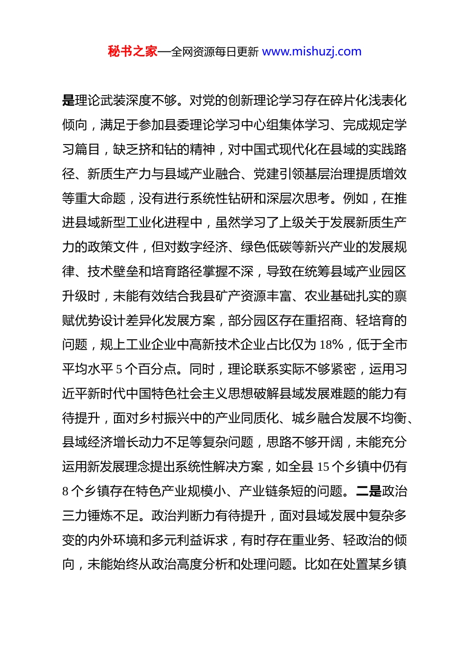 秘书之家—全网资源每日更新 www.mishuzj.com县委书记 2025 年度民主生活会对照检查发言材料 根据县委关于开好 2025 年度民主生活会统一部署要求,本人紧扣会议主题,聚焦“五个带头”核心内容,深入学习党的二十大及二十届三中、四中全会精神,认真领会习近平总书记关于党建引领基层治理、乡村振兴、民生保障、新质生产力发展等系列重要指示批示精神,系统研读《习近平著作选读》《习近平新时代中国特色社会主义思想专题摘编》等重要文献。通过广泛征求各级党组织、人大代表、政协委员、企业家代表和基层群众意见建议,与县委班子成员、各乡镇(街道)党(工)委书记、部分县直单位主要负责同志开展谈心谈话,结合县域发展和日常履职实际,全面查摆自身存在的问题不足,深刻剖析问题根源,明确整改方向和具体措施。现将对照检查情况报告如下。一、存在的主要问题(一)在带头强化政治忠诚、提高政治能力方面。本人始终把政治建设摆在县域发展和履职尽责的首位,坚决维护党中央权威和集中统一领导,但对照新时代党的建设总要求和县域高质量发展实际需要,在政治能力建设上仍存在明显差距。一秘书之家—全网资源每日更新 www.mishuzj.com是理论武装深度不够。对党的创新理论学习存在碎片化浅表化倾向,满足于参加县委理论学习中心组集体学习、完成规定学习篇目,缺乏挤和钻的精神,对中国式现代化在县域的实践路径、新质生产力与县域产业融合、党建引领基层治理提质增效等重大命题,没有进行系统性钻研和深层次思考。例如,在推进县域新型工业化进程中,虽然学习了上级关于发展新质生产力的政策文件,但对数字经济、绿色低碳等新兴产业的发展规律、技术壁垒和培育路径掌握不深,导致在统筹县域产业园区升级时,未能有效结合我县矿产资源丰富、农业基础扎实的禀赋优势设计差异化发展方案,部分园区存在重招商、轻培育的问题,规上工业企业中高新技术企业占比仅为 18%,低于全市平均水平 5 个百分点。同时,理论联系实际不够紧密,运用习近平新时代中国特色社会主义思想破解县域发展难题的能力有待提升,面对乡村振兴中的产业同质化、城乡融合发展不均衡、县域经济增长动力不足等复杂问题,思路不够开阔,未能充分运用新发展理念提出系统性解决方案,如全县 15 个乡镇中仍有8 个乡镇存在特色产业规模小、产业链条短的问题。二是政治三力锤炼不足。政治判断力有待提升,面对县域发展中复杂多变的内外环境和多元利益诉求,有时存在重业务、轻政治的倾向,未能始终从政治高度分析和处理问题。比如在处置某乡镇秘书之家—全网资源每日更新 www.mishuzj.com因土地征收引发的群众信访问题时,最初仅将其作为普通民生纠纷处理,忽视了背后可能存在的舆情扩散风险和对县域和谐稳定的政治影响,导致处置初期效果不佳,信访问题拖延近 2个月才得到妥善解决,期间引发 3 次小规模群体聚集。政治领悟力不够透彻,对上级党委关于县域党建、乡村振兴、民生保障、安全治理等决策部署的精神实质和实践要求理解不够精准,在落实乡村振兴示范县创建县域商业体系建设等政策时,存在简单照搬照抄的情况,未能结合我县山区面积广、农业人口多、城乡差距较大等实际情况创造性开展工作,如在推进县域商业体系建设中,盲目复制城区商业模式,导致乡镇级商贸中心运营效益不佳,12 个乡镇商贸中心中有 5 个处于亏损状态。政治执行力有待加强,虽然能够坚决执行上级决策部署,但在推进过程中缺乏钉钉子精神,存在上热中温下冷的现象。例如,在落实党建引领基层治理书记项目时,虽然召开了动员部署会、印发了工作方案,但因缺乏后续的精准督导和激励机制,导致部分乡镇存在落实不力、进展缓慢的问题,全县 65 个村(社区)中,仍有 23 个未达到标准化建设要求。三是政治忠诚转化不深。将“两个维护”体现在具体工作和日常言行中的意识不够强,在推动党中央关于乡村振兴、民生保障、生态保护等决策部署在县域落地生根时,有时存在打折扣、搞变通的情况。秘书之家—全网资源每日更新 www.mishuzj.com比如在推进耕地保护相关政策落实时,认为我县耕地面积相对充足,对部分乡镇存在的耕地非粮...