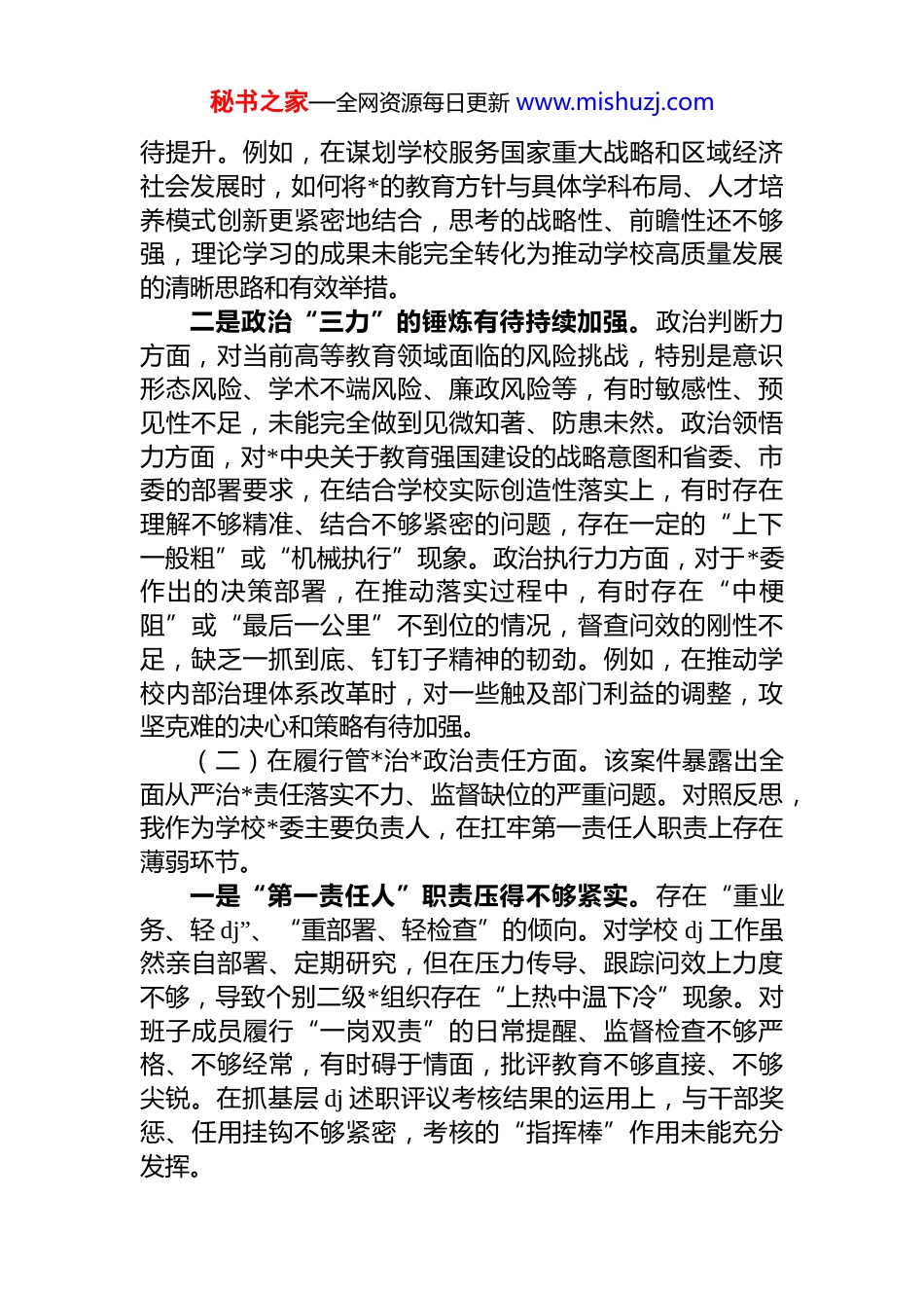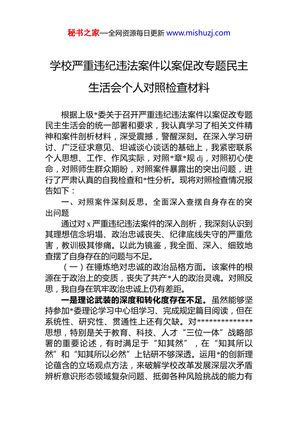 秘书之家—全网资源每日更新 www.mishuzj.com学校严重违纪违法案件以案促改专题民主生活会个人对照检查材料根据上级*委关于召开严重违纪违法案件以案促改专题民主生活会的统一部署和要求,我认真学习了相关文件精神和案件剖析材料,深受震撼,警醒深刻。在深入学习研讨、广泛征求意见、坦诚谈心谈话的基础上,我紧密联系个人思想、工作、作风实际,对照*章*规 dj,对照初心使命,对照师生群众期盼,对照案件暴露出的突出问题,进行了严肃认真的自我检查和*性分析。现将对照检查情况报告如下:一、对照案件深刻反思,全面深入查摆自身存在的突出问题通过对 x 严重违纪违法案件的深入剖析,我深刻认识到其理想信念坍塌、政治忠诚丧失、纪律底线失守的严重危害,教训极其惨痛。以此为镜鉴,我全面、深入、细致地查摆了自身存在的问题与不足。(一)在锤炼绝对忠诚的政治品格方面。该案件的根源在于政治上的变质,丧失了共产*人的政治灵魂。对照反思,我自身在筑牢政治忠诚上仍有差距。一是理论武装的深度和转化度存在不足。虽然能够坚持参加*委理论学习中心组学习、完成规定篇目阅读,但在系统性、研究性、贯通性上还有欠缺。对**************思想,特别是关于教育、科技、人才“三位一体”战略部署的重要论述,有时满足于“知其然”,在“知其所以然”和“知其所以必然”上钻研不够深透。运用*的创新理论蕴含的立场观点方法,来破解学校改革发展深层次矛盾辨析意识形态领域复杂问题、抵御各种风险挑战的能力有秘书之家—全网资源每日更新 www.mishuzj.com待提升。例如,在谋划学校服务国家重大战略和区域经济社会发展时,如何将*的教育方针与具体学科布局、人才培养模式创新更紧密地结合,思考的战略性、前瞻性还不够强,理论学习的成果未能完全转化为推动学校高质量发展的清晰思路和有效举措。二是政治“三力”的锤炼有待持续加强。政治判断力方面,对当前高等教育领域面临的风险挑战,特别是意识形态风险、学术不端风险、廉政风险等,有时敏感性、预见性不足,未能完全做到见微知著、防患未然。政治领悟力方面,对*中央关于教育强国建设的战略意图和省委、市委的部署要求,在结合学校实际创造性落实上,有时存在理解不够精准、结合不够紧密的问题,存在一定的“上下一般粗”或“机械执行”现象。政治执行力方面,对于*委作出的决策部署,在推动落实过程中,有时存在“中梗阻”或“最后一公里”不到位的情况,督查问效的刚性不足,缺乏一抓到底、钉钉子精神的韧劲。例如,在推动学校内部治理体系改革时,对一些触及部门利益的调整,攻坚克难的决心和策略有待加强。(二)在履行管*治*政治责任方面。该案件暴露出全面从严治*责任落实不力、监督缺位的严重问题。对照反思,我作为学校*委主要负责人,在扛牢第一责任人职责上存在薄弱环节。一是“第一责任人”职责压得不够紧实。存在“重业务、轻 dj”、“重部署、轻检查”的倾向。对学校 dj 工作虽然亲自部署、定期研究,但在压力传导、跟踪问效上力度不够,导致个别二级*组织存在“上热中温下冷”现象。对班子成员履行“一岗双责”的日常提醒、监督检查不够严格、不够经常,有时碍于情面,批评教育不够直接、不够尖锐。在抓基层 dj 述职评议考核结果的运用上,与干部奖惩、任用挂钩不够紧密,考核的“指挥棒”作用未能充分发挥。秘书之家—全网资源每日更新 www.mishuzj.com二是廉政风险防控的精准性和有效性有待提升。对学校重点领域和关键环节的廉政风险研判不够深入、动态。例如,在招生录取、人才引进、科研经费管理、基建工程招标采购、校办企业、附属单位管理等方面,虽然建立了制度,但对制度执行情况的监督检查不够深入细致,对潜在的风险点排查不够全面,防控措施有时滞后于形势发展对运用信息化手段加强廉政风险预警和动态监控的探索不够。结合高校特点,构建*委全面监督、纪委专责监督、*的工作部门职能监督、基层*组织日常监督、*员民主监督贯通协调的监督体系,思考谋划不够系统。三是意识形态工作责任制落实存在温差。对意识形态工作的极端重要性认识是到位的,但在具体落实中,有时存在“重部署、轻研判”...