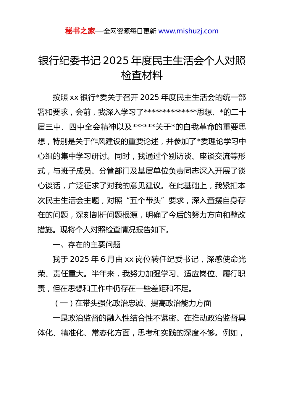 秘书之家—全网资源每日更新 www.mishuzj.com银行纪委书记 2025 年度民主生活会个人对照检查材料按照 xx 银行*委关于召开 2025 年度民主生活会的统一部署和要求,会前,我深入学习了**************思想、*的二十届三中、四中全会精神以及******关于*的自我革命的重要思想,特别是关于作风建设的重要论述,并参加了*委理论学习中心组的集中学习研讨。同时,我通过个别访谈、座谈交流等形式,与班子成员、分管部门及基层单位负责同志深入开展了谈心谈话,广泛征求了对我的意见建议。在此基础上,我紧扣本次民主生活会主题,对照“五个带头”要求,深入查摆自身存在的问题,深刻剖析问题根源,明确了今后的努力方向和整改措施。现将个人对照检查情况报告如下。一、存在的主要问题我于 2025 年 6 月由 xx 岗位转任纪委书记,深感使命光荣、责任重大。半年来,我努力加强学习、适应岗位、履行职责,但在思想和工作中仍存在一些差距和不足。(一)在带头强化政治忠诚、提高政治能力方面一是政治监督的融入性结合性不紧密。在推动政治监督具体化、精准化、常态化方面,思考和实践的深度不够。例如,秘书之家—全网资源每日更新 www.mishuzj.com在 2025 年第三季度对某分行信贷投放情况进行监督检查时,我更多地关注了贷款“三查”制度执行、不良贷款率等业务合规指标,但对于该分行在服务国家区域发展战略、支持实体经济特别是“十五五”规划开局重点项目方面的政治站位高不高、行动快不快、措施实不实等问题,挖掘不深、研判不透,未能完全将政治监督嵌入业务发展的全过程,从政治高度审视业务问题的能力不强。二是贯彻决策部署的穿透力执行力不彻底。对*中央的决策部署和上级*委的工作要求,虽然能够做到闻令而动、坚决执行,但在推动政策要求直达基层、末端落实上,力度有所衰减。2025 年下半年,总行部署开展防范化解金融风险专项整治行动,我牵头制定了监督方案,也组织了多次督导检查,但更多采取听取汇报、查阅台账的方式,对一些风险隐患较为集中的基层网点,未能做到“四不两直”式暗访,导致对基层存在的“报喜不报忧”、风险处置“上热下冷”等情况掌握不全面,监督的“探头”作用发挥不充分。三是应对风险挑战的敏锐性前瞻性不敏锐。身处金融领域,对经济形势变化可能引发的金融风险,特别是廉洁风险的复杂性和严峻性,认识和准备不充足。比如,面对数字化转型加速,线上业务、供应链金融等新型业务模式不断涌现,我对秘书之家—全网资源每日更新 www.mishuzj.com其中可能潜藏的利用数据权限谋私、内外勾结等新型腐败和作风问题,缺乏系统性研究和预判,未能及时推动建立健全前瞻性的廉洁风险防控机制,在增强忧患意识、坚持底线思维上做得不扎实。(二)在带头固本培元、增强*性方面一是理论学习的主动性系统性不深入。日常更多地是通过参加*委中心组学习、阅读文件简报等方式进行学习,个人静下心来读原著、学原文、悟原理的时间偏少,存在“以干代学”的现象。特别是对*的二十届四中全会提出的新思想、新论断,在如何与银行纪检监察工作深度融合、指导实践上,思考得不深不透。比如,对全会提出的“推进作风建设常态化长效化”,理解多停留在抓具体“四风”问题上,对于如何构建作风建设的长效机制、净化政治生态,缺乏系统性的谋划。二是*性分析的深刻性斗争性不坚决。在*内政治生活中,有时存在“老好人”思想,自我批评“怕揭短”,相互批评“怕伤人”。在参加所在*支部的组织生活会时,对其他同志的批评建议,多以鼓励和肯定为主,点问题时比较含蓄、比较委婉,担心辣味太足影响团结。这种思想根源在于*性锤炼不够,没有完全摆正个人感情和*性原则的关系,自我革命的精神和斗争精神有所弱化。秘书之家—全网资源每日更新 www.mishuzj.com三是角色转换的彻底性坚定性不彻底。从业务条线转到纪检条线,虽然岗位变了,但思想深处有时还残留着过去抓业务、谋发展的惯性思维。在分析一些违规违纪问题时,偶尔会不自觉地先考虑业务发展的不易、培养干部的不易,导致在初步研判时,对一些处于纪律“临界点”的问题,内心深处有过“惩前毖后、治病救人”应...