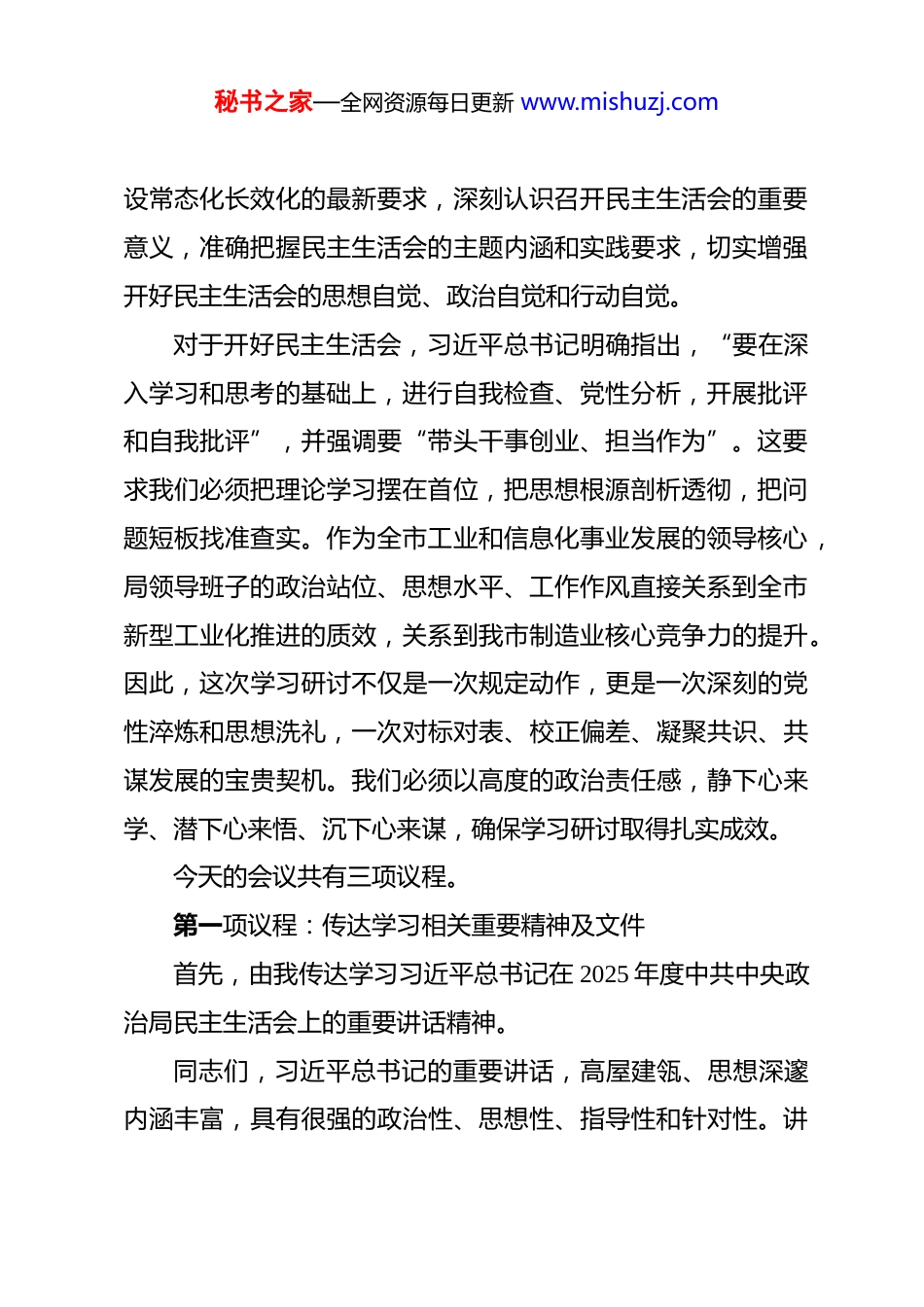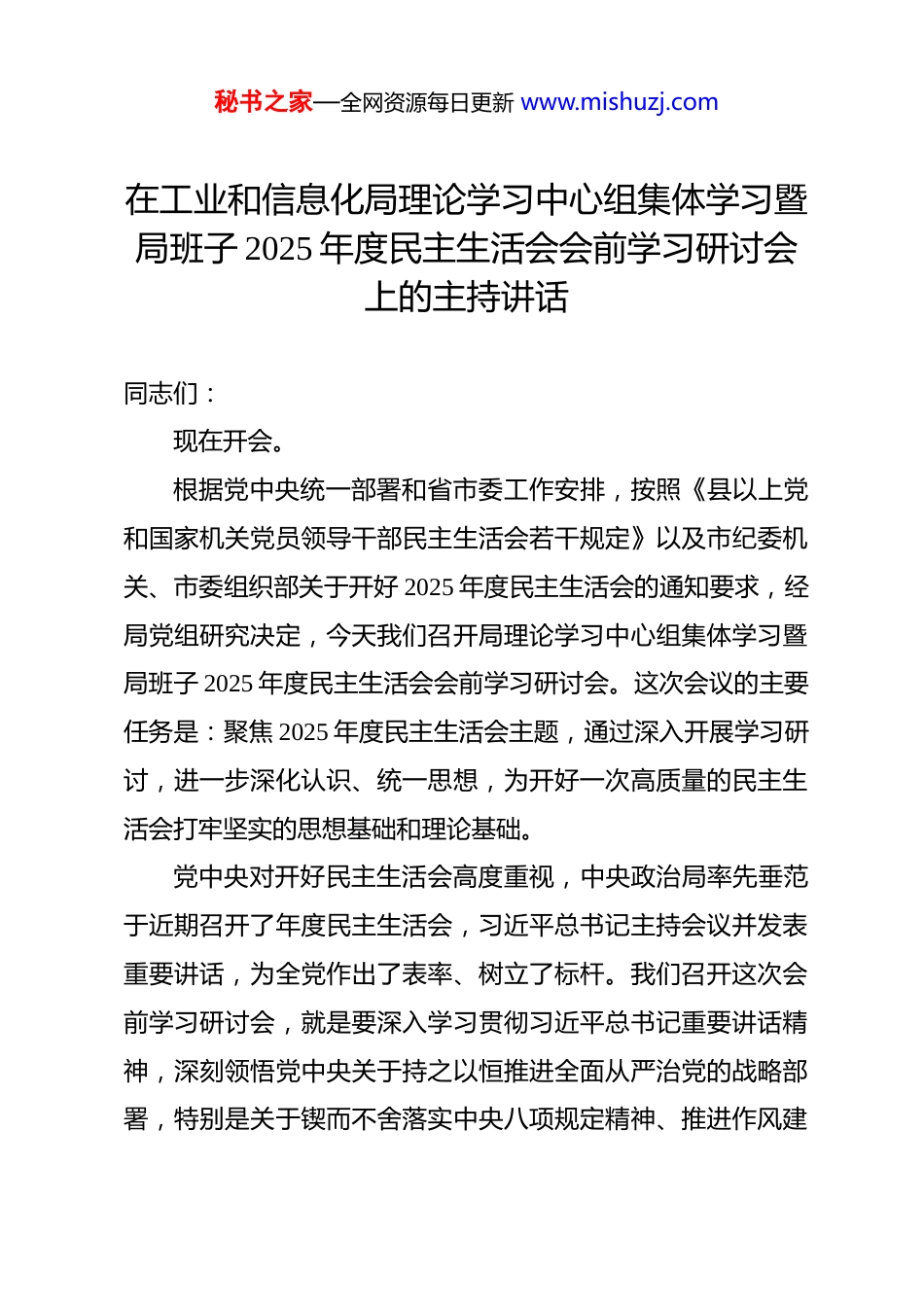 秘书之家—全网资源每日更新 www.mishuzj.com在工业和信息化局理论学习中心组集体学习暨局班子 2025 年度民主生活会会前学习研讨会上的主持讲话 同志们:现在开会。根据党中央统一部署和省市委工作安排,按照《县以上党和国家机关党员领导干部民主生活会若干规定》以及市纪委机关、市委组织部关于开好 2025 年度民主生活会的通知要求,经局党组研究决定,今天我们召开局理论学习中心组集体学习暨局班子 2025 年度民主生活会会前学习研讨会。这次会议的主要任务是:聚焦 2025 年度民主生活会主题,通过深入开展学习研讨,进一步深化认识、统一思想,为开好一次高质量的民主生活会打牢坚实的思想基础和理论基础。党中央对开好民主生活会高度重视,中央政治局率先垂范于近期召开了年度民主生活会,习近平总书记主持会议并发表重要讲话,为全党作出了表率、树立了标杆。我们召开这次会前学习研讨会,就是要深入学习贯彻习近平总书记重要讲话精神,深刻领悟党中央关于持之以恒推进全面从严治党的战略部署,特别是关于锲而不舍落实中央八项规定精神、推进作风建秘书之家—全网资源每日更新 www.mishuzj.com设常态化长效化的最新要求,深刻认识召开民主生活会的重要意义,准确把握民主生活会的主题内涵和实践要求,切实增强开好民主生活会的思想自觉、政治自觉和行动自觉。对于开好民主生活会,习近平总书记明确指出,“要在深入学习和思考的基础上,进行自我检查、党性分析,开展批评和自我批评”,并强调要“带头干事创业、担当作为”。这要求我们必须把理论学习摆在首位,把思想根源剖析透彻,把问题短板找准查实。作为全市工业和信息化事业发展的领导核心,局领导班子的政治站位、思想水平、工作作风直接关系到全市新型工业化推进的质效,关系到我市制造业核心竞争力的提升。因此,这次学习研讨不仅是一次规定动作,更是一次深刻的党性淬炼和思想洗礼,一次对标对表、校正偏差、凝聚共识、共谋发展的宝贵契机。我们必须以高度的政治责任感,静下心来学、潜下心来悟、沉下心来谋,确保学习研讨取得扎实成效。今天的会议共有三项议程。第一项议程:传达学习相关重要精神及文件首先,由我传达学习习近平总书记在 2025 年度中共中央政治局民主生活会上的重要讲话精神。同志们,习近平总书记的重要讲话,高屋建瓴、思想深邃内涵丰富,具有很强的政治性、思想性、指导性和针对性。讲秘书之家—全网资源每日更新 www.mishuzj.com话不仅是对中央政治局同志的明确要求,更是对全党各级领导干部的殷切期望和严肃要求。讲话系统总结了党的十八大以来作风建设取得的显著成效,深刻阐述了新形势下加强党性锻炼、推进作风建设的极端重要性,明确提出了“笃信、务实、担当、自律”的标杆要求,为我们党员领导干部加强自身建设、履行管党治党政治责任提供了根本遵循。特别是讲话中强调的“要坚持把中央八项规定作为铁规矩、硬杠杠”,“要带头反对形式主义,形成重实干求实效的浓厚氛围”,“要正视困难矛盾、风险隐患,迎难而上、攻坚克难”等重要论断,直指要害、振聋发聩。我们要深刻认识到,工信部门作为经济战线的重要部门,肩负着推动工业经济高质量发展、推进新型工业化的艰巨使命,班子成员的党性作风、能力担当直接关系到各项决策部署能否落地生根。学习贯彻习近平总书记这次重要讲话精神,必须紧密联系我市工业和信息化发展实际,紧密联系班子和个人思想、工作、作风实际,深刻检视在政治忠诚、党性修养、宗旨意识、担当精神、廉洁自律等方面存在的差距不足,切实把学习成果转化为锤炼党性、改进作风、推动工作的强大动力。下面,请*同志传达学习《中共中央办公厅关于锲而不舍落实中央八项规定精神推进作风建设常态化长效化的意见》(中办发〔2025〕57 号)。秘书之家—全网资源每日更新 www.mishuzj.com………………下面,请*同志传达学习《求是》杂志发表的习近平总书记重要文章《扩大内需是战略之举》的核心要义。………………同志们,刚才我们集中学习了近期党中央的重要精神和决策部署。中央出台 57 号文件,是党中央站在新的历史起点上,对作风建设作出的再动员、再...