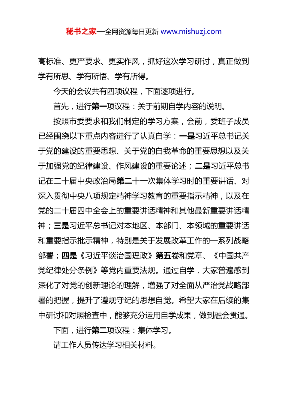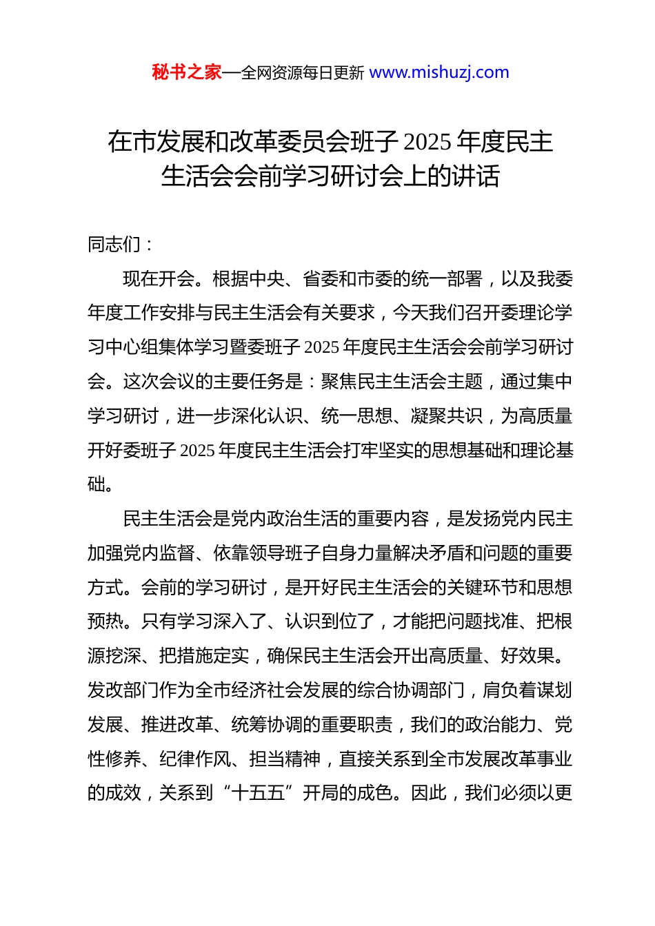 秘书之家—全网资源每日更新 www.mishuzj.com在市发展和改革委员会班子 2025 年度民主生活会会前学习研讨会上的讲话 同志们:现在开会。根据中央、省委和市委的统一部署,以及我委年度工作安排与民主生活会有关要求,今天我们召开委理论学习中心组集体学习暨委班子 2025 年度民主生活会会前学习研讨会。这次会议的主要任务是:聚焦民主生活会主题,通过集中学习研讨,进一步深化认识、统一思想、凝聚共识,为高质量开好委班子 2025 年度民主生活会打牢坚实的思想基础和理论基础。民主生活会是党内政治生活的重要内容,是发扬党内民主加强党内监督、依靠领导班子自身力量解决矛盾和问题的重要方式。会前的学习研讨,是开好民主生活会的关键环节和思想预热。只有学习深入了、认识到位了,才能把问题找准、把根源挖深、把措施定实,确保民主生活会开出高质量、好效果。发改部门作为全市经济社会发展的综合协调部门,肩负着谋划发展、推进改革、统筹协调的重要职责,我们的政治能力、党性修养、纪律作风、担当精神,直接关系到全市发展改革事业的成效,关系到“十五五”开局的成色。因此,我们必须以更秘书之家—全网资源每日更新 www.mishuzj.com高标准、更严要求、更实作风,抓好这次学习研讨,真正做到学有所思、学有所悟、学有所得。今天的会议共有四项议程,下面逐项进行。首先,进行第一项议程:关于前期自学内容的说明。按照市委要求和我们制定的学习方案,会前,委班子成员已经围绕以下重点内容进行了认真自学:一是习近平总书记关于党的建设的重要思想、关于党的自我革命的重要思想以及关于加强党的纪律建设、作风建设的重要论述;二是习近平总书记在二十届中央政治局第二十一次集体学习时的重要讲话、对深入贯彻中央八项规定精神学习教育的重要指示精神,以及在党的二十届四中全会上的重要讲话精神和其他最新重要讲话精神;三是习近平总书记对本地区、本部门、本领域的重要讲话和重要指示批示精神,特别是关于发展改革工作的一系列战略部署;四是《习近平谈治国理政》第五卷和党章、《中国共产党纪律处分条例》等党内重要法规。通过自学,大家普遍感到深化了对党的创新理论的理解,增强了对全面从严治党战略部署的把握,提升了遵规守纪的思想自觉。希望大家在后续的集中研讨和对照检查中,能够充分运用自学成果,做到融会贯通。下面,进行第二项议程:集体学习。请工作人员传达学习相关材料。秘书之家—全网资源每日更新 www.mishuzj.com(待传达学习完毕)刚才,我们集体学习了三个方面的内容:一是习近平总书记在 2025 年度中共中央政治局民主生活会上的重要讲话精神;二是《中共中央办公厅关于锲而不舍落实中央八项规定精神推进作风建设常态化长效化的意见》;三是《求是》杂志发表的习近平总书记重要文章《扩大内需是战略之举》。这些学习内容,主题鲜明、内涵深刻、要求明确,具有很强的政治性、思想性、指导性和针对性。中央政治局民主生活会,为全党严肃党内政治生活、开好民主生活会树立了标杆、作出了示范。总书记的重要讲话,深刻阐述了新征程上全面加强党的建设、推进党的自我革命的一系列重大理论和实践问题,对领导干部带头强化政治忠诚、固本培元、敬畏人民组织法纪、干事创业担当、扛起管党治党责任提出了明确要求,为我们加强班子自身建设、纵深推进全面从严治党指明了方向。总书记强调的“笃信、务实、担当、自律”,是对领导干部党性党风要求的精辟概括,是我们修身律己、干事创业的根本遵循。《意见》就推动作风建设常态化长效化作出系统部署,是巩固拓展中央八项规定精神成果、持续深化纠治“四风”的重要文件。总书记的重要文章,深刻阐述了扩大内需的战略意义和实践路径,为我们准确把握当前经济秘书之家—全网资源每日更新 www.mishuzj.com形势、科学谋划“十五五”发展、切实抓好 2025 年经济工作提供了战略指引。作为发改部门的领导干部,我们必须先学一步、学深一层,深刻领会核心要义,自觉用以武装头脑、指导实践、推动工作。接下来,进行第三项议程:交流发言。请委班子成员依次发言,围绕学习内容,结合思想和工作实际,谈认识...