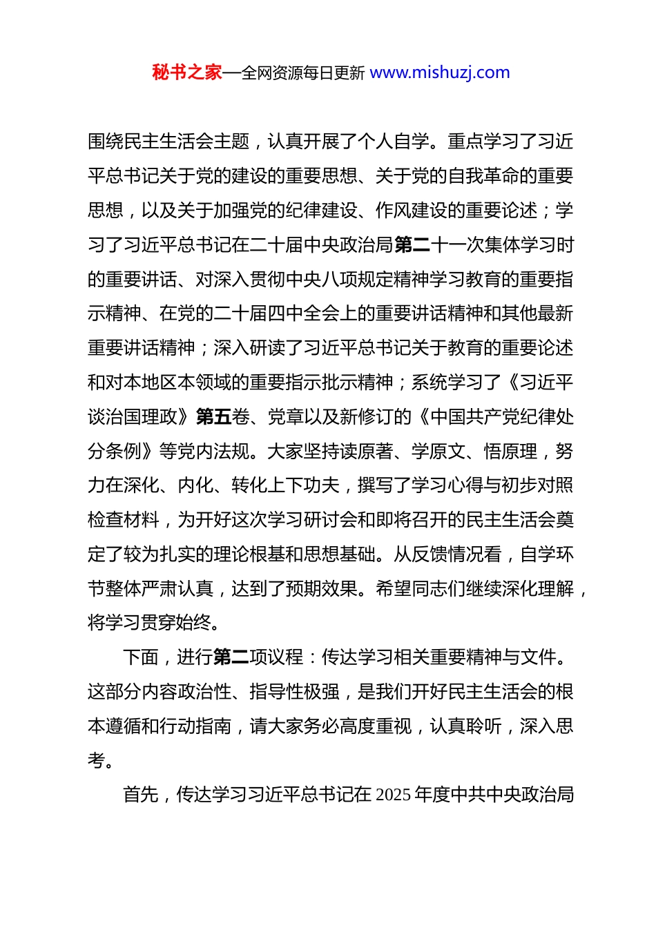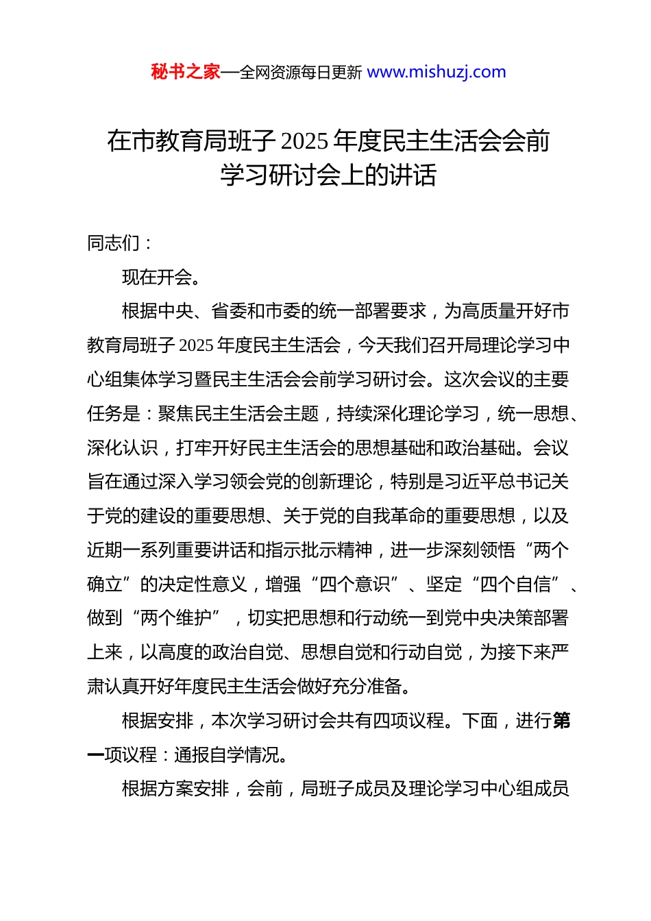 秘书之家—全网资源每日更新 www.mishuzj.com在市教育局班子 2025 年度民主生活会会前学习研讨会上的讲话 同志们:现在开会。根据中央、省委和市委的统一部署要求,为高质量开好市教育局班子 2025 年度民主生活会,今天我们召开局理论学习中心组集体学习暨民主生活会会前学习研讨会。这次会议的主要任务是:聚焦民主生活会主题,持续深化理论学习,统一思想、深化认识,打牢开好民主生活会的思想基础和政治基础。会议旨在通过深入学习领会党的创新理论,特别是习近平总书记关于党的建设的重要思想、关于党的自我革命的重要思想,以及近期一系列重要讲话和指示批示精神,进一步深刻领悟“两个确立”的决定性意义,增强“四个意识”、坚定“四个自信”、做到“两个维护”,切实把思想和行动统一到党中央决策部署上来,以高度的政治自觉、思想自觉和行动自觉,为接下来严肃认真开好年度民主生活会做好充分准备。根据安排,本次学习研讨会共有四项议程。下面,进行第一项议程:通报自学情况。根据方案安排,会前,局班子成员及理论学习中心组成员秘书之家—全网资源每日更新 www.mishuzj.com围绕民主生活会主题,认真开展了个人自学。重点学习了习近平总书记关于党的建设的重要思想、关于党的自我革命的重要思想,以及关于加强党的纪律建设、作风建设的重要论述;学习了习近平总书记在二十届中央政治局第二十一次集体学习时的重要讲话、对深入贯彻中央八项规定精神学习教育的重要指示精神、在党的二十届四中全会上的重要讲话精神和其他最新重要讲话精神;深入研读了习近平总书记关于教育的重要论述和对本地区本领域的重要指示批示精神;系统学习了《习近平谈治国理政》第五卷、党章以及新修订的《中国共产党纪律处分条例》等党内法规。大家坚持读原著、学原文、悟原理,努力在深化、内化、转化上下功夫,撰写了学习心得与初步对照检查材料,为开好这次学习研讨会和即将召开的民主生活会奠定了较为扎实的理论根基和思想基础。从反馈情况看,自学环节整体严肃认真,达到了预期效果。希望同志们继续深化理解,将学习贯穿始终。下面,进行第二项议程:传达学习相关重要精神与文件。这部分内容政治性、指导性极强,是我们开好民主生活会的根本遵循和行动指南,请大家务必高度重视,认真聆听,深入思考。首先,传达学习习近平总书记在 2025 年度中共中央政治局秘书之家—全网资源每日更新 www.mishuzj.com民主生活会上的重要讲话精神。中共中央政治局于 2024 年 12 月 25 日至 26 日召开的民主生活会,主题鲜明、程序严格、成效显著,为全党各级领导班子开好民主生活会树立了标杆、作出了示范。习近平总书记主持会议并发表的重要讲话,高屋建瓴、思想深邃、语重心长,既是对中央政治局同志的殷切期望,也是对全党各级领导干部的普遍要求,具有很强的政治性、思想性、指导性和针对性。讲话系统总结了党的十八大以来特别是通过深入贯彻中央八项规定精神学习教育推动作风建设取得的新的明显成效,深刻阐述了新征程上持续加强自身建设、推进党的自我革命的极端重要性。讲话鲜明指出了中央政治局同志聚焦的“五个带头”重点方向:带头强化政治忠诚、提高政治能力;带头固本培元、增强党性;带头敬畏人民、敬畏组织、敬畏法纪;带头干事创业、担当作为;带头坚决扛起管党治党责任。这“五个带头”为高级领导干部加强党性锻炼、提升政治素养、履行政治责任划出了清晰标尺,也为各级领导干部对照检查提供了核心维度。习近平总书记突出强调了“笃信、务实、担当、自律”的实践要求。在“笃信”上,要求领导干部笃信马克思主义,坚定理想信念,做坚定的马克思主义者,提高政治能力,始终同秘书之家—全网资源每日更新 www.mishuzj.com党中央保持高度一致。在“务实”上,强调共产党人是唯物主义者,必须实事求是、求真务实、真抓实干,深入基层一线,带头反对形式主义。在“担当”上,指出领导干部要勇于担当,在其位、谋其政、尽其责,迎难而上、攻坚克难,坚持党性原则,敢于斗争。在“自律”上,要求领导干部必须头脑清醒、严格自律,严格执行民主集中制,严格落实中央八项规定精...