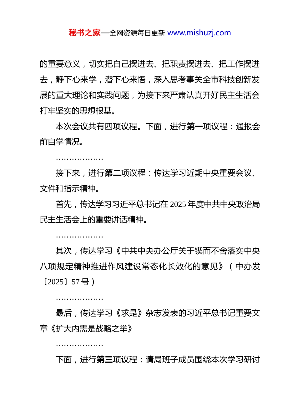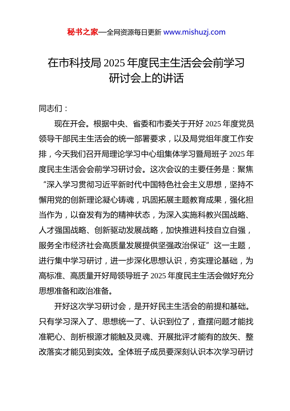 秘书之家—全网资源每日更新 www.mishuzj.com在市科技局 2025 年度民主生活会会前学习研讨会上的讲话 同志们:现在开会。根据中央、省委和市委关于开好 2025 年度党员领导干部民主生活会的统一部署要求,以及局党组年度工作安排,今天我们召开局理论学习中心组集体学习暨局班子 2025 年度民主生活会会前学习研讨会。这次会议的主要任务是:聚焦“深入学习贯彻习近平新时代中国特色社会主义思想,坚持不懈用党的创新理论凝心铸魂,巩固拓展主题教育成果,强化担当作为,以奋发有为的精神状态,为深入实施科教兴国战略、人才强国战略、创新驱动发展战略,加快推进科技自立自强,服务全市经济社会高质量发展提供坚强政治保证”这一主题,进行集中学习研讨,进一步深化思想认识,夯实理论基础,为高标准、高质量开好局领导班子 2025 年度民主生活会做好充分思想准备和政治准备。开好这次学习研讨会,是开好民主生活会的前提和基础。只有学习深入了、思想统一了、认识到位了,查摆问题才能找准靶心、剖析根源才能触及灵魂、开展批评才能有的放矢、整改落实才能见到实效。全体班子成员要深刻认识本次学习研讨秘书之家—全网资源每日更新 www.mishuzj.com的重要意义,切实把自己摆进去、把职责摆进去、把工作摆进去,静下心来学,潜下心来悟,深入思考事关全市科技创新发展的重大理论和实践问题,为接下来严肃认真开好民主生活会打牢坚实的思想根基。本次会议共有四项议程。下面,进行第一项议程:通报会前自学情况。………………接下来,进行第二项议程:传达学习近期中央重要会议、文件和指示精神。首先,传达学习习近平总书记在 2025 年度中共中央政治局民主生活会上的重要讲话精神。………………其次,传达学习《中共中央办公厅关于锲而不舍落实中央八项规定精神推进作风建设常态化长效化的意见》(中办发〔2025〕57 号)………………最后,传达学习《求是》杂志发表的习近平总书记重要文章《扩大内需是战略之举》………………下面,进行第三项议程:请局班子成员围绕本次学习研讨秘书之家—全网资源每日更新 www.mishuzj.com主题,结合会前自学和刚才传达学习的内容,联系分管领域工作和个人思想实际,依次作交流发言。发言要聚焦主题,突出重点,谈认识、谈体会、谈思考、谈打算。请大家控制好时间。(班子成员依次进行交流发言)刚才,各位班子成员做了很好的交流发言。大家的发言准备充分、思考深入,既有理论层面的学习感悟,也有实践层面的工作思考,体现了对党忠诚的政治品格、严肃认真的学习态度和求真务实的工作作风。通过交流研讨,大家进一步统一了思想,深化了认识,凝聚了共识,达到了预期目的。学习的目的全在于运用。我们要把学习研讨的成果,切实转化为谋划工作的思路、推动落实的举措和履职尽责的成效。下面,由我结合学习领会习近平总书记重要讲话精神及中央有关要求,就贯彻落实中央政治局民主生活会精神,切实开展好我局领导班子2025 年度民主生活会,讲几点意见,作出部署安排。一、提高政治站位,深刻把握主题内涵,为开好民主生活会筑牢思想根基民主生活会是党内政治生活的重要内容,是发扬党内民主加强党内监督、依靠领导班子自身力量解决矛盾和问题的重要方式。开好这次民主生活会,首先必须从政治上看、从思想上抓,深刻理解其特殊重要性和现实必要性。秘书之家—全网资源每日更新 www.mishuzj.com(一)深刻认识开好民主生活会是忠诚拥护“两个确立”坚决做到“两个维护”的政治检验。当前,世界百年未有之大变局加速演进,我国发展进入战略机遇和风险挑战并存、不确定难预料因素增多的时期。科技领域作为国际竞争的前沿阵地,面临的风险挑战更为直接、更为复杂。在这样的背景下,更加需要坚强的领导核心和科学的理论指引。年度民主生活会,首要任务就是对照检查我们在思想上、政治上、行动上是否同以习近平同志为核心的党中央保持高度一致,是否不折不扣地把党中央关于科技创新的决策部署落到实处。我们要通过民主生活会,进一步深刻领悟“两个确立”的决定性意义,把“两个维护”作为最高政治原则和根本政治规矩,融入血脉、见诸行动。...