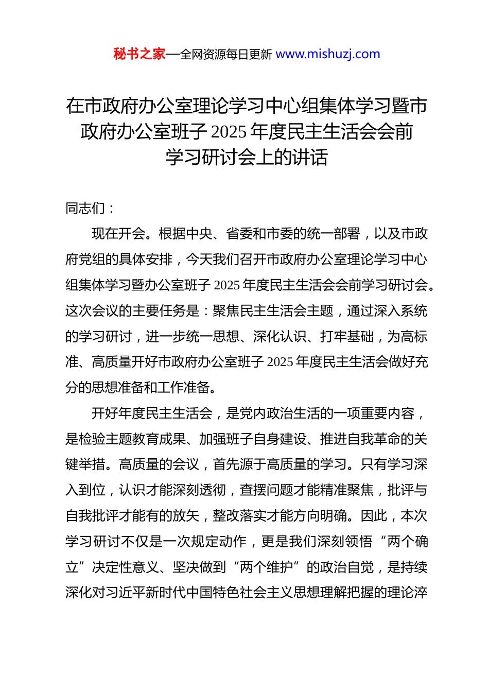 秘书之家—全网资源每日更新 www.mishuzj.com在市政府办公室理论学习中心组集体学习暨市政府办公室班子 2025 年度民主生活会会前学习研讨会上的讲话 同志们:现在开会。根据中央、省委和市委的统一部署,以及市政府党组的具体安排,今天我们召开市政府办公室理论学习中心组集体学习暨办公室班子 2025 年度民主生活会会前学习研讨会。这次会议的主要任务是:聚焦民主生活会主题,通过深入系统的学习研讨,进一步统一思想、深化认识、打牢基础,为高标准、高质量开好市政府办公室班子 2025 年度民主生活会做好充分的思想准备和工作准备。开好年度民主生活会,是党内政治生活的一项重要内容,是检验主题教育成果、加强班子自身建设、推进自我革命的关键举措。高质量的会议,首先源于高质量的学习。只有学习深入到位,认识才能深刻透彻,查摆问题才能精准聚焦,批评与自我批评才能有的放矢,整改落实才能方向明确。因此,本次学习研讨不仅是一次规定动作,更是我们深刻领悟“两个确立”决定性意义、坚决做到“两个维护”的政治自觉,是持续深化对习近平新时代中国特色社会主义思想理解把握的理论淬秘书之家—全网资源每日更新 www.mishuzj.com炼,是检视反思、提升境界的党性洗礼,也是我们办公室班子凝心聚力、提升“三服务”工作水平的现实需要。本次会议共有四项议程。下面,进行第一项议程,通报近期自学情况。为开好这次民主生活会,按照上级要求,办公室班子成员在会前已认真开展了自学。自学内容主要涵盖了:习近平总书记围绕党的建设、党的自我革命、加强党的纪律建设与作风建设发表的一系列具有开创性意义的重要思想与核心论述;习近平总书记在二十届中央政治局第二十一次集体学习时的重要讲话、对深入贯彻中央八项规定精神学习教育作出的关键指示、在党的二十届四中全会上的重要讲话以及其他最新重要讲话精神;习近平总书记立足国家发展全局,对本地区、本领域、本部门工作定向领航的重要讲话和指示批示精神;《习近平谈治国理政》第五卷等经典著作,以及党章、《中国共产党纪律处分条例》等党内基础法规。通过这段时间的系统自学,同志们普遍经历了一次深刻的思想教育和理论武装,为今天集中研讨和后续对照检查奠定了坚实的理论基础和思想根基。下面,进行第二项议程,传达学习近期中央重要会议、文件和指示精神。首先,传达学习习近平总书记在 2025 年度中共中央政治局秘书之家—全网资源每日更新 www.mishuzj.com民主生活会上的重要讲话精神。这次中央政治局民主生活会,是在“十四五”规划收官、“十五五”规划谋划的关键节点召开的一次极其重要的党内政治生活。会议深入学习贯彻习近平新时代中国特色社会主义思想,全面贯彻落实党的二十届四中全会精神,主题鲜明、程序严格、成效显著,为全党作出了表率、树立了标杆。习近平总书记的重要讲话,高屋建瓴、思想深邃、语重心长,既是对中央政治局同志的严格要求,也是对全党各级领导干部的普遍要求,为我们加强领导班子建设、严肃党内政治生活、推进全面从严治党提供了根本遵循。讲话深刻总结了党的十八大以来,党中央从制定和执行中央八项规定破题,驰而不息推进作风建设的显著成效,特别是肯定了 2025 年在全党开展的深入贯彻中央八项规定精神学习教育所取得的新成果。总书记鲜明指出,要坚持把中央八项规定作为“铁规矩、硬杠杠”,毫不松懈整治“四风”顽瘴痼疾,不断推进作风建设常态化长效化。这不仅宣示了党中央将作风建设进行到底的坚定决心,也警示我们作风问题具有顽固性和反复性,必须常抓不懈、久久为功。讲话突出强调了中央政治局同志要当好“党性党风标杆”在“笃信、务实、担当、自律”上为全党带好头、作示范。这四个方面,精准概括了新时代领导干部应当具备的核心素养和秘书之家—全网资源每日更新 www.mishuzj.com政治品格。“笃信”,就是要笃信马克思主义,坚定理想信念,这是共产党人的立身之本。领导干部必须深化理论学习,加强自我省察,做坚定的马克思主义者,把心思和精力集中到实现好、维护好、发展好最广大人民根本利益上。“务实”,是共产党人唯物主义者必备的品格,要求我们...