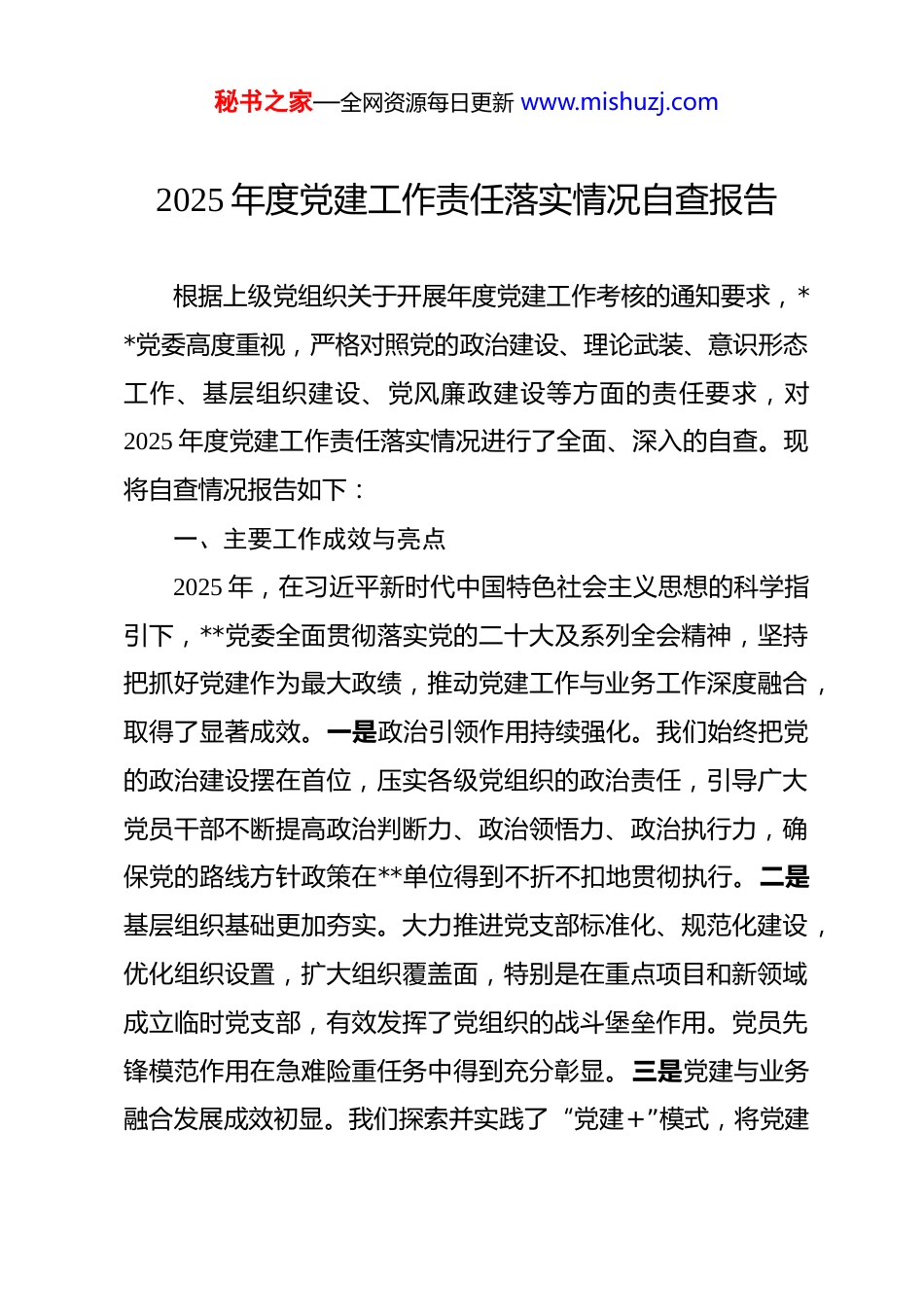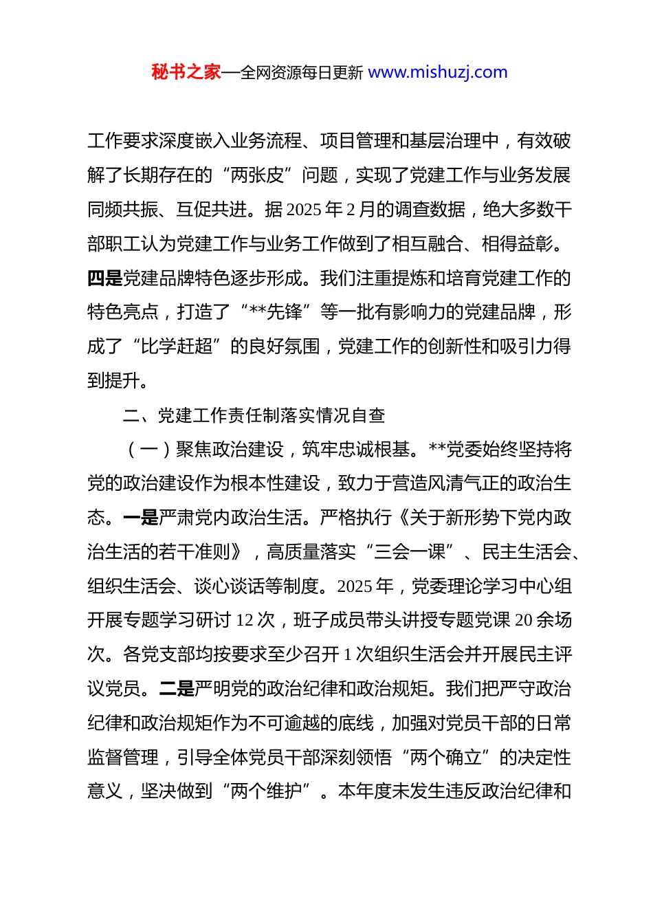 秘书之家—全网资源每日更新 www.mishuzj.com2025 年度党建工作责任落实情况自查报告 根据上级党组织关于开展年度党建工作考核的通知要求,**党委高度重视,严格对照党的政治建设、理论武装、意识形态工作、基层组织建设、党风廉政建设等方面的责任要求,对2025 年度党建工作责任落实情况进行了全面、深入的自查。现将自查情况报告如下:一、主要工作成效与亮点2025 年,在习近平新时代中国特色社会主义思想的科学指引下,**党委全面贯彻落实党的二十大及系列全会精神,坚持把抓好党建作为最大政绩,推动党建工作与业务工作深度融合,取得了显著成效。一是政治引领作用持续强化。我们始终把党的政治建设摆在首位,压实各级党组织的政治责任,引导广大党员干部不断提高政治判断力、政治领悟力、政治执行力,确保党的路线方针政策在**单位得到不折不扣地贯彻执行。二是基层组织基础更加夯实。大力推进党支部标准化、规范化建设,优化组织设置,扩大组织覆盖面,特别是在重点项目和新领域成立临时党支部,有效发挥了党组织的战斗堡垒作用。党员先锋模范作用在急难险重任务中得到充分彰显。三是党建与业务融合发展成效初显。我们探索并实践了“党建+”模式,将党建秘书之家—全网资源每日更新 www.mishuzj.com工作要求深度嵌入业务流程、项目管理和基层治理中,有效破解了长期存在的“两张皮”问题,实现了党建工作与业务发展同频共振、互促共进。据 2025 年 2 月的调查数据,绝大多数干部职工认为党建工作与业务工作做到了相互融合、相得益彰。四是党建品牌特色逐步形成。我们注重提炼和培育党建工作的特色亮点,打造了“**先锋”等一批有影响力的党建品牌,形成了“比学赶超”的良好氛围,党建工作的创新性和吸引力得到提升。二、党建工作责任制落实情况自查(一)聚焦政治建设,筑牢忠诚根基。**党委始终坚持将党的政治建设作为根本性建设,致力于营造风清气正的政治生态。一是严肃党内政治生活。严格执行《关于新形势下党内政治生活的若干准则》,高质量落实“三会一课”、民主生活会、组织生活会、谈心谈话等制度。2025 年,党委理论学习中心组开展专题学习研讨 12 次,班子成员带头讲授专题党课 20 余场次。各党支部均按要求至少召开 1 次组织生活会并开展民主评议党员。二是严明党的政治纪律和政治规矩。我们把严守政治纪律和政治规矩作为不可逾越的底线,加强对党员干部的日常监督管理,引导全体党员干部深刻领悟“两个确立”的决定性意义,坚决做到“两个维护”。本年度未发生违反政治纪律和秘书之家—全网资源每日更新 www.mishuzj.com政治规矩的事件。三是健全完善考核评价机制。我们建立了“述职述党建、评议评党建、考核考党建”的工作机制,将政治建设成效作为评价各级领导班子和领导干部的重要标准,考核结果与评先评优、绩效奖励直接挂钩,有力推动了政治建设责任的落实。2025 年度党建工作完成合格率达到 100%。(二)深化理论武装,凝聚思想共识。我们坚持用党的创新理论武装头脑、指导实践、推动工作,不断筑牢全体党员干部的思想根基。一是学习计划系统化。我们年初即制定了《2025 年度党员干部理论学习计划》,明确学习内容、方式和要求。将《习近平著作选读》《习近平新时代中国特色社会主义思想学习纲要》等作为核心教材,确保理论学习的系统性和权威性。2025 年,我们构建了“集中研讨+专题辅导+实践检验”的立体化学习模式,确保学习入脑入心。二是学习覆盖广度化。通过线上线下相结合的方式,推动理论学习向全体党员延伸。2025 年,我们依托“智慧党建”等信息化平台,推送学习资料超过 500 次,党员学习活跃度达到 78.79%,理论学习覆盖率达到 97.1%。三是学习管理精细化。我们对学习时长和效果进行量化管理,建立了党员学习档案。数据显示,2025 年上半年,党员干部理论学习平均时长从 2023 年的 28 小时/人提升至 36 小时/人,增幅达到 28%,各党支部理论学习考核合格率秘书之家—全网资源每日更新 www.mishuzj.com达到 98%。我们严格落实学习时长要求,确保普通党员每年集中学习不少于 24 学时,领导班子成员不...