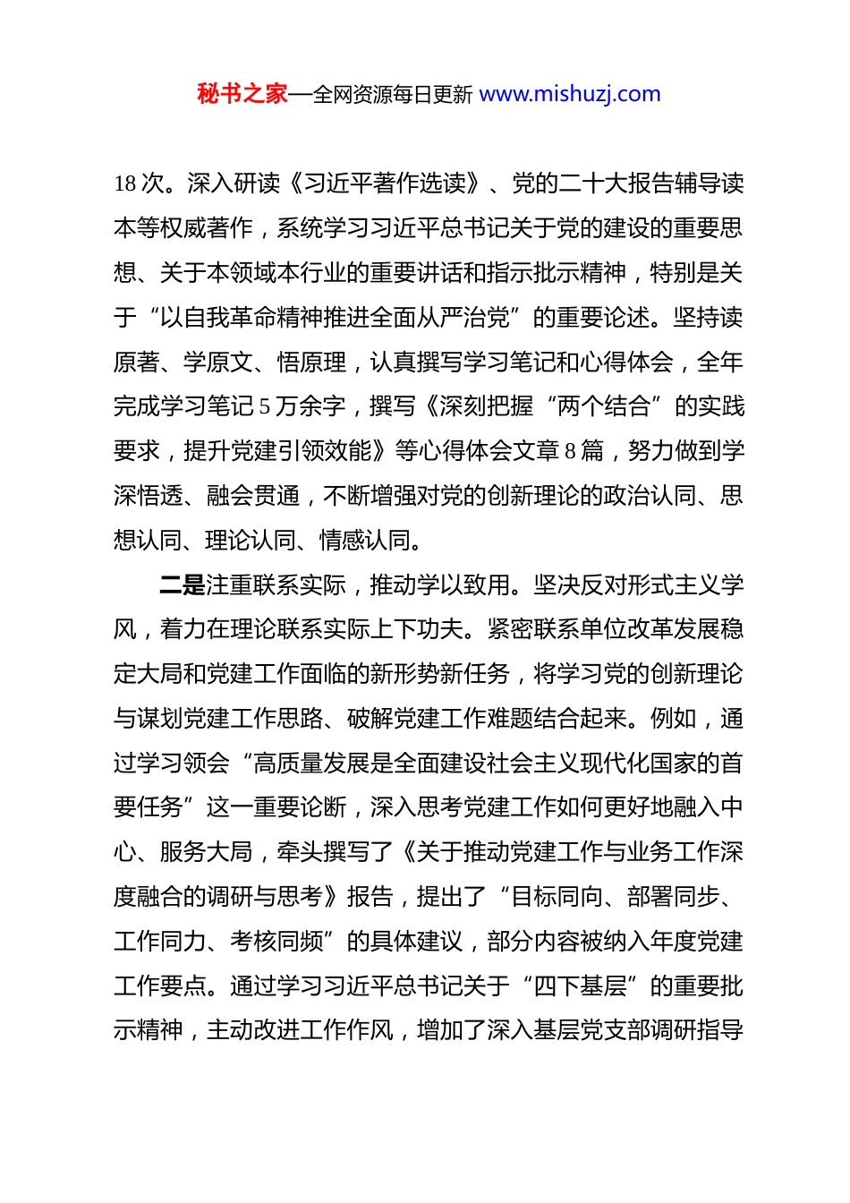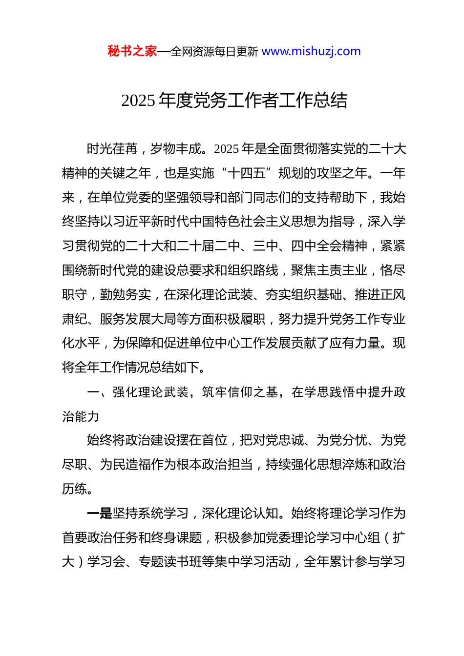 秘书之家—全网资源每日更新 www.mishuzj.com2025 年度党务工作者工作总结 时光荏苒,岁物丰成。2025 年是全面贯彻落实党的二十大精神的关键之年,也是实施“十四五”规划的攻坚之年。一年来,在单位党委的坚强领导和部门同志们的支持帮助下,我始终坚持以习近平新时代中国特色社会主义思想为指导,深入学习贯彻党的二十大和二十届二中、三中、四中全会精神,紧紧围绕新时代党的建设总要求和组织路线,聚焦主责主业,恪尽职守,勤勉务实,在深化理论武装、夯实组织基础、推进正风肃纪、服务发展大局等方面积极履职,努力提升党务工作专业化水平,为保障和促进单位中心工作发展贡献了应有力量。现将全年工作情况总结如下。一、强化理论武装,筑牢信仰之基,在学思践悟中提升政治能力始终将政治建设摆在首位,把对党忠诚、为党分忧、为党尽职、为民造福作为根本政治担当,持续强化思想淬炼和政治历练。一是坚持系统学习,深化理论认知。始终将理论学习作为首要政治任务和终身课题,积极参加党委理论学习中心组(扩大)学习会、专题读书班等集中学习活动,全年累计参与学习秘书之家—全网资源每日更新 www.mishuzj.com18 次。深入研读《习近平著作选读》、党的二十大报告辅导读本等权威著作,系统学习习近平总书记关于党的建设的重要思想、关于本领域本行业的重要讲话和指示批示精神,特别是关于“以自我革命精神推进全面从严治党”的重要论述。坚持读原著、学原文、悟原理,认真撰写学习笔记和心得体会,全年完成学习笔记 5 万余字,撰写《深刻把握“两个结合”的实践要求,提升党建引领效能》等心得体会文章 8 篇,努力做到学深悟透、融会贯通,不断增强对党的创新理论的政治认同、思想认同、理论认同、情感认同。二是注重联系实际,推动学以致用。坚决反对形式主义学风,着力在理论联系实际上下功夫。紧密联系单位改革发展稳定大局和党建工作面临的新形势新任务,将学习党的创新理论与谋划党建工作思路、破解党建工作难题结合起来。例如,通过学习领会“高质量发展是全面建设社会主义现代化国家的首要任务”这一重要论断,深入思考党建工作如何更好地融入中心、服务大局,牵头撰写了《关于推动党建工作与业务工作深度融合的调研与思考》报告,提出了“目标同向、部署同步、工作同力、考核同频”的具体建议,部分内容被纳入年度党建工作要点。通过学习习近平总书记关于“四下基层”的重要批示精神,主动改进工作作风,增加了深入基层党支部调研指导秘书之家—全网资源每日更新 www.mishuzj.com的频率和深度,使工作部署更接“地气”。三是严守政治纪律,把稳思想之舵。时刻绷紧政治纪律和政治规矩这根弦,不断提高政治判断力、政治领悟力、政治执行力。在起草文件、筹备会议、组织活动、宣传报道等各项工作中,始终坚持正确的政治方向、舆论导向和价值取向,自觉同党中央决策部署和上级党委工作要求对标对表,确保不偏向、不变通、不走样。严格落实意识形态工作责任制,加强对单位内部网站、宣传栏、微信公众号等意识形态阵地的日常管理和内容审核,全年审核各类宣传稿件、信息简报 150 余篇,确保内容健康向上、导向正确。积极参与重大舆情监测和引导,协助党委妥善处置涉及党建工作的网络舆情 2 起,维护了单位良好形象和政治安全。二、聚焦主责主业,夯实组织基础,在强基固本中提升党建质量牢固树立大抓基层的鲜明导向,以提升组织力为重点,突出政治功能,着力推动基层党组织全面进步、全面过硬。一是规范组织建设,筑牢战斗堡垒。严格对标《中国共产党支部工作条例(试行)》,持续推进党支部标准化规范化建设。年初牵头修订完善了《党支部工作考核评价实施细则》,细化了“政治建设、组织设置、班子建设、组织生活、党员教秘书之家—全网资源每日更新 www.mishuzj.com育管理、作用发挥”等 6 个方面 23 项具体指标。年中组织开展了全覆盖的党支部建设情况调研和交叉互查,对全单位 35 个党支部进行了“全面体检”,形成问题清单和整改台账。年底牵头组织开展了年度党支部星级评定工作,通过支部自评、党员群众评议、党委综合评定等程序,评选出“五星...