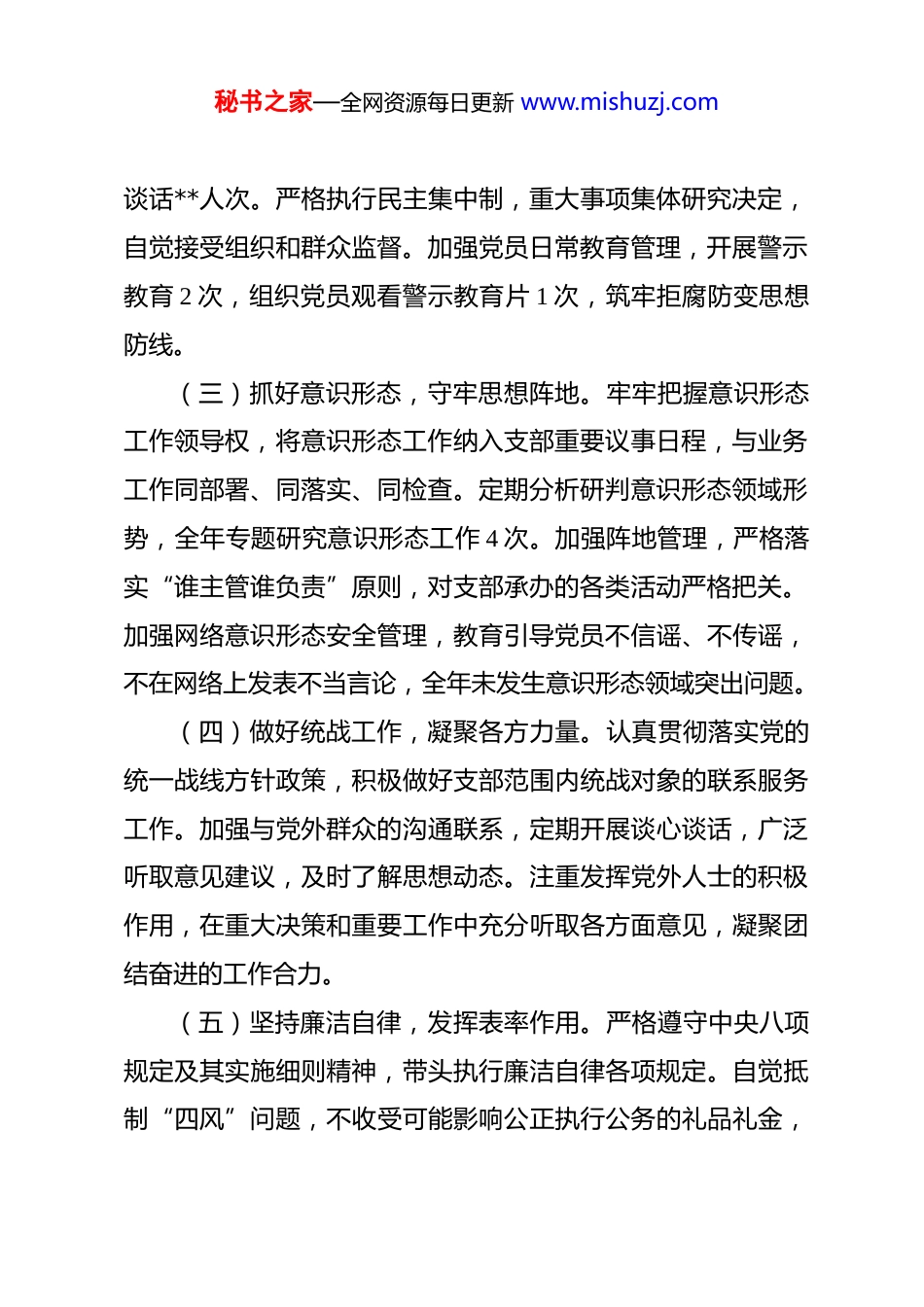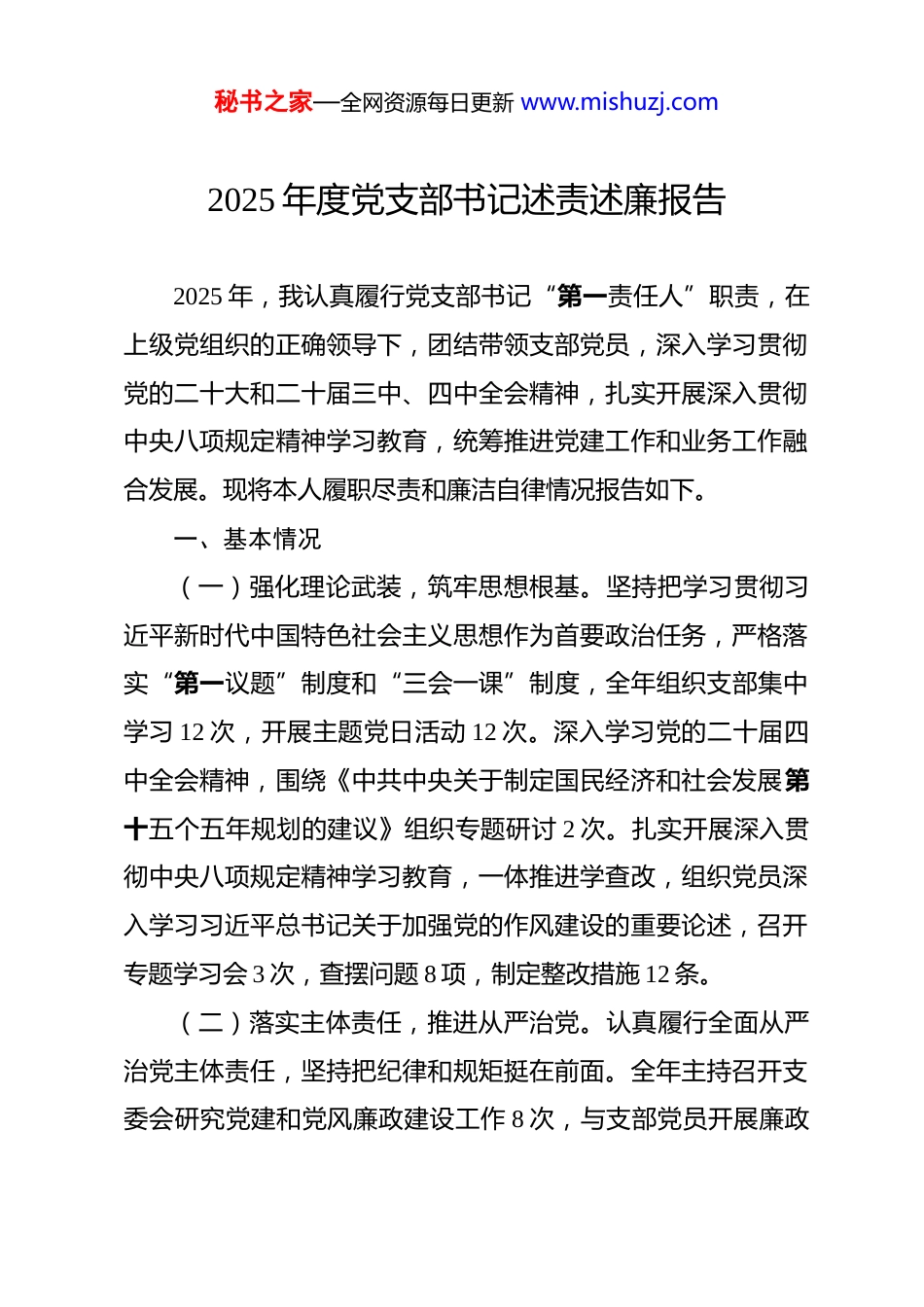 秘书之家—全网资源每日更新 www.mishuzj.com2025 年度党支部书记述责述廉报告 2025 年,我认真履行党支部书记“第一责任人”职责,在上级党组织的正确领导下,团结带领支部党员,深入学习贯彻党的二十大和二十届三中、四中全会精神,扎实开展深入贯彻中央八项规定精神学习教育,统筹推进党建工作和业务工作融合发展。现将本人履职尽责和廉洁自律情况报告如下。一、基本情况(一)强化理论武装,筑牢思想根基。坚持把学习贯彻习近平新时代中国特色社会主义思想作为首要政治任务,严格落实“第一议题”制度和“三会一课”制度,全年组织支部集中学习 12 次,开展主题党日活动 12 次。深入学习党的二十届四中全会精神,围绕《中共中央关于制定国民经济和社会发展第十五个五年规划的建议》组织专题研讨 2 次。扎实开展深入贯彻中央八项规定精神学习教育,一体推进学查改,组织党员深入学习习近平总书记关于加强党的作风建设的重要论述,召开专题学习会 3 次,查摆问题 8 项,制定整改措施 12 条。(二)落实主体责任,推进从严治党。认真履行全面从严治党主体责任,坚持把纪律和规矩挺在前面。全年主持召开支委会研究党建和党风廉政建设工作 8 次,与支部党员开展廉政秘书之家—全网资源每日更新 www.mishuzj.com谈话**人次。严格执行民主集中制,重大事项集体研究决定,自觉接受组织和群众监督。加强党员日常教育管理,开展警示教育 2 次,组织党员观看警示教育片 1 次,筑牢拒腐防变思想防线。(三)抓好意识形态,守牢思想阵地。牢牢把握意识形态工作领导权,将意识形态工作纳入支部重要议事日程,与业务工作同部署、同落实、同检查。定期分析研判意识形态领域形势,全年专题研究意识形态工作 4 次。加强阵地管理,严格落实“谁主管谁负责”原则,对支部承办的各类活动严格把关。加强网络意识形态安全管理,教育引导党员不信谣、不传谣,不在网络上发表不当言论,全年未发生意识形态领域突出问题。(四)做好统战工作,凝聚各方力量。认真贯彻落实党的统一战线方针政策,积极做好支部范围内统战对象的联系服务工作。加强与党外群众的沟通联系,定期开展谈心谈话,广泛听取意见建议,及时了解思想动态。注重发挥党外人士的积极作用,在重大决策和重要工作中充分听取各方面意见,凝聚团结奋进的工作合力。(五)坚持廉洁自律,发挥表率作用。严格遵守中央八项规定及其实施细则精神,带头执行廉洁自律各项规定。自觉抵制“四风”问题,不收受可能影响公正执行公务的礼品礼金,秘书之家—全网资源每日更新 www.mishuzj.com不参加可能影响公正执行公务的宴请,不接受可能影响公正执行公务的旅游健身等活动安排。管好家属和身边工作人员,自觉净化“朋友圈”。按规定如实报告个人有关事项,自觉接受组织监督。二、存在问题对照党章党规党纪要求,对照上级党组织的部署要求,认真查摆自身存在的差距和不足,主要有以下几个方面:(一)理论学习还不够深入系统。一是学习的主动性不够强。平时忙于事务性工作,对理论学习重视程度不够,存在“以干代学”“学用脱节”的问题,没有真正做到学懂弄通做实。二是学习的系统性不够强。对习近平新时代中国特色社会主义思想的学习缺乏整体性把握,对党的二十届四中全会关于“十五五”规划的新部署新要求理解不够深刻,存在碎片化学习、浅尝辄止的现象。三是学习的实效性不够强。学用结合做得不够好,运用党的创新理论指导实践、推动工作的能力有待提升,有时存在理论学习与实际工作“两张皮”的问题。(二)意识形态工作存在薄弱环节。一是责任意识还需进一步增强。对意识形态工作的极端重要性认识还不够到位,有时存在“重业务、轻意识形态”的倾向,对意识形态工作的研究部署不够经常。二是阵地管理还需进一步加强。对支部承办秘书之家—全网资源每日更新 www.mishuzj.com的各类活动、宣传内容的审核把关有时不够严格细致,对网络意识形态领域的风险隐患排查还不够全面深入。三是应对能力还需进一步提升。对意识形态领域新情况新问题的敏锐性不够强,对可能出现的风险隐患研判不够准确及时,应急处置预案不够完善。(...