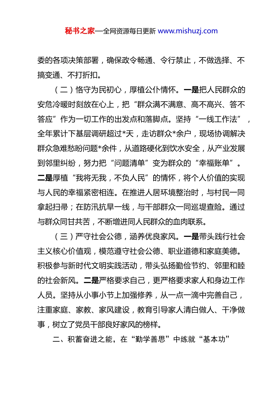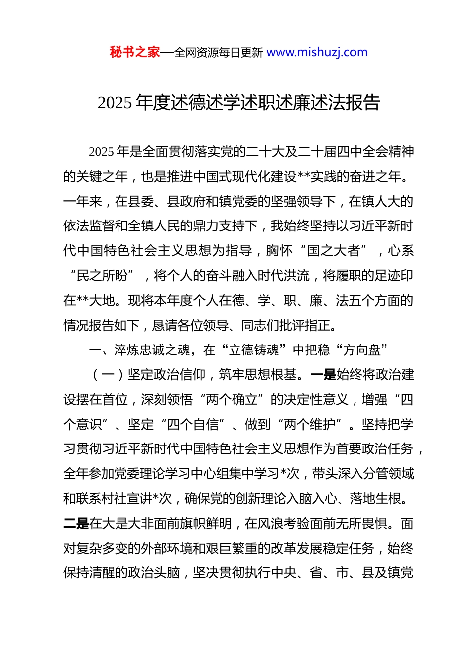 秘书之家—全网资源每日更新 www.mishuzj.com2025 年度述德述学述职述廉述法报告 2025 年是全面贯彻落实党的二十大及二十届四中全会精神的关键之年,也是推进中国式现代化建设**实践的奋进之年。一年来,在县委、县政府和镇党委的坚强领导下,在镇人大的依法监督和全镇人民的鼎力支持下,我始终坚持以习近平新时代中国特色社会主义思想为指导,胸怀“国之大者”,心系“民之所盼”,将个人的奋斗融入时代洪流,将履职的足迹印在**大地。现将本年度个人在德、学、职、廉、法五个方面的情况报告如下,恳请各位领导、同志们批评指正。一、淬炼忠诚之魂,在“立德铸魂”中把稳“方向盘”(一)坚定政治信仰,筑牢思想根基。一是始终将政治建设摆在首位,深刻领悟“两个确立”的决定性意义,增强“四个意识”、坚定“四个自信”、做到“两个维护”。坚持把学习贯彻习近平新时代中国特色社会主义思想作为首要政治任务,全年参加党委理论学习中心组集中学习*次,带头深入分管领域和联系村社宣讲*次,确保党的创新理论入脑入心、落地生根。二是在大是大非面前旗帜鲜明,在风浪考验面前无所畏惧。面对复杂多变的外部环境和艰巨繁重的改革发展稳定任务,始终保持清醒的政治头脑,坚决贯彻执行中央、省、市、县及镇党秘书之家—全网资源每日更新 www.mishuzj.com委的各项决策部署,确保政令畅通、令行禁止,不做选择、不搞变通、不打折扣。(二)恪守为民初心,厚植公仆情怀。一是把人民群众的安危冷暖时刻放在心上,把“群众满不满意、高不高兴、答不答应”作为一切工作的出发点和落脚点。坚持“一线工作法”,全年累计下基层调研超过*天,走访群众*余户,现场协调解决群众急难愁盼问题*余件,从道路硬化到饮水安全,从产业发展到邻里纠纷,努力把“问题清单”变为群众的“幸福账单”。二是厚植“我将无我,不负人民”的情怀,将个人价值的实现与人民的幸福紧密相连。在推进人居环境整治时,与村民一同拿起扫帚;在防汛抗旱一线,与干部群众一同巡堤查险。通过与群众同甘共苦,不断增进同人民群众的血肉联系。(三)严守社会公德,涵养优良家风。一是带头践行社会主义核心价值观,模范遵守社会公德、职业道德和家庭美德。积极参与新时代文明实践活动,带头弘扬勤俭节约、邻里和睦的社会新风。二是严格要求自己,更严格要求家人和身边工作人员。坚持从小事小节上加强修养,从一点一滴中完善自己,注重家庭、家教、家风建设,教育引导家人清白做人、干净做事,树立了党员干部良好家风的榜样。二、积蓄奋进之能,在“勤学善思”中练就“基本功”秘书之家—全网资源每日更新 www.mishuzj.com(一)聚焦“国之大者”,提升政治领悟力。我深知,只有胸怀全局,才能谋好一域。一年来,系统学习了党的二十大报告和二十届四中全会公报,深入研读了习近平总书记关于“三农”工作、高质量发展、基层治理等系列重要论述。通过学习,我更加深刻地理解了中国式现代化的宏伟蓝图,更加精准地把握了新发展阶段的时代特征,从而在谋划分管工作时,能够自觉站位全镇、全县乃至全国发展大局,确保各项工作始终沿着正确方向前进。(二)紧扣“镇之要务”,提升业务执行力。分管工作涉及经济发展、乡村振兴、安全生产等多个领域,专业性强、要求高。为此,我下足“绣花”功夫,深钻细研相关政策法规和业务知识。围绕现代农业发展,重点学习了中央一号文件精神和省市县关于特色产业发展的配套政策;围绕项目建设,主动学习掌握项目申报、土地报批、工程管理等全流程知识。全年参加各级各类业务培训*次,撰写学习笔记*万余字,努力使自己成为分管领域的“行家里手”,为科学决策、精准施策打下了坚实基础。(三)围绕“民之所盼”,提升群众工作能力。群众工作是我们的看家本领。我注重在实践中学习和提升做群众工作的能力。学习借鉴“千万工程”经验,探索推广“积分制”“清秘书之家—全网资源每日更新 www.mishuzj.com单制”等基层治理新模式,学会用群众听得懂的语言、易于接受的方式宣传政策、化解矛盾。在推进一项重大民生工程时,面对部分群众的不理解,我先后*次召开“庭院坝坝会”,与群众面对面讲政...