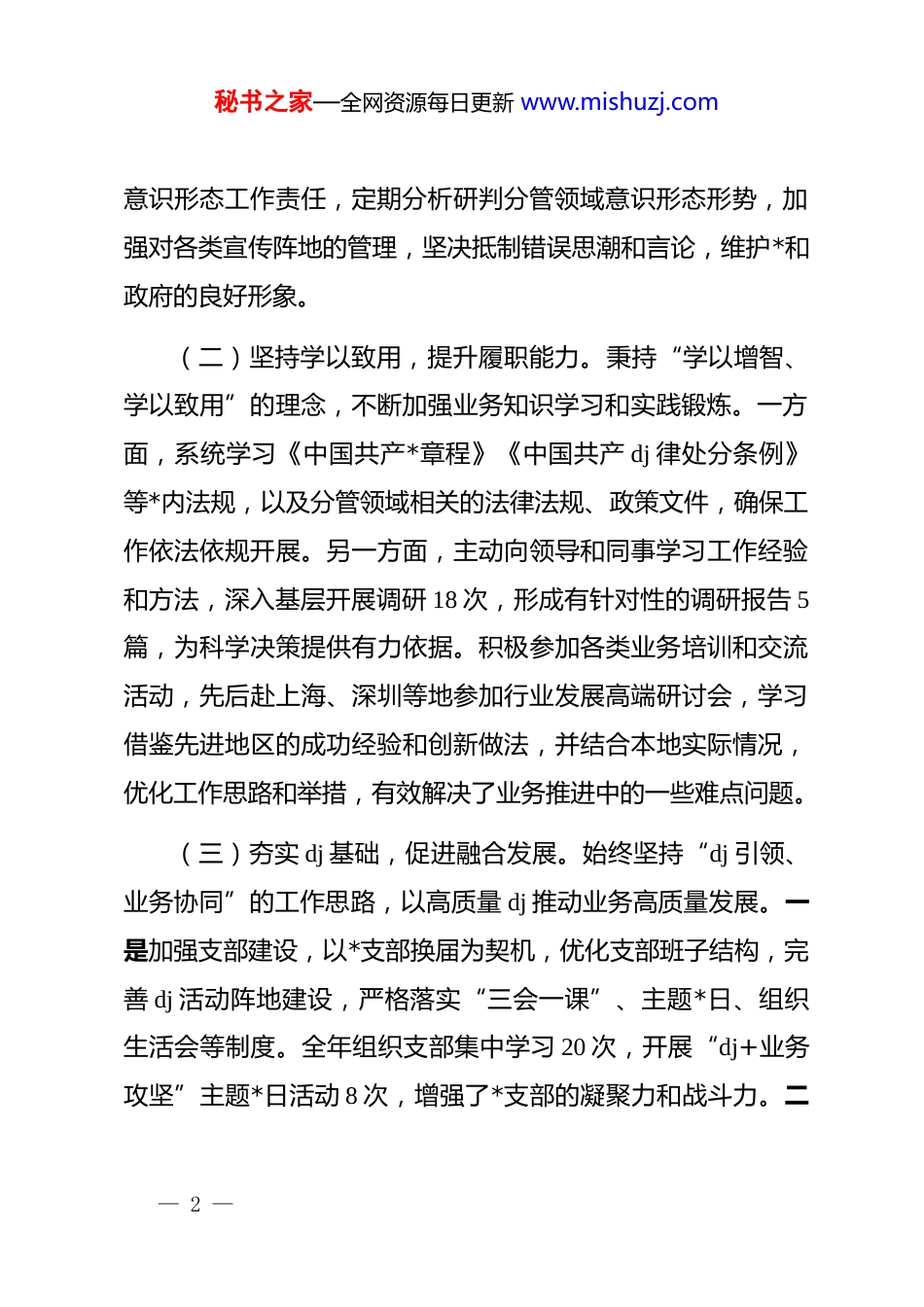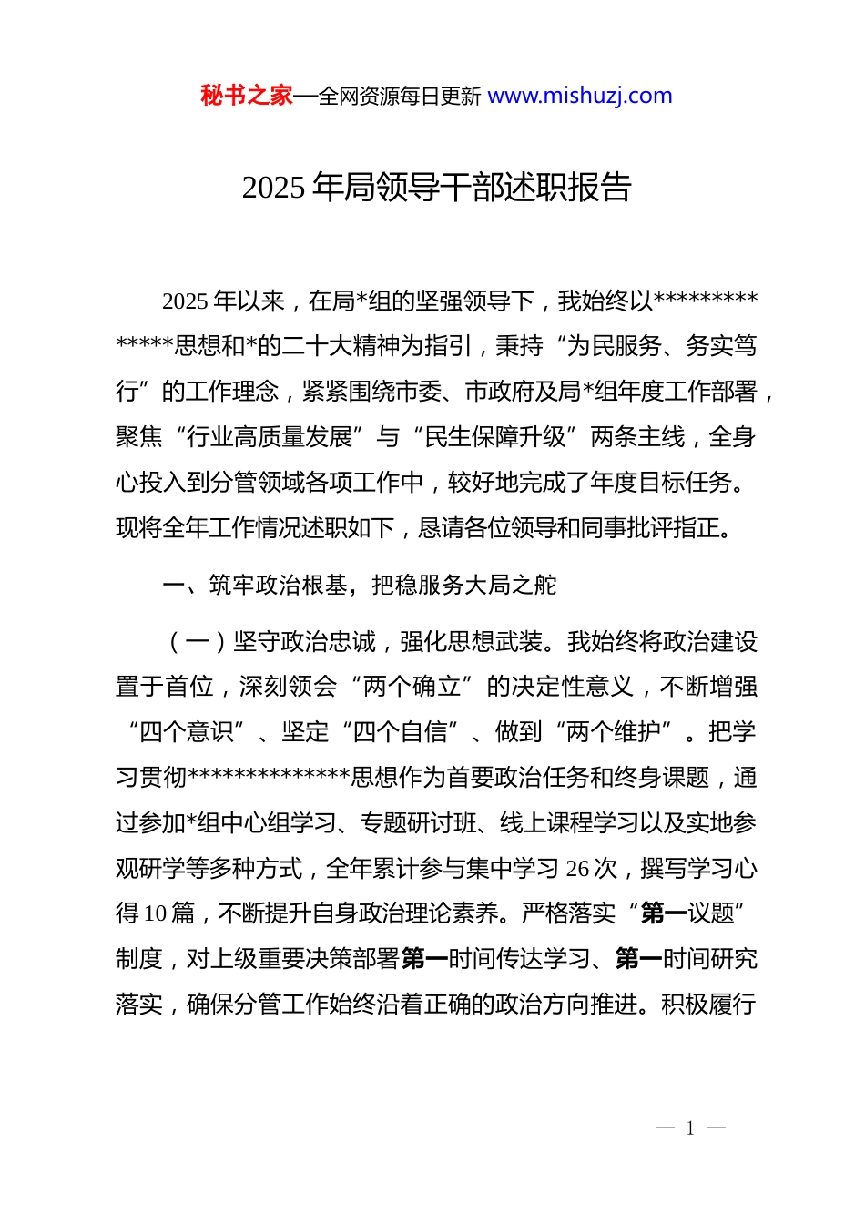 秘书之家—全网资源每日更新 www.mishuzj.com2025 年局领导干部述职报告2025 年以来,在局*组的坚强领导下,我始终以**************思想和*的二十大精神为指引,秉持“为民服务、务实笃行”的工作理念,紧紧围绕市委、市政府及局*组年度工作部署,聚焦“行业高质量发展”与“民生保障升级”两条主线,全身心投入到分管领域各项工作中,较好地完成了年度目标任务。现将全年工作情况述职如下,恳请各位领导和同事批评指正。一、筑牢政治根基,把稳服务大局之舵(一)坚守政治忠诚,强化思想武装。我始终将政治建设置于首位,深刻领会“两个确立”的决定性意义,不断增强“四个意识”、坚定“四个自信”、做到“两个维护”。把学习贯彻**************思想作为首要政治任务和终身课题,通过参加*组中心组学习、专题研讨班、线上课程学习以及实地参观研学等多种方式,全年累计参与集中学习 26 次,撰写学习心得 10 篇,不断提升自身政治理论素养。严格落实“第一议题”制度,对上级重要决策部署第一时间传达学习、第一时间研究落实,确保分管工作始终沿着正确的政治方向推进。积极履行— 1 —秘书之家—全网资源每日更新 www.mishuzj.com意识形态工作责任,定期分析研判分管领域意识形态形势,加强对各类宣传阵地的管理,坚决抵制错误思潮和言论,维护*和政府的良好形象。(二)坚持学以致用,提升履职能力。秉持“学以增智、学以致用”的理念,不断加强业务知识学习和实践锻炼。一方面,系统学习《中国共产*章程》《中国共产 dj 律处分条例》等*内法规,以及分管领域相关的法律法规、政策文件,确保工作依法依规开展。另一方面,主动向领导和同事学习工作经验和方法,深入基层开展调研 18 次,形成有针对性的调研报告 5篇,为科学决策提供有力依据。积极参加各类业务培训和交流活动,先后赴上海、深圳等地参加行业发展高端研讨会,学习借鉴先进地区的成功经验和创新做法,并结合本地实际情况,优化工作思路和举措,有效解决了业务推进中的一些难点问题。(三)夯实 dj 基础,促进融合发展。始终坚持“dj 引领、业务协同”的工作思路,以高质量 dj 推动业务高质量发展。一是加强支部建设,以*支部换届为契机,优化支部班子结构,完善 dj 活动阵地建设,严格落实“三会一课”、主题*日、组织生活会等制度。全年组织支部集中学习 20 次,开展“dj+业务攻坚”主题*日活动 8 次,增强了*支部的凝聚力和战斗力。二— 2 —秘书之家—全网资源每日更新 www.mishuzj.com是加强*员管理,开展*员亮身份、亮承诺、亮业绩活动,设立“*员先锋岗”6 个,成立*员突击队 3 支,激励*员在重点项目、关键任务中发挥先锋模范作用。三是推动 dj 与业务深度融合,将 dj 工作与行业监管、民生服务等中心工作同谋划、同部署、同落实、同考核。通过 dj 引领,解决了业务工作中的 15 个难题,实现了 dj 与业务相互促进、共同发展。二、聚焦主责主业,推动工作提质增效(一)推进重点项目建设,增强发展动力。积极协调各方资源,全力推进分管领域的重点项目建设。在[项目名称 1]建设中,加强与相关部门和单位的沟通协调,及时解决项目推进过程中遇到的土地征收、资金筹措、施工许可等问题,确保项目顺利开工建设。目前,该项目已完成主体工程的 x%,预计[具体时间]可全面竣工投入使用。在[项目名称 2]推进过程中,创新工作方式方法,引入市场化运作模式,吸引社会资本参与项目建设,有效缓解了资金压力。同时,加强对项目质量和安全的监管,确保项目建设符合标准和要求。截至年底,该项目已完成投资 x 亿元,完成年度计划的 x%。(二)加强行业监管,规范市场秩序。加大对分管行业的监管力度,维护市场公平竞争秩序。一是加强市场准入管理,— 3 —秘书之家—全网资源每日更新 www.mishuzj.com严格审查企业资质和条件,防止不符合要求的企业进入市场。全年共审核企业申请 x 家,驳回不符合条件的申请 x 家。二是加强日常监管执法,开展专项整治行动 x 次,检查企业 x 家次,查处违法违规行为 x 起,有效遏制了行业乱象。三是加强信用体系建设,建立...