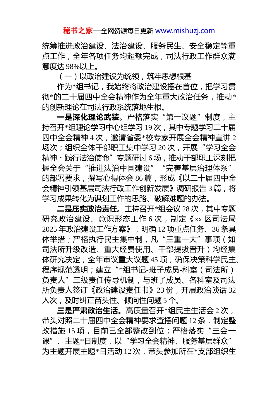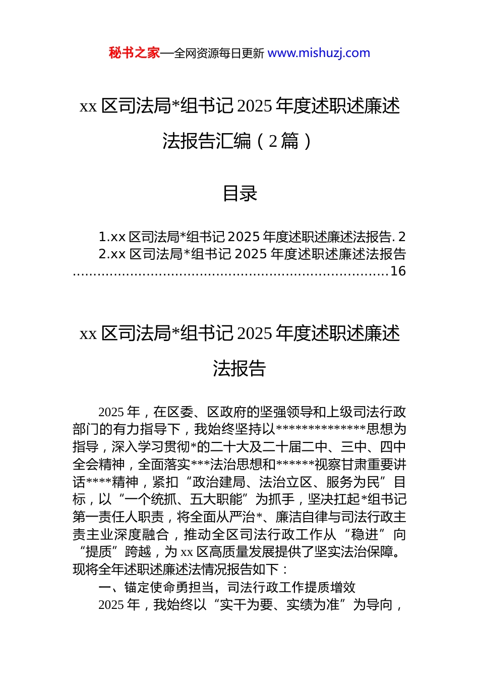 秘书之家—全网资源每日更新 www.mishuzj.comxx 区司法局*组书记 2025 年度述职述廉述法报告汇编(2 篇)目录1.xx 区司法局*组书记 2025 年度述职述廉述法报告. 22.xx 区司法局*组书记 2025 年度述职述廉述法报告.............................................................................16xx 区司法局*组书记 2025 年度述职述廉述法报告2025 年,在区委、区政府的坚强领导和上级司法行政部门的有力指导下,我始终坚持以**************思想为指导,深入学习贯彻*的二十大及二十届二中、三中、四中全会精神,全面落实***法治思想和******视察甘肃重要讲话****精神,紧扣“政治建局、法治立区、服务为民”目标,以“一个统抓、五大职能”为抓手,坚决扛起*组书记第一责任人职责,将全面从严治*、廉洁自律与司法行政主责主业深度融合,推动全区司法行政工作从“稳进”向“提质”跨越,为 xx 区高质量发展提供了坚实法治保障。现将全年述职述廉述法情况报告如下:一、锚定使命勇担当,司法行政工作提质增效2025 年,我始终以“实干为要、实绩为准”为导向,秘书之家—全网资源每日更新 www.mishuzj.com统筹推进政治建设、法治建设、服务民生、安全稳定等重点工作,全年各项任务均超额完成,司法行政工作群众满意度达 98%以上。(一)以政治建设为统领,筑牢思想根基作为*组书记,我始终将政治建设摆在首位,把学习贯彻*的二十届四中全会精神作为全年重大政治任务,推动*的创新理论在司法行政系统落地生根。一是深化理论武装。严格落实“第一议题”制度,主持召开*组理论学习中心组学习 19 次,其中专题学习二十届四中全会精神 4 次,邀请省委*校专家开展全会精神宣讲 2场次;组织全体干部职工集中学习 20 次,开展“学习全会精神・践行法治使命”专题研讨 6 场,推动干部职工深刻把握全会关于“推进法治中国建设”“完善基层治理体系”的部署要求,撰写心得体会 86 篇,形成《以二十届四中全会精神引领基层司法行政工作创新发展》调研报告 3 篇,将学习成果转化为谋划工作的思路、破解难题的办法。二是压实政治责任。主持召开*组会议 28 次,其中专题研究政治建设、意识形态工作 6 次,制定《xx 区司法局2025 年政治建设工作方案》,明确 12 项重点任务、36 条具体举措;严格执行民主集中制,凡“三重一大”事项(如司法所升级改造、重大经费使用、干部提拔晋升)均经集体研究决定,全年审议重大议题 45 项,确保决策科学民主、程序规范透明;建立“*组书记-班子成员-科室(司法所)负责人”三级责任传导机制,与班子成员、各科室及司法所负责人签订《政治建设责任书》23 份,开展政治谈话 32人次,及时纠正苗头性、倾向性问题 5 个。三是严肃政治生活。高质量召开*组民主生活会 2 次,带头对照二十届四中全会精神要求查摆问题 12 条,制定整改措施 15 项,目前已全部整改到位;严格落实“三会一课”、主题*日制度,以“学习全会精神、服务基层群众”为主题开展主题*日活动 12 次,带头参加所在*支部组织生秘书之家—全网资源每日更新 www.mishuzj.com活 10 次,指导 4 个基层司法所*支部完成标准化建设,推动*内政治生活走深走实。(二)以法治建设为核心,夯实发展根基紧扣区委“1134”法治建设工作计划,我牵头统筹全面依法治区工作,推动法治 xx 建设迈出新步伐。一是统筹依法治区全局。主持召开区委全面依法治区委员会第四次会议,审议通过《xx 区 2025 年全面依法治区工作要点》《xx 区法治政府建设示范创建实施方案》;组织 70 余名乡镇(街道)及区直单位*政主要负责人开展年度述法,将***法治思想和二十届四中全会“法治基层建设”要求纳入述法评价核心指标,倒逼责任落实;推动“一规划两方案”暨“八五”普法规划收官,牵头迎接省市终期评估验收并获“优秀”等次,xx 区被推荐为“全省法治建设先进区”候选对象。二是强化执法监督规范。聚焦二十届四中全会“规范行政执法”要求,深入开展“规范涉企行政执法专项行动”,迭代“扫码入企”监管模式,推行涉企检查“综合查一次”,全年涉企检...