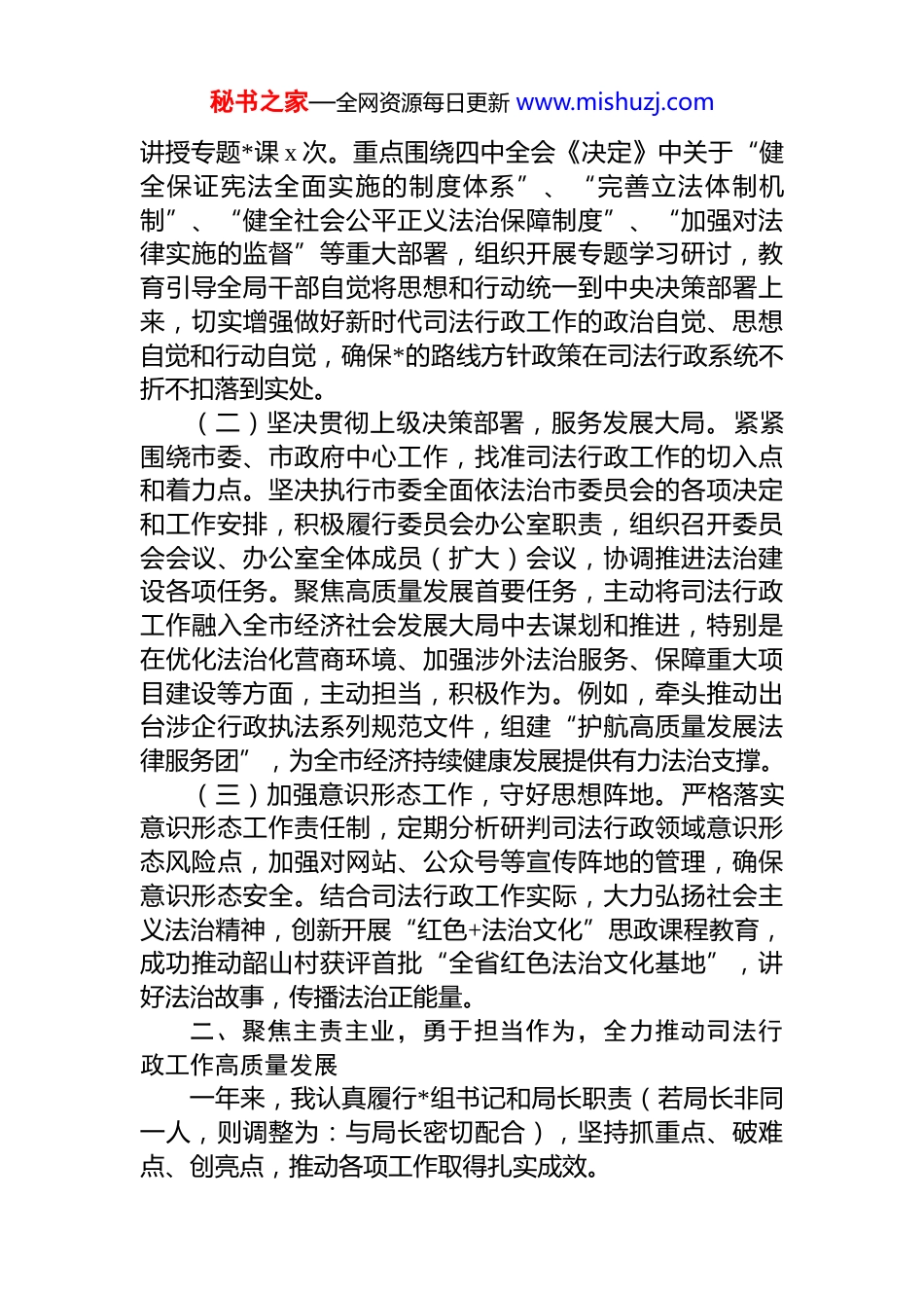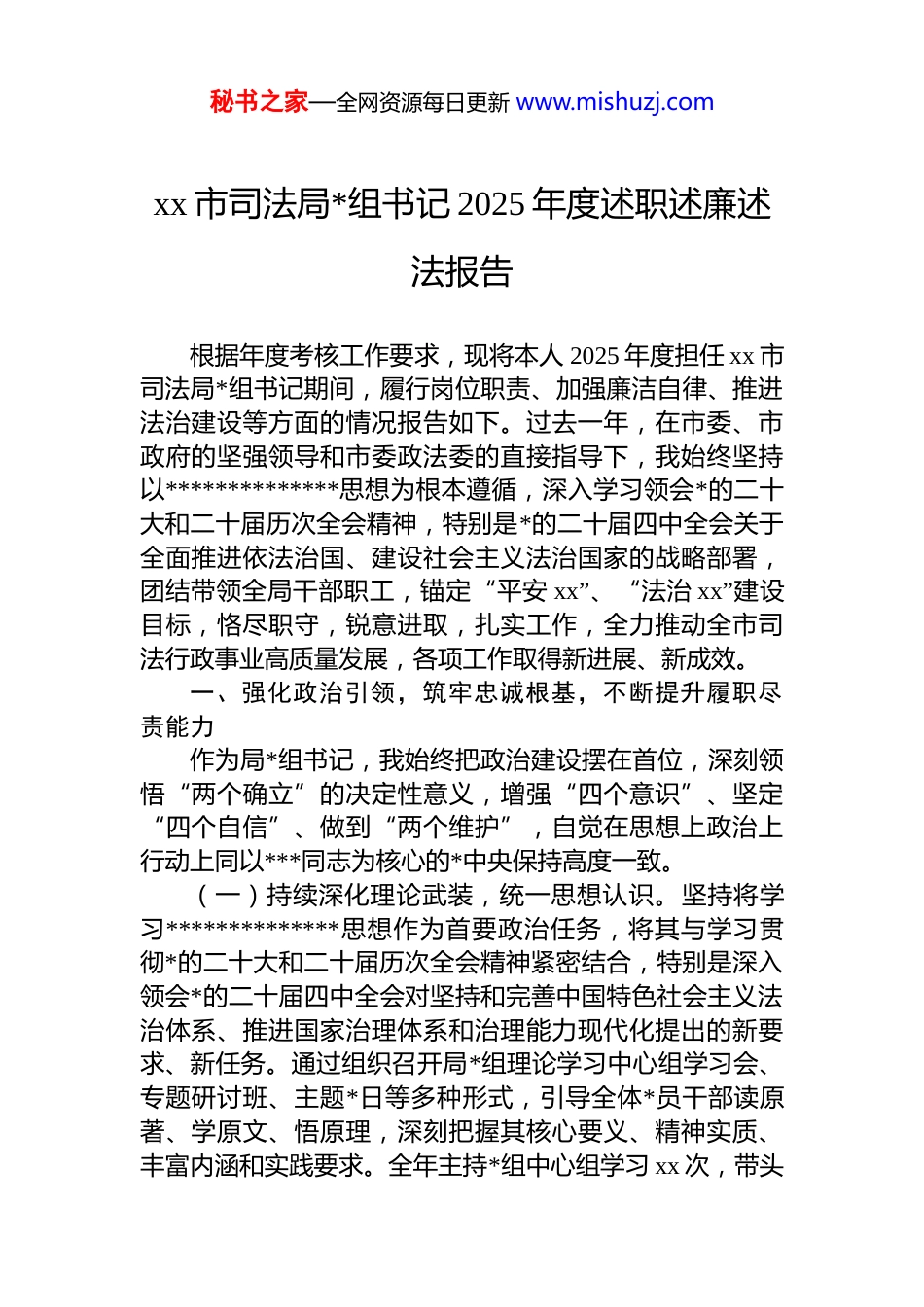 秘书之家—全网资源每日更新 www.mishuzj.comxx 市司法局*组书记 2025 年度述职述廉述法报告根据年度考核工作要求,现将本人 2025 年度担任 xx 市司法局*组书记期间,履行岗位职责、加强廉洁自律、推进法治建设等方面的情况报告如下。过去一年,在市委、市政府的坚强领导和市委政法委的直接指导下,我始终坚持以**************思想为根本遵循,深入学习领会*的二十大和二十届历次全会精神,特别是*的二十届四中全会关于全面推进依法治国、建设社会主义法治国家的战略部署,团结带领全局干部职工,锚定“平安 xx”、“法治 xx”建设目标,恪尽职守,锐意进取,扎实工作,全力推动全市司法行政事业高质量发展,各项工作取得新进展、新成效。一、强化政治引领,筑牢忠诚根基,不断提升履职尽责能力作为局*组书记,我始终把政治建设摆在首位,深刻领悟“两个确立”的决定性意义,增强“四个意识”、坚定“四个自信”、做到“两个维护”,自觉在思想上政治上行动上同以***同志为核心的*中央保持高度一致。(一)持续深化理论武装,统一思想认识。坚持将学习**************思想作为首要政治任务,将其与学习贯彻*的二十大和二十届历次全会精神紧密结合,特别是深入领会*的二十届四中全会对坚持和完善中国特色社会主义法治体系、推进国家治理体系和治理能力现代化提出的新要求、新任务。通过组织召开局*组理论学习中心组学习会、专题研讨班、主题*日等多种形式,引导全体*员干部读原著、学原文、悟原理,深刻把握其核心要义、精神实质、丰富内涵和实践要求。全年主持*组中心组学习 xx 次,带头秘书之家—全网资源每日更新 www.mishuzj.com讲授专题*课 x 次。重点围绕四中全会《决定》中关于“健全保证宪法全面实施的制度体系”、“完善立法体制机制”、“健全社会公平正义法治保障制度”、“加强对法律实施的监督”等重大部署,组织开展专题学习研讨,教育引导全局干部自觉将思想和行动统一到中央决策部署上来,切实增强做好新时代司法行政工作的政治自觉、思想自觉和行动自觉,确保*的路线方针政策在司法行政系统不折不扣落到实处。(二)坚决贯彻上级决策部署,服务发展大局。紧紧围绕市委、市政府中心工作,找准司法行政工作的切入点和着力点。坚决执行市委全面依法治市委员会的各项决定和工作安排,积极履行委员会办公室职责,组织召开委员会会议、办公室全体成员(扩大)会议,协调推进法治建设各项任务。聚焦高质量发展首要任务,主动将司法行政工作融入全市经济社会发展大局中去谋划和推进,特别是在优化法治化营商环境、加强涉外法治服务、保障重大项目建设等方面,主动担当,积极作为。例如,牵头推动出台涉企行政执法系列规范文件,组建“护航高质量发展法律服务团”,为全市经济持续健康发展提供有力法治支撑。(三)加强意识形态工作,守好思想阵地。严格落实意识形态工作责任制,定期分析研判司法行政领域意识形态风险点,加强对网站、公众号等宣传阵地的管理,确保意识形态安全。结合司法行政工作实际,大力弘扬社会主义法治精神,创新开展“红色+法治文化”思政课程教育,成功推动韶山村获评首批“全省红色法治文化基地”,讲好法治故事,传播法治正能量。二、聚焦主责主业,勇于担当作为,全力推动司法行政工作高质量发展一年来,我认真履行*组书记和局长职责(若局长非同一人,则调整为:与局长密切配合),坚持抓重点、破难点、创亮点,推动各项工作取得扎实成效。秘书之家—全网资源每日更新 www.mishuzj.com(一)强化法治统筹,依法治市迈出新步伐。健全统筹协调机制。切实发挥市委依法治市办职能作用,完善工作运行机制,组织召开相关会议,举办法治综合能力提升业务培训班,扎实推进年度 23 项法治改革任务落地见效。推动建立涉外法治人才培养协同机制,凝聚依法治市工作合力。发挥法治督察利剑作用。牵头制定并落实中央、省法治督察反馈问题整改方案,确保整改到位。创新实施“法治督察+市委巡察”联动机制,将法治建设情况纳入巡察重要内容,推动法治责任压实。2025 年度法治督察工作深入开展,法治政府建设满意度连续两年位居市直机关前列。...