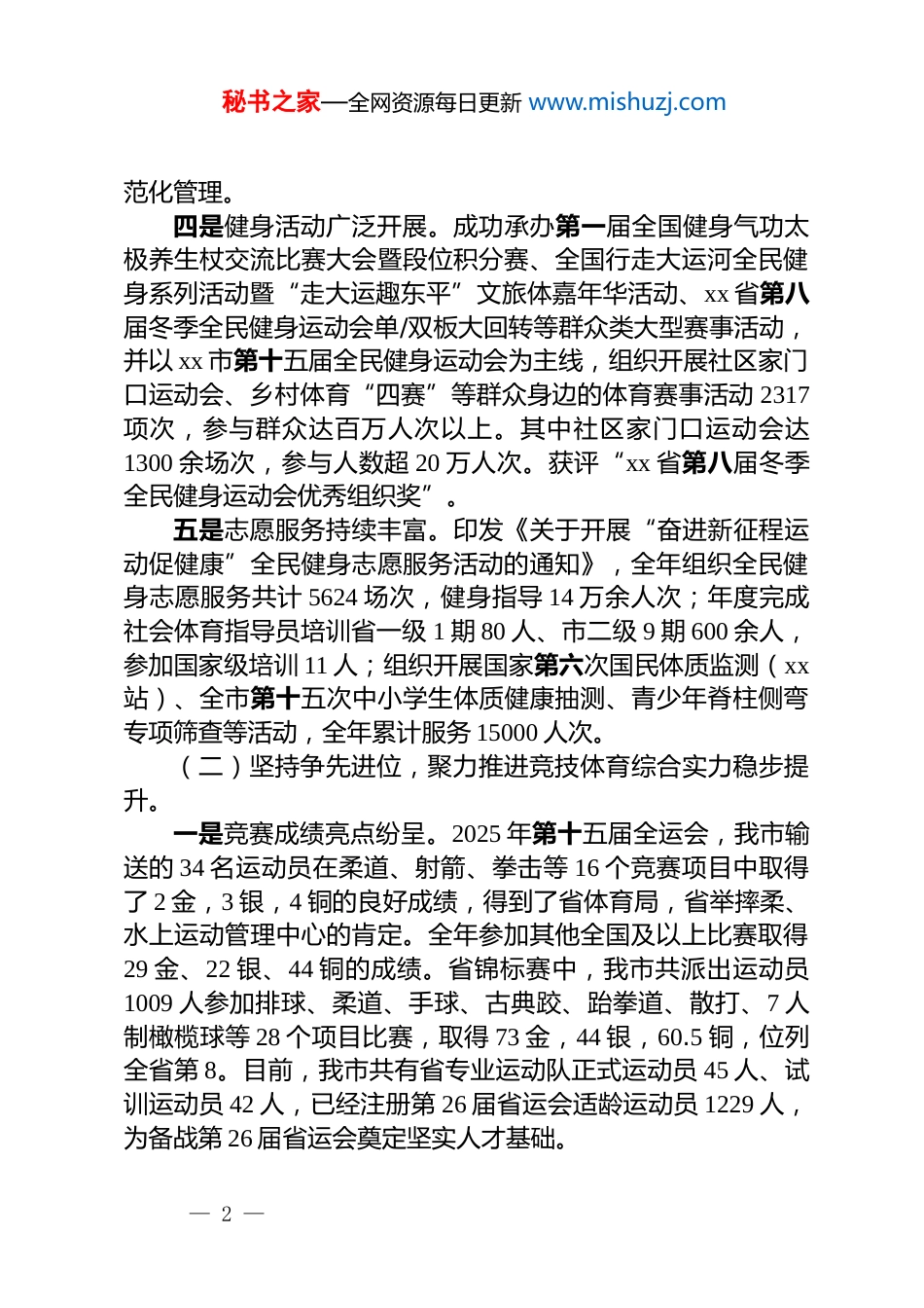 秘书之家—全网资源每日更新 www.mishuzj.comxx 市体育局 2025 年工作总结及 2026 年工作打算2025 年,在市委、市政府的坚强领导和省体育局的关心指导下,市体育局紧扣全市“登高望远、奋力争先”主旋律,锐意进取、真抓实干,全力以赴做好体育强市建设各项工作,聚力推动全民健身、竞技体育、体育产业等各项工作卓有成效开展,全市体育事业发展取得新成绩。一、2025 年工作总结(一)坚持惠民利民,聚力推进全民健身公共服务体系持续完善。一是 xxxx 顺利夺冠。圆满完成 2025 年“xxxx”和首届“xxxx”争霸赛 5 个主场、7 个客场的赛事工作,主场比赛场均观众超 2 万人次,累计观众超 10.6 万人次,各网络平台浏览量和话题热度超千万。xx 队勇夺“xxxx”与“xxxx”争霸赛“双冠王”,xx 成为全省首个足球“双冠之城”,为 xx 增添了新的城市名片,城市凝聚力和足球氛围空前高涨。二是场地设施充实优化。实施“国球进社区、进公园”项目,配置乒乓球台 92 件,新建改扩建健身场所 79 处;开展全民健身器材“五进”项目,为包括 7 个第一书记帮包村在内的21 个单位配建体育器材;全年完成维护器材 2115 件,更新器材1693 件,督导落实 9 处公共体育场馆按规定向社会免费或低收费开放。市体育中心获评“公共体育场馆公益开放典型单位”。三是社会组织有序运作。将 84 个市管体育类协会(社团)和 112 个体育类民非单位划分为 6 个类别,对应成立 6 个(功能性)*支部,实现 dj 对体育社会组织的全面覆盖;率先在全省制定出台《xx 市市级体育协会管理办法》,强化社会组织规— 1 —秘书之家—全网资源每日更新 www.mishuzj.com范化管理。四是健身活动广泛开展。成功承办第一届全国健身气功太极养生杖交流比赛大会暨段位积分赛、全国行走大运河全民健身系列活动暨“走大运趣东平”文旅体嘉年华活动、xx 省第八届冬季全民健身运动会单/双板大回转等群众类大型赛事活动,并以 xx 市第十五届全民健身运动会为主线,组织开展社区家门口运动会、乡村体育“四赛”等群众身边的体育赛事活动 2317项次,参与群众达百万人次以上。其中社区家门口运动会达1300 余场次,参与人数超 20 万人次。获评“xx 省第八届冬季全民健身运动会优秀组织奖”。五是志愿服务持续丰富。印发《关于开展“奋进新征程运动促健康”全民健身志愿服务活动的通知》,全年组织全民健身志愿服务共计 5624 场次,健身指导 14 万余人次;年度完成社会体育指导员培训省一级 1 期 80 人、市二级 9 期 600 余人,参加国家级培训 11 人;组织开展国家第六次国民体质监测(xx站)、全市第十五次中小学生体质健康抽测、青少年脊柱侧弯专项筛查等活动,全年累计服务 15000 人次。(二)坚持争先进位,聚力推进竞技体育综合实力稳步提升。一是竞赛成绩亮点纷呈。2025 年第十五届全运会,我市输送的 34 名运动员在柔道、射箭、拳击等 16 个竞赛项目中取得了 2 金,3 银,4 铜的良好成绩,得到了省体育局,省举摔柔、水上运动管理中心的肯定。全年参加其他全国及以上比赛取得29 金、22 银、44 铜的成绩。省锦标赛中,我市共派出运动员1009 人参加排球、柔道、手球、古典跤、跆拳道、散打、7 人制橄榄球等 28 个项目比赛,取得 73 金,44 银,60.5 铜,位列全省第 8。目前,我市共有省专业运动队正式运动员 45 人、试训运动员 42 人,已经注册第 26 届省运会适龄运动员 1229 人,为备战第 26 届省运会奠定坚实人才基础。— 2 —秘书之家—全网资源每日更新 www.mishuzj.com二是体教融合深入推进。联合市教育局举办 2025 年 xx 市青少年(学生)七项体育联赛,共计 2700 余名青少年运动员参赛。印发《xx 省第二十六届运动会周期体教融合共建市级运动队的通知》(x〔2025〕x 号),推进市体校、市体育事业发展中心 12 个运动项目与城区 24 所学校合作共建运动队,构建“小学—初中—高中”“训练连贯+升学衔接”一条龙人才培养通道。三是大力发展青少年赛事。依托社会力量,成功承办省级及以上青少年赛事及“决...