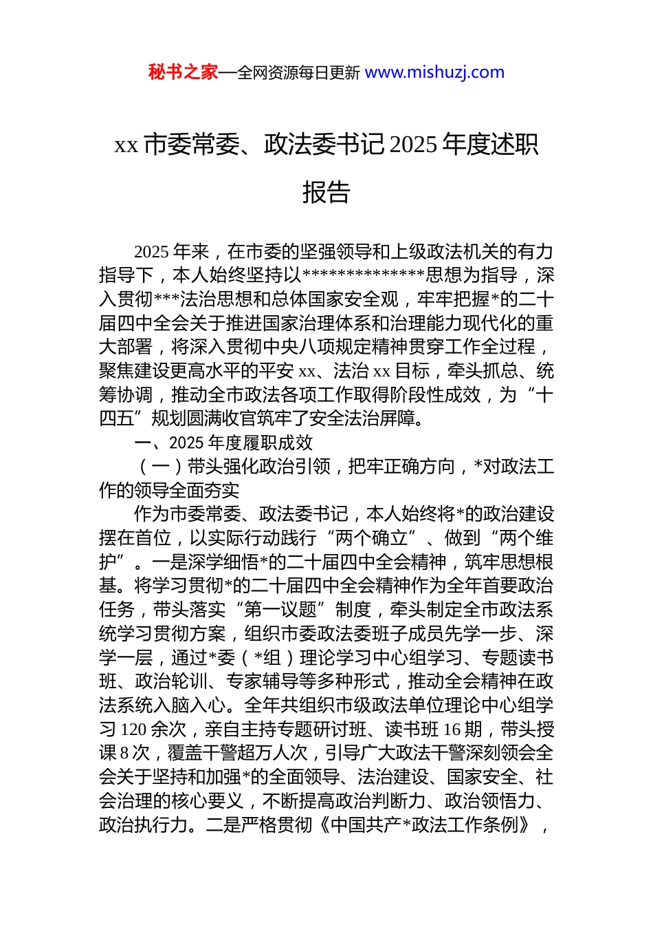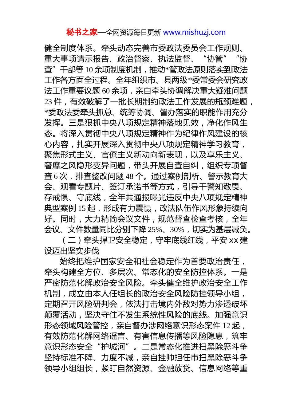 秘书之家—全网资源每日更新 www.mishuzj.comxx 市委常委、政法委书记 2025 年度述职报告2025 年来,在市委的坚强领导和上级政法机关的有力指导下,本人始终坚持以**************思想为指导,深入贯彻***法治思想和总体国家安全观,牢牢把握*的二十届四中全会关于推进国家治理体系和治理能力现代化的重大部署,将深入贯彻中央八项规定精神贯穿工作全过程,聚焦建设更高水平的平安 xx、法治 xx 目标,牵头抓总、统筹协调,推动全市政法各项工作取得阶段性成效,为“十四五”规划圆满收官筑牢了安全法治屏障。一、2025 年度履职成效(一)带头强化政治引领,把牢正确方向,*对政法工作的领导全面夯实作为市委常委、政法委书记,本人始终将*的政治建设摆在首位,以实际行动践行“两个确立”、做到“两个维护”。一是深学细悟*的二十届四中全会精神,筑牢思想根基。将学习贯彻*的二十届四中全会精神作为全年首要政治任务,带头落实“第一议题”制度,牵头制定全市政法系统学习贯彻方案,组织市委政法委班子成员先学一步、深学一层,通过*委(*组)理论学习中心组学习、专题读书班、政治轮训、专家辅导等多种形式,推动全会精神在政法系统入脑入心。全年共组织市级政法单位理论中心组学习 120 余次,亲自主持专题研讨班、读书班 16 期,带头授课 8 次,覆盖干警超万人次,引导广大政法干警深刻领会全会关于坚持和加强*的全面领导、法治建设、国家安全、社会治理的核心要义,不断提高政治判断力、政治领悟力、政治执行力。二是严格贯彻《中国共产*政法工作条例》,秘书之家—全网资源每日更新 www.mishuzj.com健全制度体系。牵头动态完善市委政法委员会工作规则、重大事项请示报告、政治督察、执法监督、“协管”“协查”干部等 10 余项制度机制,推动*管政法原则落实到政法工作各方面全过程。全年组织市、县两级*委常委会研究政法工作重要议题 60 余项,亲自牵头协调解决重大疑难问题23 件,有效破解了一批长期制约政法工作发展的瓶颈难题,*委政法委牵头抓总、统筹协调、督办落实的职能作用充分发挥。三是狠抓中央八项规定精神落地见效,净化作风生态。将深入贯彻中央八项规定精神作为纪律作风建设的核心内容,扎实开展深入贯彻中央八项规定精神学习教育,聚焦形式主义、官僚主义新动向新表现,以及享乐主义、奢靡之风隐形变异问题,带头开展自查自纠,组织专项督查 6 次,排查整改问题 48 个。通过案例剖析、警示教育大会、观看专题片、签订承诺书等方式,引导干警知敬畏、存戒惧、守底线,全年共通报曝光违反中央八项规定精神典型案例 15 起,形成有力震慑,政法队伍作风形象持续向好。同时,大力精简会议文件,规范督查检查考核,全年会议、文件数量同比分别下降 25%、30%,切实为基层减负。(二)牵头捍卫安全稳定,守牢底线红线,平安 xx 建设迈出坚实步伐始终把维护国家安全和社会稳定作为首要政治责任,牵头构建全方位、多层次、常态化的安全防控体系。一是严密防范化解政治安全风险。牵头健全维护政治安全工作机制,成立由本人任组长的政治安全风险防控领导小组,定期召开风险研判会,依法打击境内外敌对势力渗透破坏颠覆活动,坚决守住不发生系统性风险的底线。加强意识形态领域风险管控,亲自督办涉网络意识形态案件 12 起,有效防范化解网络谣言、有害信息传播等风险隐患,筑牢意识形态安全“护城河”。二是常态化推进扫黑除恶斗争坚持标准不降、力度不减,亲自挂帅担任市扫黑除恶斗争领导小组组长,紧盯自然资源、金融放贷、信息网络等重秘书之家—全网资源每日更新 www.mishuzj.com点行业领域,深化专项整治。全年新打掉涉黑犯罪组织 1 个、恶势力犯罪集团 2 个,破获各类刑事案件 40 余起,抓获犯罪嫌疑人 60 余名,“打伞破网”持续深入,查处涉黑涉恶“保护伞”5 人。扎实开展“扫黑恶、治乱象、护民生”专项行动,亲自带队督导检查重点县区、重点行业 18 次,推动行业乱象得到有效整治,社会治安环境进一步净化。三是依法严惩各类突出违法犯罪。针对人民群众反映强烈的违法犯罪问题,牵头组织开展系列专项打击行动。命案...
