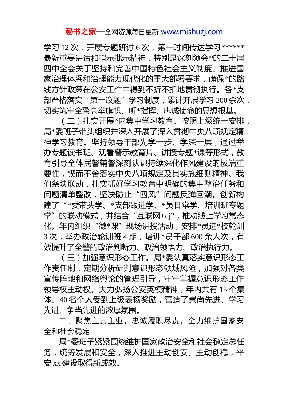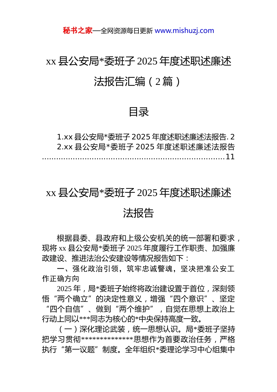 秘书之家—全网资源每日更新 www.mishuzj.comxx 县公安局*委班子 2025 年度述职述廉述法报告汇编(2 篇)目录1.xx 县公安局*委班子 2025 年度述职述廉述法报告. 22.xx 县公安局*委班子 2025 年度述职述廉述法报告.............................................................................11xx 县公安局*委班子 2025 年度述职述廉述法报告根据县委、县政府和上级公安机关的统一部署和要求,现将 xx 县公安局*委班子 2025 年度履行工作职责、加强廉政建设、推进法治公安建设等情况报告如下:一、强化政治引领,筑牢忠诚警魂,坚决把准公安工作正确方向2025 年,局*委班子始终将政治建设置于首位,深刻领悟“两个确立”的决定性意义,增强“四个意识”、坚定“四个自信”、做到“两个维护”,自觉在思想上政治上行动上同以***同志为核心的*中央保持高度一致。(一)深化理论武装,统一思想认识。局*委班子坚持把学习贯彻**************思想作为首要政治任务,严格执行“第一议题”制度。全年组织*委理论学习中心组集中秘书之家—全网资源每日更新 www.mishuzj.com学习 12 次,开展专题研讨 6 次,第一时间传达学习******最新重要讲话和指示批示精神,特别是深刻领会*的二十届四中全会关于坚持和完善中国特色社会主义制度、推进国家治理体系和治理能力现代化的重大部署要求,确保*的路线方针政策在公安工作中得到不折不扣地贯彻执行。各*支部严格落实“第一议题”学习制度,累计开展学习 200 余次,切实筑牢全警高举旗帜、听*指挥、忠诚使命的思想根基。(二)扎实开展*内集中学习教育。按照上级统一安排,局*委班子带头组织并深入开展了深入贯彻中央八项规定精神学习教育。坚持领导干部先学一步、学深一层,通过举办专题读书班、观看警示教育片、讲授专题*课等形式,教育引导全体民警辅警深刻认识持续深化作风建设的极端重要性,锲而不舍落实中央八项规定及其实施细则精神。我们条块联动,扎实抓好学习教育中明确的集中整治任务和问题清单整改,坚决防止“四风”问题反弹回潮。创新构建了“*委带头学、*支部跟进学、*员日常学、培训班专题学”的联动模式,并结合“互联网+dj”,推动线上学习常态化。年内组织“微*课”现场讲授活动,安排*员进*校轮训3 次,举办政治轮训班 4 期,培训*员干部 600 余人次,有效提升了全警的政治判断力、政治领悟力、政治执行力。(三)加强意识形态工作。局*委认真落实意识形态工作责任制,定期分析研判意识形态领域风险,加强对各类宣传阵地和网络舆论的管理引导,牢牢掌握意识形态工作领导权主动权。大力弘扬公安英模精神,年内共有 15 个集体、40 名个人受到上级表扬奖励,营造了崇尚先进、学习先进、争当先进的浓厚氛围。二、聚焦主责主业,忠诚履职尽责,全力维护国家安全和社会稳定局*委班子紧紧围绕维护国家政治安全和社会稳定总任务,统筹发展和安全,深入推进主动创安、主动创稳,平安 xx 建设取得新成效。秘书之家—全网资源每日更新 www.mishuzj.com(一)坚决维护政治安全。始终把维护国家政治安全特别是政权安全、制度安全放在第一位,严密防范、严厉打击境内外敌对势力的渗透颠覆破坏活动,坚决捍卫中国共产*的领导和中国特色社会主义制度。(二)严打突出违法犯罪。始终保持对各类违法犯罪的高压震慑态势。深入推进常态化扫黑除恶斗争,巩固专项斗争成果。将打击治理电信网络诈骗犯罪作为重中之重建立多部门联动的反诈工作机制,联合银行、通信运营商等部门加强信息共享和协作配合,及时阻断诈骗链条。全年开展反诈宣传活动 60 余次,通过系列精准宣传,我县电信诈骗案件发案率同比下降 14.85%;成功进行资金预警见面劝阻 122 人次,同比下降 39.6%,追赃挽损合计 450 余万元。创新推出“村干部说反诈”等系列短视频,用乡音乡味助推安全防范,总阅读量达 1000 万人次,有效提升了群众防骗意识。针对盗窃、抢劫等多发性侵财犯罪,加强研判串并,提升打击精度,全县此类案件发案率明显下降。深入开展禁毒人民战争,加大毒品查缉打击力度,开展禁毒宣传活动 9 次,发放宣传资料...