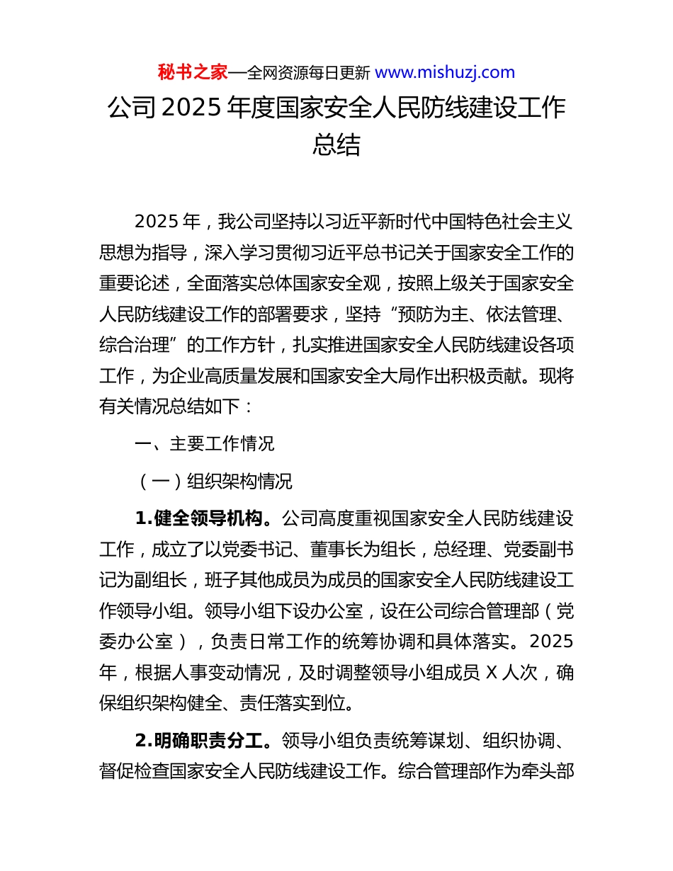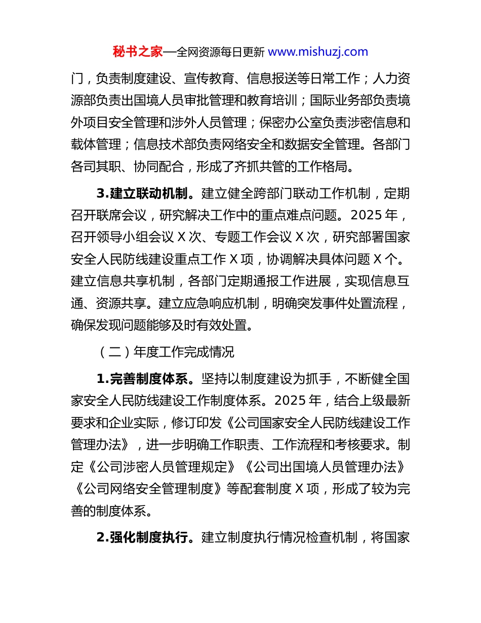 秘书之家—全网资源每日更新 www.mishuzj.com公司 2025 年度国家安全人民防线建设工作总结2025 年,我公司坚持以习近平新时代中国特色社会主义思想为指导,深入学习贯彻习近平总书记关于国家安全工作的重要论述,全面落实总体国家安全观,按照上级关于国家安全人民防线建设工作的部署要求,坚持“预防为主、依法管理、综合治理”的工作方针,扎实推进国家安全人民防线建设各项工作,为企业高质量发展和国家安全大局作出积极贡献。现将有关情况总结如下:一、主要工作情况(一)组织架构情况1.健全领导机构。公司高度重视国家安全人民防线建设工作,成立了以党委书记、董事长为组长,总经理、党委副书记为副组长,班子其他成员为成员的国家安全人民防线建设工作领导小组。领导小组下设办公室,设在公司综合管理部(党委办公室),负责日常工作的统筹协调和具体落实。2025年,根据人事变动情况,及时调整领导小组成员 X 人次,确保组织架构健全、责任落实到位。2.明确职责分工。领导小组负责统筹谋划、组织协调、督促检查国家安全人民防线建设工作。综合管理部作为牵头部秘书之家—全网资源每日更新 www.mishuzj.com门,负责制度建设、宣传教育、信息报送等日常工作;人力资源部负责出国境人员审批管理和教育培训;国际业务部负责境外项目安全管理和涉外人员管理;保密办公室负责涉密信息和载体管理;信息技术部负责网络安全和数据安全管理。各部门各司其职、协同配合,形成了齐抓共管的工作格局。3.建立联动机制。建立健全跨部门联动工作机制,定期召开联席会议,研究解决工作中的重点难点问题。2025 年,召开领导小组会议 X 次、专题工作会议 X 次,研究部署国家安全人民防线建设重点工作 X 项,协调解决具体问题 X 个。建立信息共享机制,各部门定期通报工作进展,实现信息互通、资源共享。建立应急响应机制,明确突发事件处置流程,确保发现问题能够及时有效处置。(二)年度工作完成情况1.完善制度体系。坚持以制度建设为抓手,不断健全国家安全人民防线建设工作制度体系。2025 年,结合上级最新要求和企业实际,修订印发《公司国家安全人民防线建设工作管理办法》,进一步明确工作职责、工作流程和考核要求。制定《公司涉密人员管理规定》《公司出国境人员管理办法》《公司网络安全管理制度》等配套制度 X 项,形成了较为完善的制度体系。2.强化制度执行。建立制度执行情况检查机制,将国家秘书之家—全网资源每日更新 www.mishuzj.com安全人民防线建设工作纳入公司年度综合考核内容。定期开展制度执行情况检查,全年开展专项检查 X 次,发现并整改问题 X 个。通过制度的刚性约束,推动各项工作规范化、常态化运行。(三)宣传教育开展情况1.丰富教育形式。采取“线上+线下”相结合的方式,多渠道、多形式开展宣传教育活动。一是开展集中学习。结合党委理论学习中心组学习、“三会一课”、主题党日等载体,组织集中学习 X 次,参学人员 X 人次。二是举办专题培训。邀请国家安全机关、保密部门专家授课 X 场次,组织观看国家安全教育专题片 X 部,培训人员 X 人次。三是组织知识竞赛。在“4·15”全民国家安全教育日期间,举办国家安全知识竞赛 X 场,参与员工 X 人次,评选表彰优秀个人 X 名。四是开展案例警示教育。收集整理近年来典型案例,编印《国家安全警示教育案例汇编》,组织集中观看警示教育片 X 场次,以案为鉴、警钟长鸣。五是加强线上宣传。在公司微信公众号开设“国家安全”专栏,推送宣传文章 X 篇、短视频 X 条,阅读量累计达 X 人次。六是强化线下宣传。在公司办公区域、项目现场张贴宣传海报 X 张,设置宣传栏 X 处,悬挂横幅标语 X 条,营造浓厚宣传氛围。2.突出教育内容。紧扣国家安全法律法规和企业实际,秘书之家—全网资源每日更新 www.mishuzj.com精心设计教育内容。一是深入学习法律法规。系统学习《中华人民共和国国家安全法》《中华人民共和国反间谍法》《中华人民共和国反间谍法实施细则》《中华人民共和国网络安全法》《中华人民共和国数据安全法》《中华人民共和国保守国家秘密法》等法...