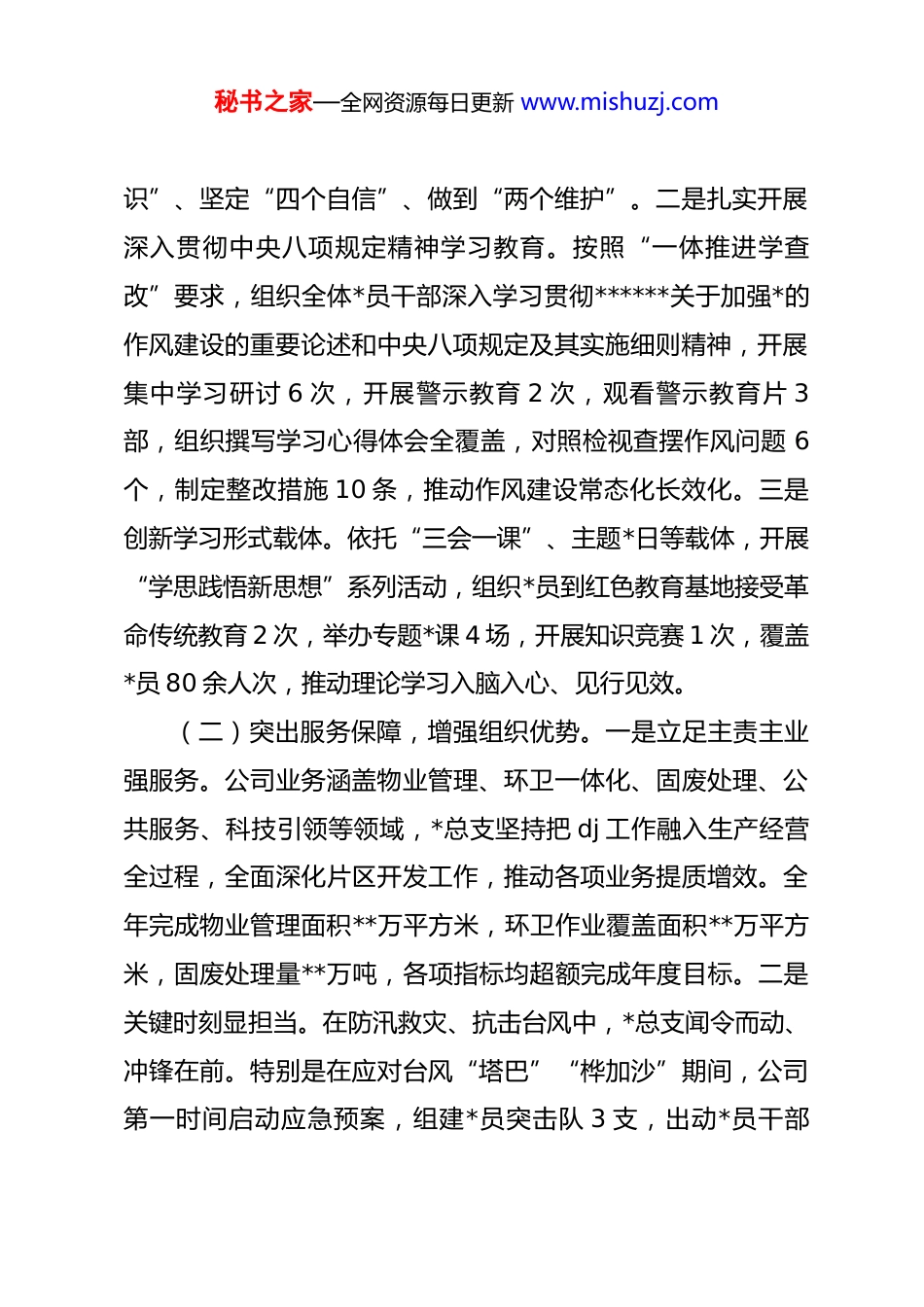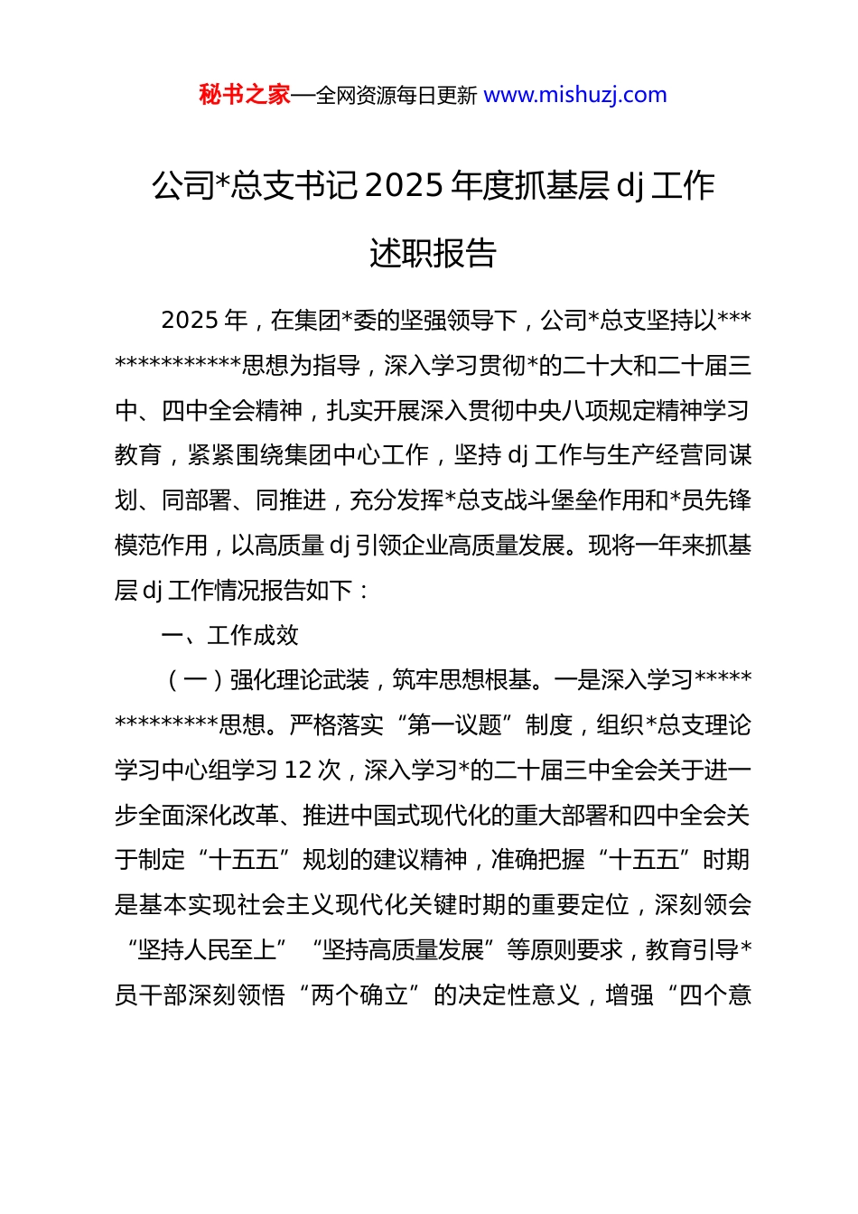 秘书之家—全网资源每日更新 www.mishuzj.com公司*总支书记 2025 年度抓基层 dj 工作述职报告2025 年,在集团*委的坚强领导下,公司*总支坚持以**************思想为指导,深入学习贯彻*的二十大和二十届三中、四中全会精神,扎实开展深入贯彻中央八项规定精神学习教育,紧紧围绕集团中心工作,坚持 dj 工作与生产经营同谋划、同部署、同推进,充分发挥*总支战斗堡垒作用和*员先锋模范作用,以高质量 dj 引领企业高质量发展。现将一年来抓基层 dj 工作情况报告如下:一、工作成效(一)强化理论武装,筑牢思想根基。一是深入学习**************思想。严格落实“第一议题”制度,组织*总支理论学习中心组学习 12 次,深入学习*的二十届三中全会关于进一步全面深化改革、推进中国式现代化的重大部署和四中全会关于制定“十五五”规划的建议精神,准确把握“十五五”时期是基本实现社会主义现代化关键时期的重要定位,深刻领会“坚持人民至上”“坚持高质量发展”等原则要求,教育引导*员干部深刻领悟“两个确立”的决定性意义,增强“四个意秘书之家—全网资源每日更新 www.mishuzj.com识”、坚定“四个自信”、做到“两个维护”。二是扎实开展深入贯彻中央八项规定精神学习教育。按照“一体推进学查改”要求,组织全体*员干部深入学习贯彻******关于加强*的作风建设的重要论述和中央八项规定及其实施细则精神,开展集中学习研讨 6 次,开展警示教育 2 次,观看警示教育片 3部,组织撰写学习心得体会全覆盖,对照检视查摆作风问题 6个,制定整改措施 10 条,推动作风建设常态化长效化。三是创新学习形式载体。依托“三会一课”、主题*日等载体,开展“学思践悟新思想”系列活动,组织*员到红色教育基地接受革命传统教育 2 次,举办专题*课 4 场,开展知识竞赛 1 次,覆盖*员 80 余人次,推动理论学习入脑入心、见行见效。(二)突出服务保障,增强组织优势。一是立足主责主业强服务。公司业务涵盖物业管理、环卫一体化、固废处理、公共服务、科技引领等领域,*总支坚持把 dj 工作融入生产经营全过程,全面深化片区开发工作,推动各项业务提质增效。全年完成物业管理面积**万平方米,环卫作业覆盖面积**万平方米,固废处理量**万吨,各项指标均超额完成年度目标。二是关键时刻显担当。在防汛救灾、抗击台风中,*总支闻令而动、冲锋在前。特别是在应对台风“塔巴”“桦加沙”期间,公司第一时间启动应急预案,组建*员突击队 3 支,出动*员干部秘书之家—全网资源每日更新 www.mishuzj.com150 余人次,连续奋战 48 小时,全力做好辖区内道路清障、树木扶正、积水排涝、设施抢修等工作,清理倒伏树木**棵,排除积水点**处,有效保障了群众生命财产安全,彰显了国企担当。三是在基孔肯雅热疫情防控中彰显*组织力量。9 月份江门市启动突发公共卫生事件ⅲ级响应后,*总支第一时间响应市委、市政府号召,*员干部主动请缨、积极投身疫情防控一线。累计出动消杀队伍 80 余人次,配备喷雾器 30 余台,配合社区开展蚊媒消杀、积水清理、入户宣传等工作,消杀面积达**万平方米,发放宣传资料**份,为打赢基孔肯雅热疫情防控歼灭战贡献国企力量。(三)聚焦 dj 重点,夯实基层基础。一是圆满完成换届选举工作。按照集团*委统一部署,严格执行选举程序,规范有序完成*总支换届选举,选优配强支部委员会,新一届班子成员平均年龄下降、学历层次提升,进一步增强班子整体功能和战斗力。二是积极服务乡村振兴战略。发挥国企担当,深入开展结对帮扶工作,组织*员干部赴结对村开展“我为群众办实事”实践活动 4 次,捐赠帮扶资金和物资共计**万元,帮助解决农产品销售、基础设施解决等实际问题,助力乡村产业发展和人居环境提升。三是紧密结合集团发展战略。围绕集团“十五五”规划编制工作,组织*员骨干开展专题调研讨论 3 次,征集发展秘书之家—全网资源每日更新 www.mishuzj.com建议 15 条,为公司战略发展建言献策。推动 dj 工作与生产经营深度融合,设立*员责任区 5 个、*员先锋岗 8 个,在重大项目攻坚、难点问题突破中充分发挥*员先...