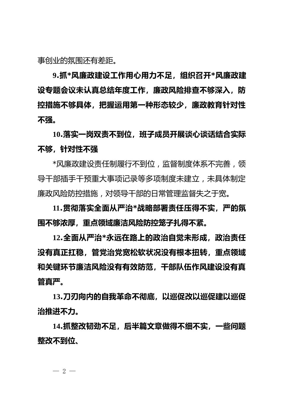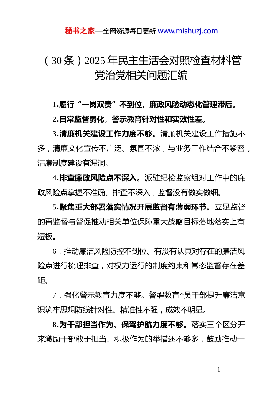 秘书之家—全网资源每日更新 www.mishuzj.com(30 条)2025 年民主生活会对照检查材料管党治党相关问题汇编1.履行“一岗双责”不到位,廉政风险动态化管理滞后。2.日常监督弱化,警示教育针对性和实效性差。3.清廉机关建设工作力度不够。清廉机关建设工作措施不多,清廉文化宣传不广泛、氛围不浓,与业务工作结合不紧密,清廉制度建设有漏洞。4.排查廉政风险点不深入。派驻纪检监察组对工作中的廉政风险点掌握不准确、排查不深入,监督没有做实做细。5.聚焦重大部署落实情况开展监督有薄弱环节。立足监督的再监督与督促推动相关单位保障重大战略目标落地落实上有短板。6.推动廉洁风险防控不到位。有没有认真对存在的廉洁风险点进行梳理排查,对权力运行的制度约束和常态监督存在差距。7.强化警示教育力度不够。警醒教育*员干部提升廉洁意识筑牢思想防线针对性、精准性不强,成效不明显。8.为干部担当作为、保驾护航力度不够。落实三个区分开来激励干部敢于担当、积极作为的举措还不够多,鼓励推动干— 1 —事创业的氛围还有差距。9.抓*风廉政建设工作用心用力不足,组织召开*风廉政建设专题会议未认真总结年度工作,廉政风险排查不够深入,防控措施不够具体,把握运用第一种形态较少,廉政教育针对性不强。10.落实一岗双责不到位,班子成员开展谈心谈话结合实际不够,针对性不强*风廉政建设责任制履行不到位,监督制度体系不完善,领导干部插手干预重大事项记录等多项制度未建立,未具体制定廉政风险防控措施,对领导干部的日常管理监督失之于宽。11.贯彻落实全面从严治*战略部署责任压得不实,严的氛围不够浓厚,重点领域廉洁风险防控笼子扎得不紧。12.全面从严治*永远在路上的政治自觉未形成,政治责任没有真正扛稳,管党治党宽松软状况没有根本扭转,重点领域和关键环节廉洁风险没有有效防范,干部队伍作风建设没有真管真严。13.刀刃向内的自我革命不彻底,以巡促改以巡促建以巡促治推进不力。14.抓整改韧劲不足,后半篇文章做得不细不实,一些问题整改不到位、— 2 —秘书之家—全网资源每日更新 www.mishuzj.com—1—不彻底,移交线索处置效果差,长效机制不健全。15.落实全面从严治*战略部署不力,严的氛围未形成,主体责任未扛牢,监督责任落实不到位,作风建设不严不实,拆迁安置存在腐败和作风问题,重点领域廉洁风险突出,损害营商环境问题时有发生16.履行管党治党主体责任有差距,区委履行主体责任不实不细,主体责任清单缺乏针对性、可操作性,对“一把手”监督管理不严格,提醒谈话不经常。17.重点领域风险防控有漏洞,作风建设不扎实,开展作风建设专项行动不积极,推进清廉建设宣传动员不够,工作措施不细。18.监督检查力度不够,督导不够深入具体,压力传导不力,监督管理不够严格,监督机制不健全。19.监督责任虚化,廉洁教育形式单一,廉洁风险点排查不精准,机关纪委作用发挥不充分。20.*风廉政建设基础工作抓得不实。对廉政风险防控工作的重要性认识不足,科室、个人未开展廉政风险点排查。21.履行*风廉政建设主体责任不够到位,抓早抓小抓细不够经常。在履行一把手监督责任上还不够到位,有时忙于日常— 3 —工作,对*风廉政建设和反腐败工作部署多、问效少。问题的整改。22.落实*风廉政建设两个责任有差距。*员日常教育管理不够到位,班子成员与分管人员谈心谈话不够经常,在抓早抓小、防微杜渐上下的功夫不够,只有一把手和副职的谈话记录,缺少领导与分管重点风险岗位的干部谈话记录,领导谈话情况统计表与实际谈话记录不一致。问题的整改。23.监督力度、广度和深度不够。派驻纪检组与分管部门负责人以及普通*员开展经常性谈心谈话不够,交流思想少,对驻在部门精细化监督不够,发现问题线索不多,日常的纪律作风督察未形成常态,在敢抓敢管、勇于担当、敢于负责上做得还不够。问题的整改。24.监督方式单一。多停留在参加(列席)会议、听取汇报、个别谈话、查看台账等常规途径,监督方式缺乏针对性、有效性,监督效果还有提升空间。对驻在部门的日常监督时间和措施相对较少,有效运用多种方式,督促一把手和领导班子正确用权,堵塞漏洞,没有...