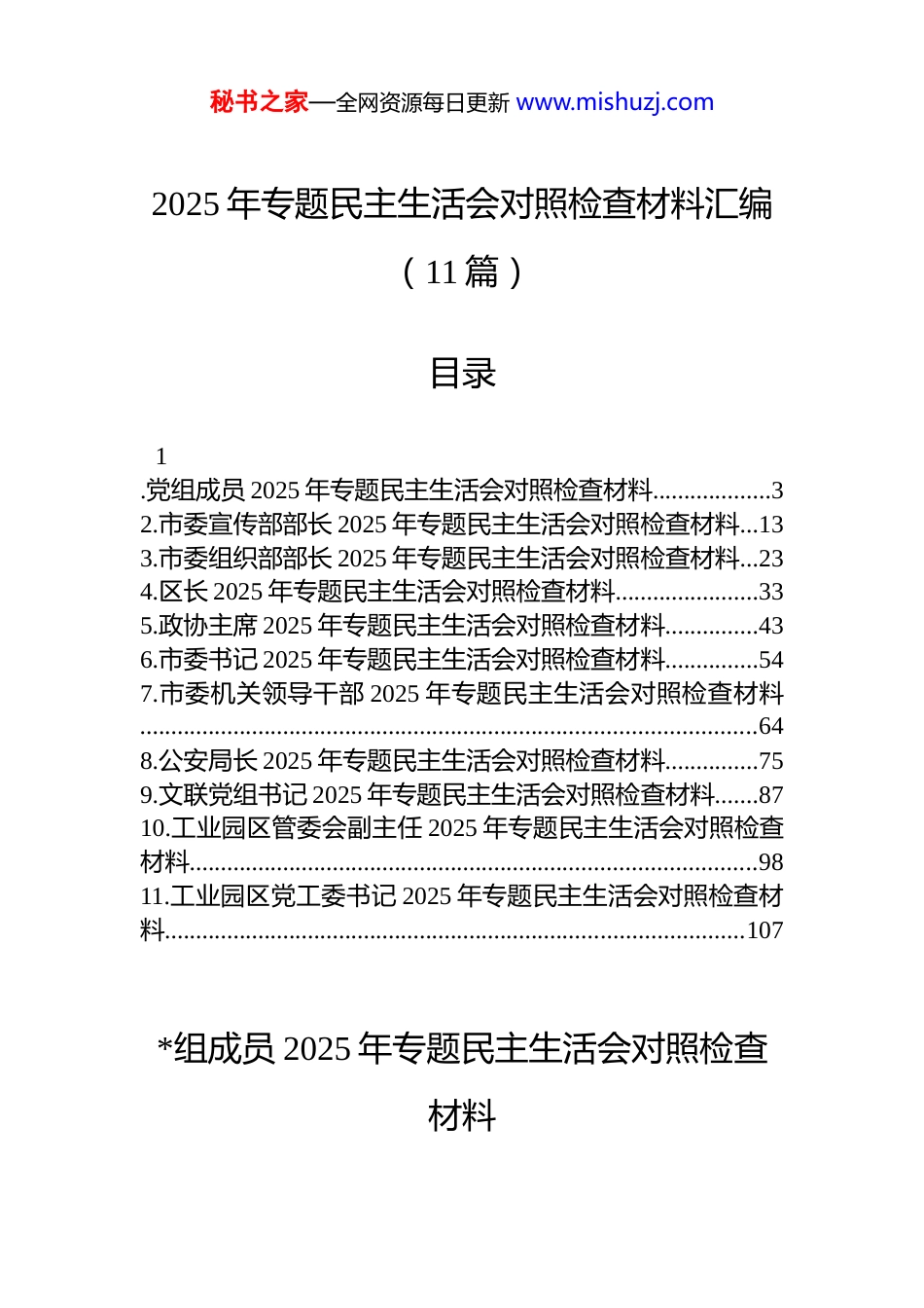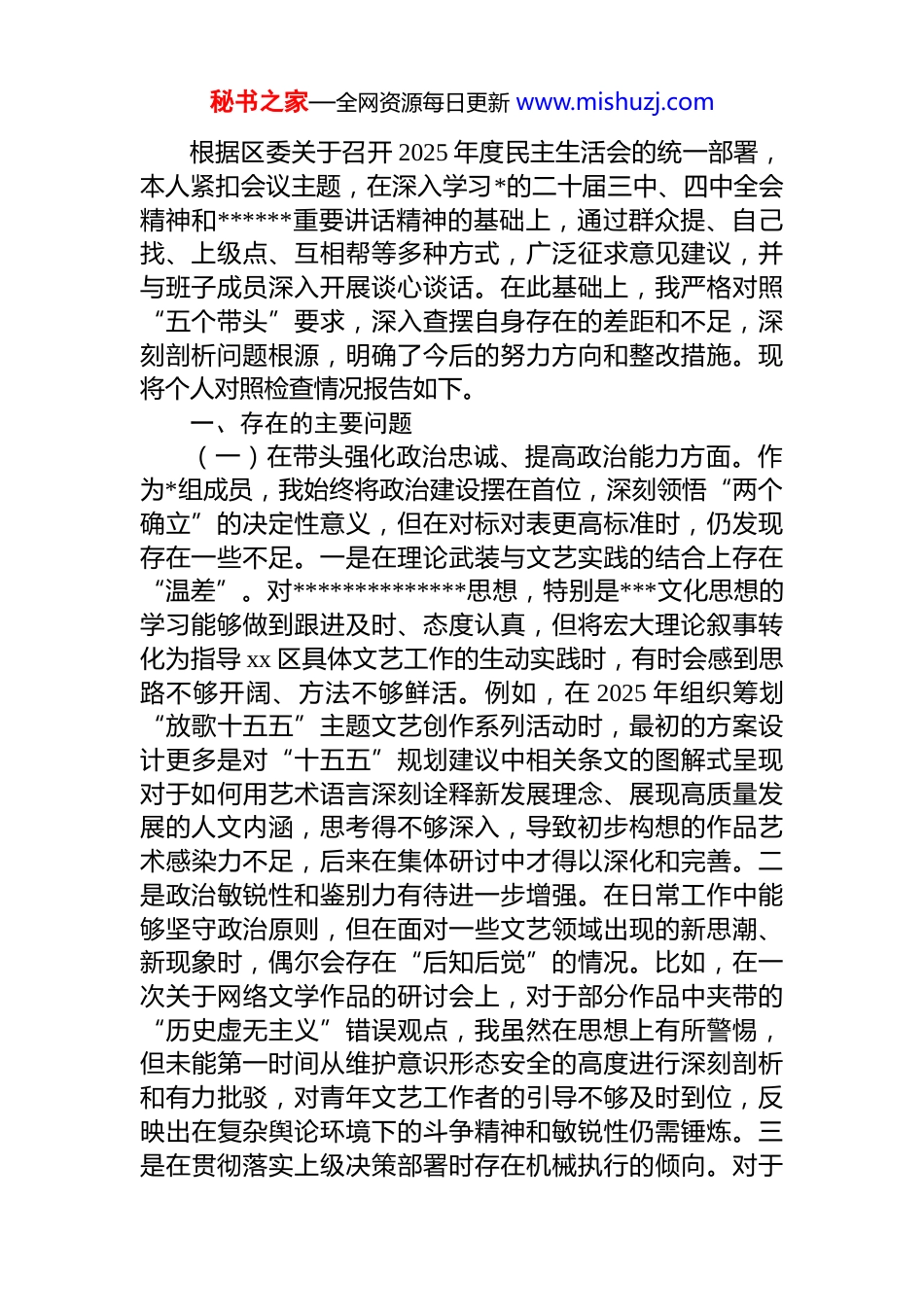 秘书之家—全网资源每日更新 www.mishuzj.com2025 年专题民主生活会对照检查材料汇编(11 篇)目录1.党组成员 2025 年专题民主生活会对照检查材料...................32.市委宣传部部长 2025 年专题民主生活会对照检查材料...133.市委组织部部长 2025 年专题民主生活会对照检查材料...234.区长 2025 年专题民主生活会对照检查材料.......................335.政协主席 2025 年专题民主生活会对照检查材料...............436.市委书记 2025 年专题民主生活会对照检查材料...............547.市委机关领导干部 2025 年专题民主生活会对照检查材料...................................................................................................648.公安局长 2025 年专题民主生活会对照检查材料...............759.文联党组书记 2025 年专题民主生活会对照检查材料.......8710.工业园区管委会副主任 2025 年专题民主生活会对照检查材料...........................................................................................9811.工业园区党工委书记 2025 年专题民主生活会对照检查材料.............................................................................................107*组成员 2025 年专题民主生活会对照检查材料秘书之家—全网资源每日更新 www.mishuzj.com根据区委关于召开 2025 年度民主生活会的统一部署,本人紧扣会议主题,在深入学习*的二十届三中、四中全会精神和******重要讲话精神的基础上,通过群众提、自己找、上级点、互相帮等多种方式,广泛征求意见建议,并与班子成员深入开展谈心谈话。在此基础上,我严格对照“五个带头”要求,深入查摆自身存在的差距和不足,深刻剖析问题根源,明确了今后的努力方向和整改措施。现将个人对照检查情况报告如下。一、存在的主要问题(一)在带头强化政治忠诚、提高政治能力方面。作为*组成员,我始终将政治建设摆在首位,深刻领悟“两个确立”的决定性意义,但在对标对表更高标准时,仍发现存在一些不足。一是在理论武装与文艺实践的结合上存在“温差”。对**************思想,特别是***文化思想的学习能够做到跟进及时、态度认真,但将宏大理论叙事转化为指导 xx 区具体文艺工作的生动实践时,有时会感到思路不够开阔、方法不够鲜活。例如,在 2025 年组织筹划“放歌十五五”主题文艺创作系列活动时,最初的方案设计更多是对“十五五”规划建议中相关条文的图解式呈现对于如何用艺术语言深刻诠释新发展理念、展现高质量发展的人文内涵,思考得不够深入,导致初步构想的作品艺术感染力不足,后来在集体研讨中才得以深化和完善。二是政治敏锐性和鉴别力有待进一步增强。在日常工作中能够坚守政治原则,但在面对一些文艺领域出现的新思潮、新现象时,偶尔会存在“后知后觉”的情况。比如,在一次关于网络文学作品的研讨会上,对于部分作品中夹带的“历史虚无主义”错误观点,我虽然在思想上有所警惕,但未能第一时间从维护意识形态安全的高度进行深刻剖析和有力批驳,对青年文艺工作者的引导不够及时到位,反映出在复杂舆论环境下的斗争精神和敏锐性仍需锤炼。三是在贯彻落实上级决策部署时存在机械执行的倾向。对于秘书之家—全网资源每日更新 www.mishuzj.com上级文联和区委区政府的工作部署,能够做到不折不扣地执行,但在结合 xx 区文艺工作实际、创造性地开展工作方面,主动性和创新性尚有欠缺。例如,在落实“文艺两新”群体的团结引领工作时,我更多地是按照上级文件要求,完成了建立联系台账、组织常规座谈等“规定动作”但在如何针对他们思想活跃、流动性强的特点,设计更具吸引力和凝聚力的活动载体方面,探索不够深入,导致工作的实际效果与预期目标存在一定差距。(二)在带头固本培元、增强*性方面。我始终注重加强*性修养,但反躬自省,发现自己在“内功”修炼上还存在薄弱环节,*性锤炼的自觉性和彻底性有待提高。一是*性分析的深刻性不足。在参加组织生活时,能够坦诚地进行自我批评,但有时对问题的剖析习惯于从工作层面找原因,未能真正做...